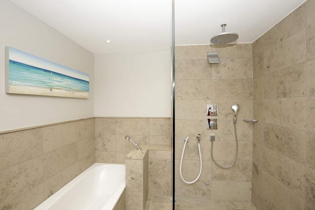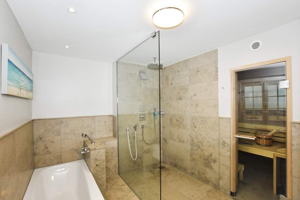 Im Untergeschoss befinden sich ein komfortables Schlafzimmer mit Doppelbett in Übergröße (2,00 x 2,00 m, Einzelmatratzen) und ein großzügiges Badezimmer mit Dusche, Badewanne, Sauna, Waschtisch, Handtuchtrockner, Fön und WC mit Geruchabsaugung