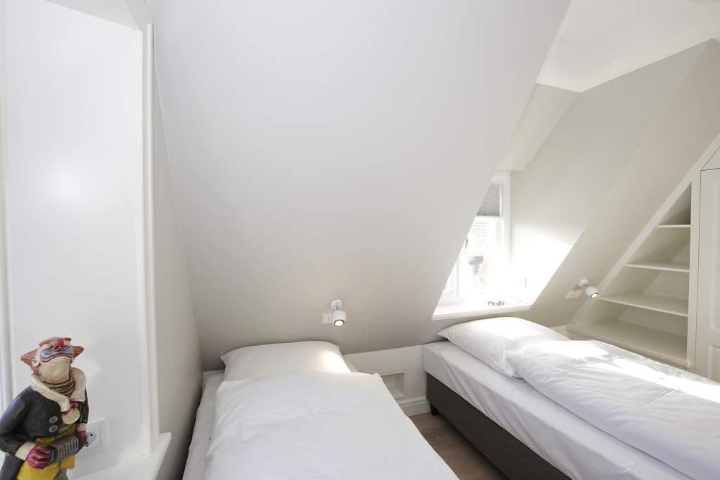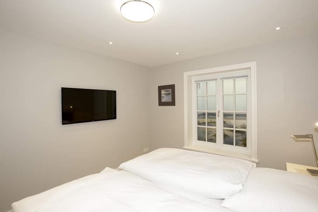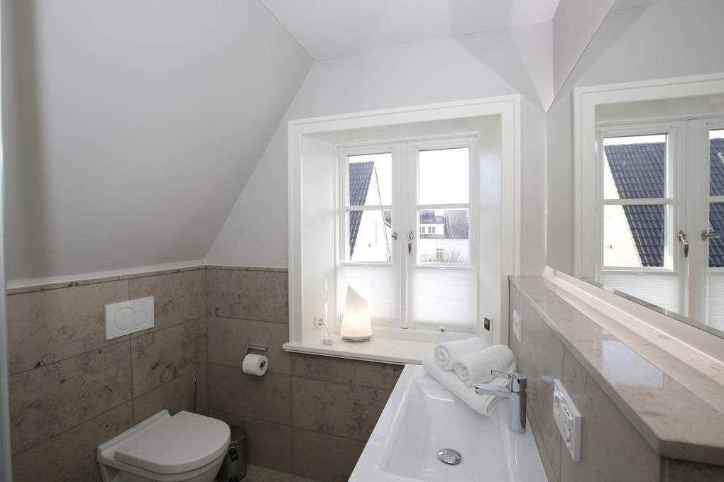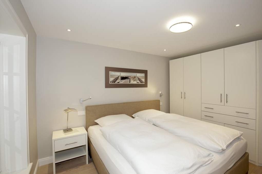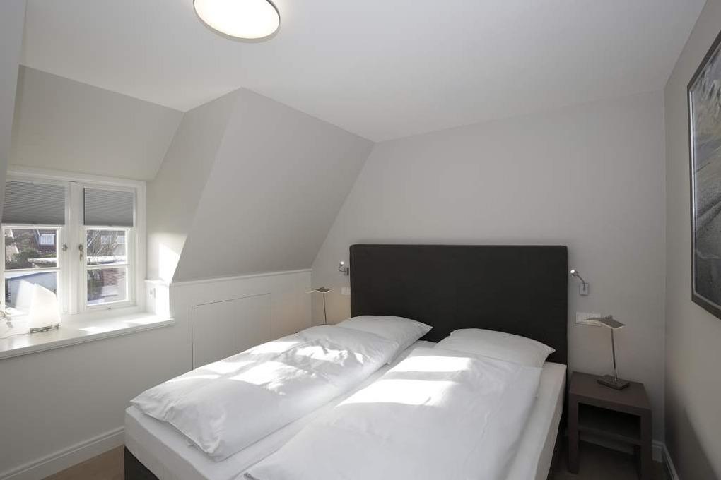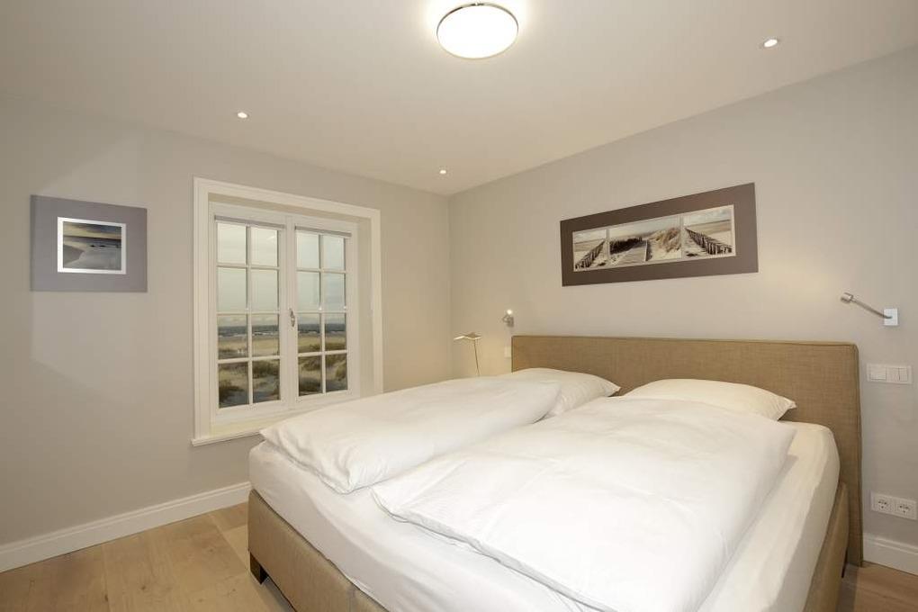 Im Obergeschoss gelangt man über den Flur mit Sekretär (mit Blick über Westerland bis hin zu den Dünen) in zwei weitere hochwertige Schlafzimmer mit Doppelbetten (1,80 x 2,00 m, Einzelmatratzen) und ein weiteres Badezimmer mit Dusche, Waschtisch, Handtuchtrockner, Fön und WC mit Geruchabsaugung.
