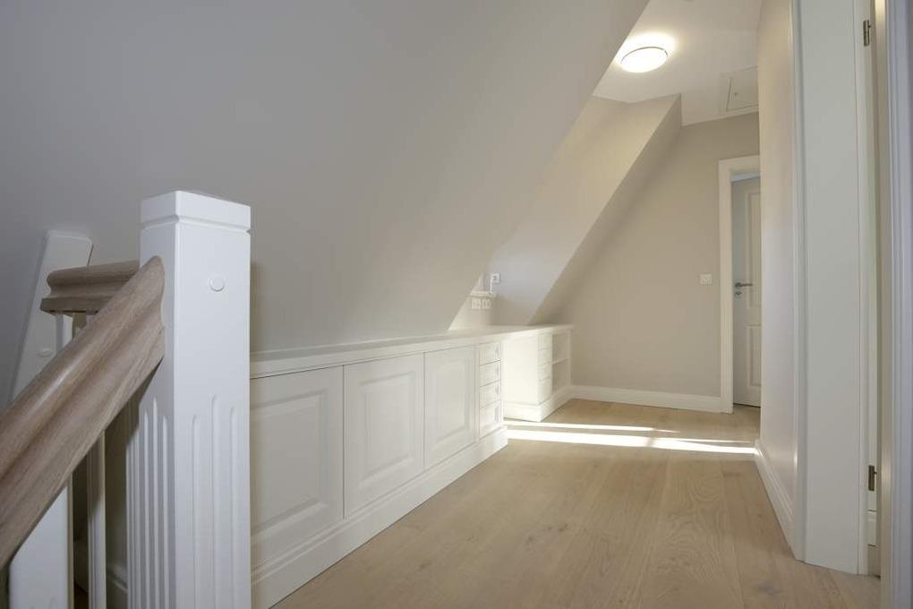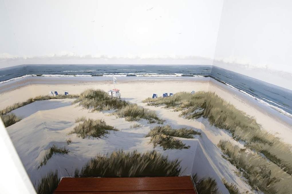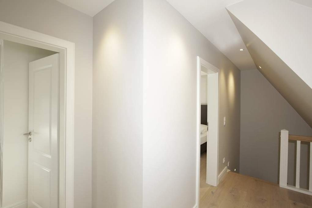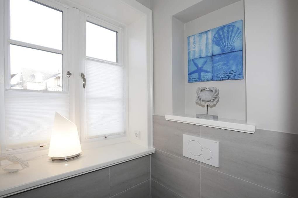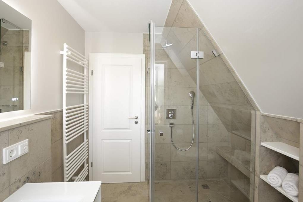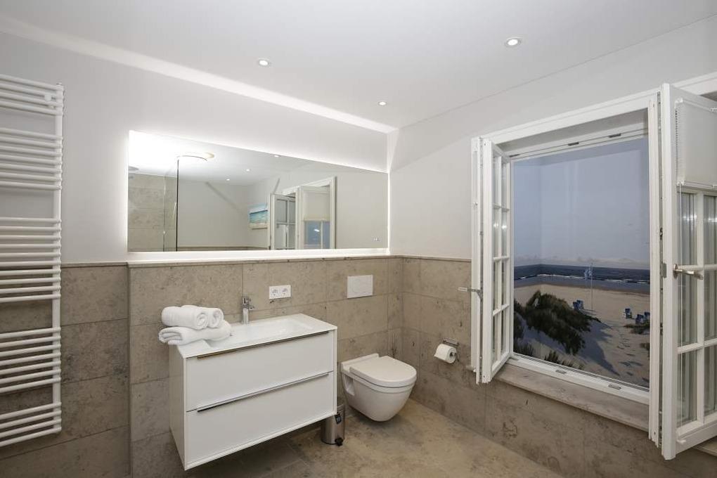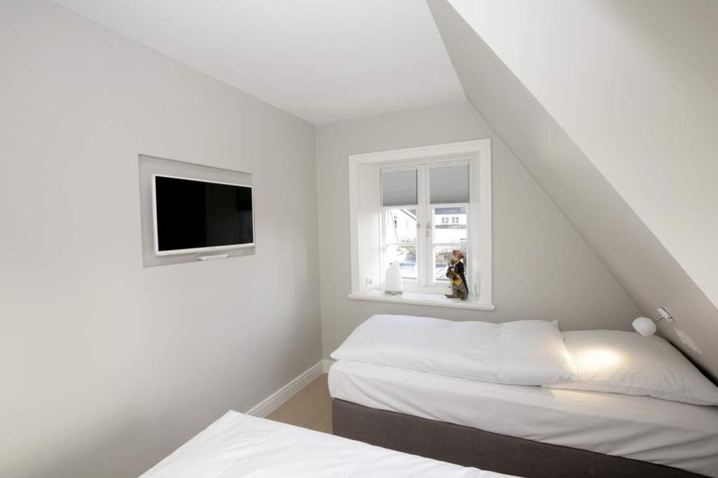 Im Obergeschoss gelangt man über den Flur mit Sekretär (mit Blick über Westerland bis hin zu den Dünen) in zwei weitere hochwertige Schlafzimmer mit Doppelbetten (1,80 x 2,00 m, Einzelmatratzen) und ein weiteres Badezimmer mit Dusche, Waschtisch, Handtuchtrockner, Fön und WC mit Geruchabsaugung.