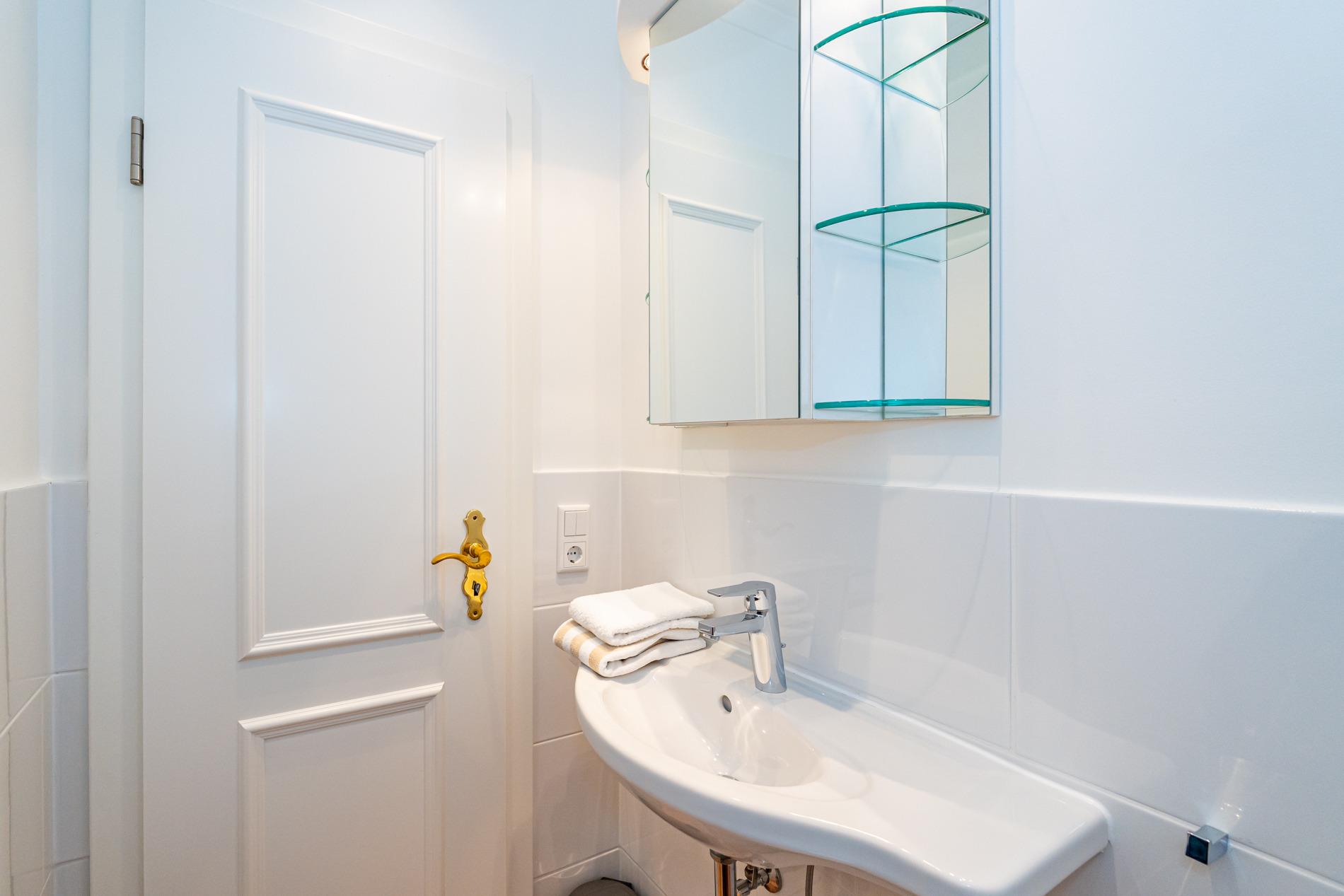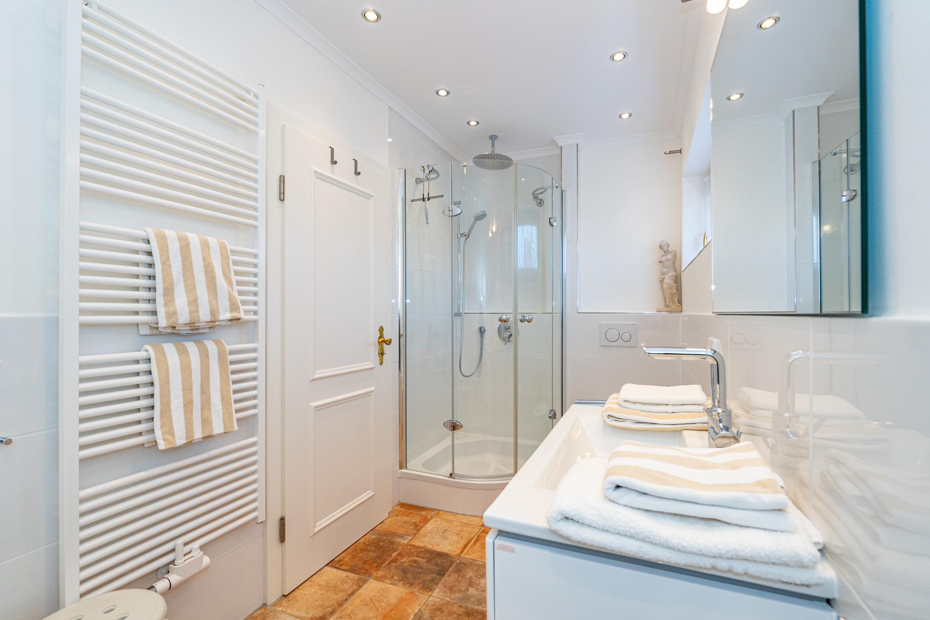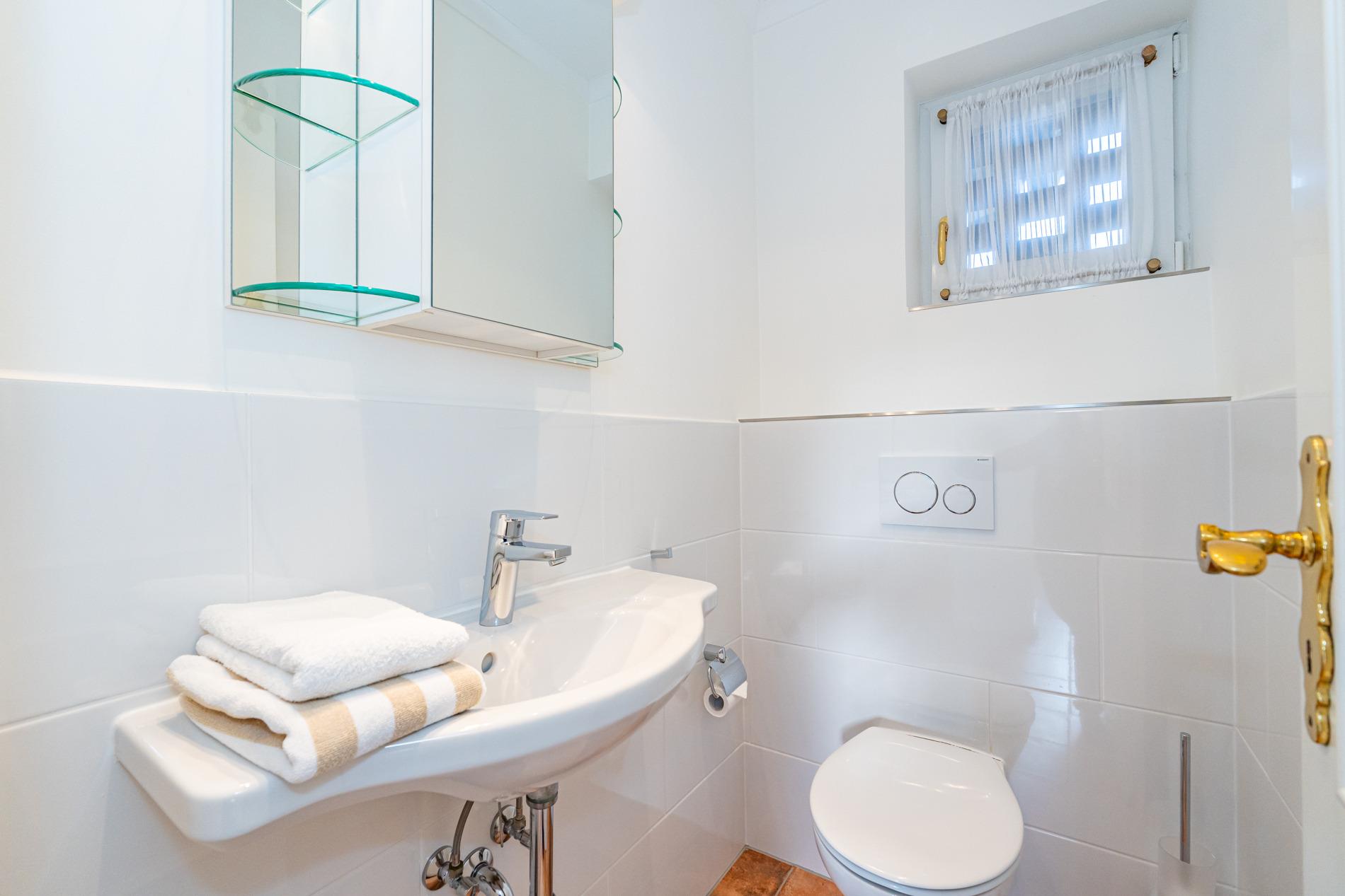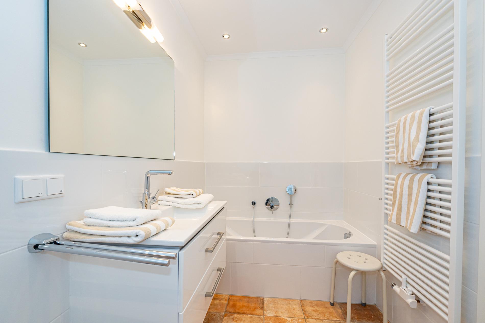 Zudem hat man vom Wohnraum Zugang in das komplett ausgestattete Badezimmer (mit Dusche, Badewanne, Waschtisch, Handtuchtrockner, Föhn, WC) und dem separaten Gäste-WC.