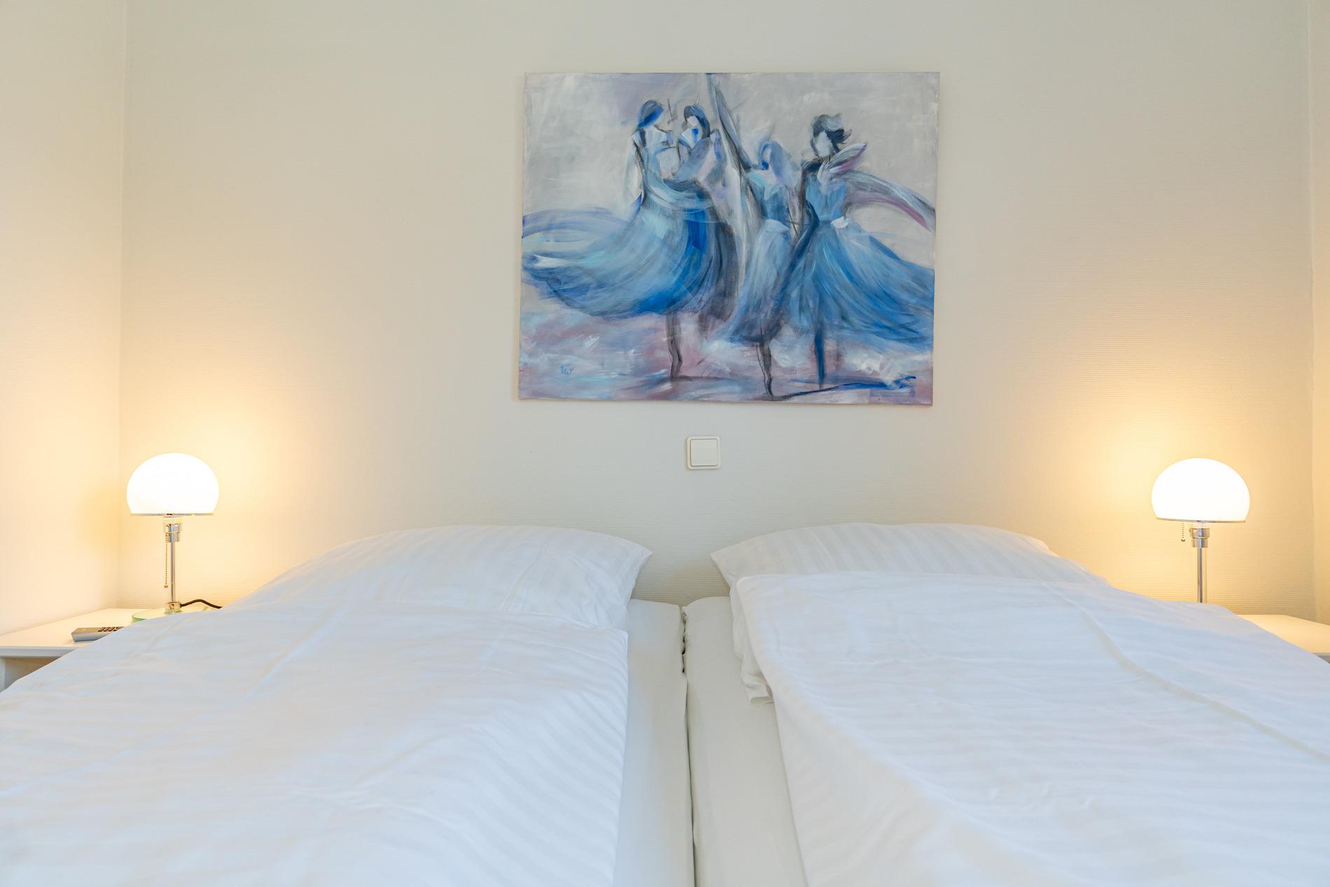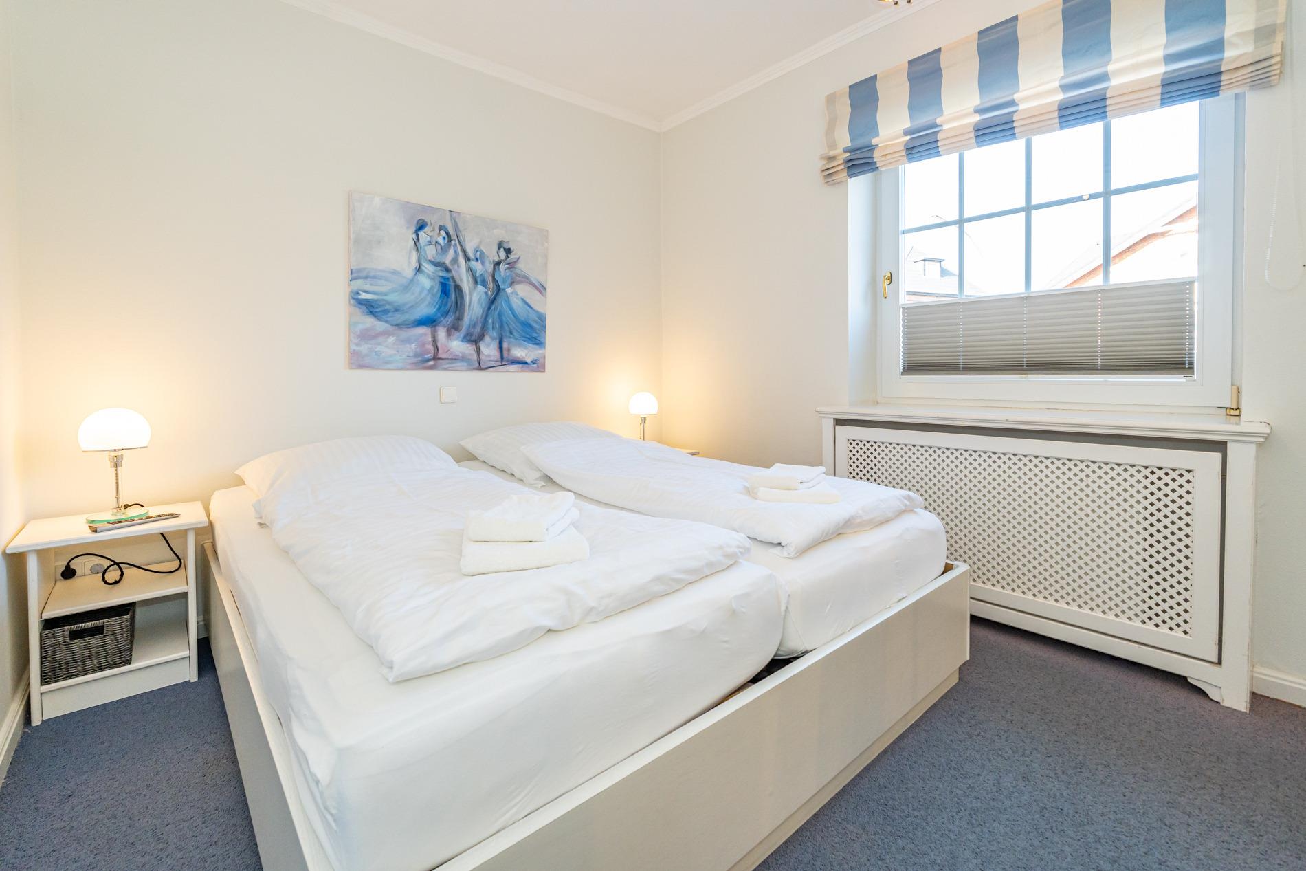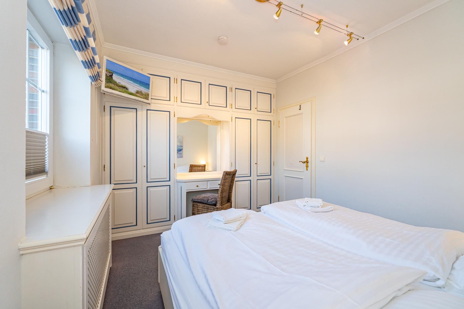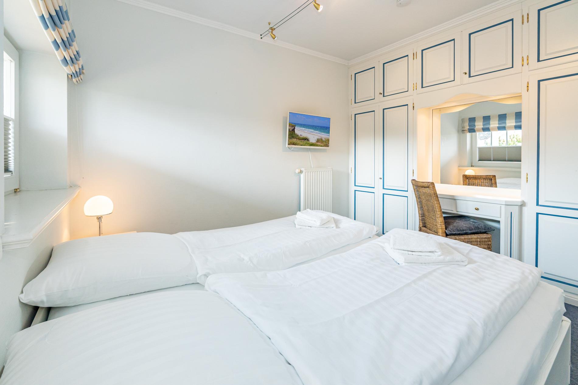 Vom Wohnzimmer gelangt man außerdem in die beiden Schlafzimmer, die jeweils mit guten Doppelbetten (Maß 1,80 x 2 Meter, jeweils mit zwei Einzelmatratzen), Einbauschränken und Kosmetiktischen ausgestattet sind.