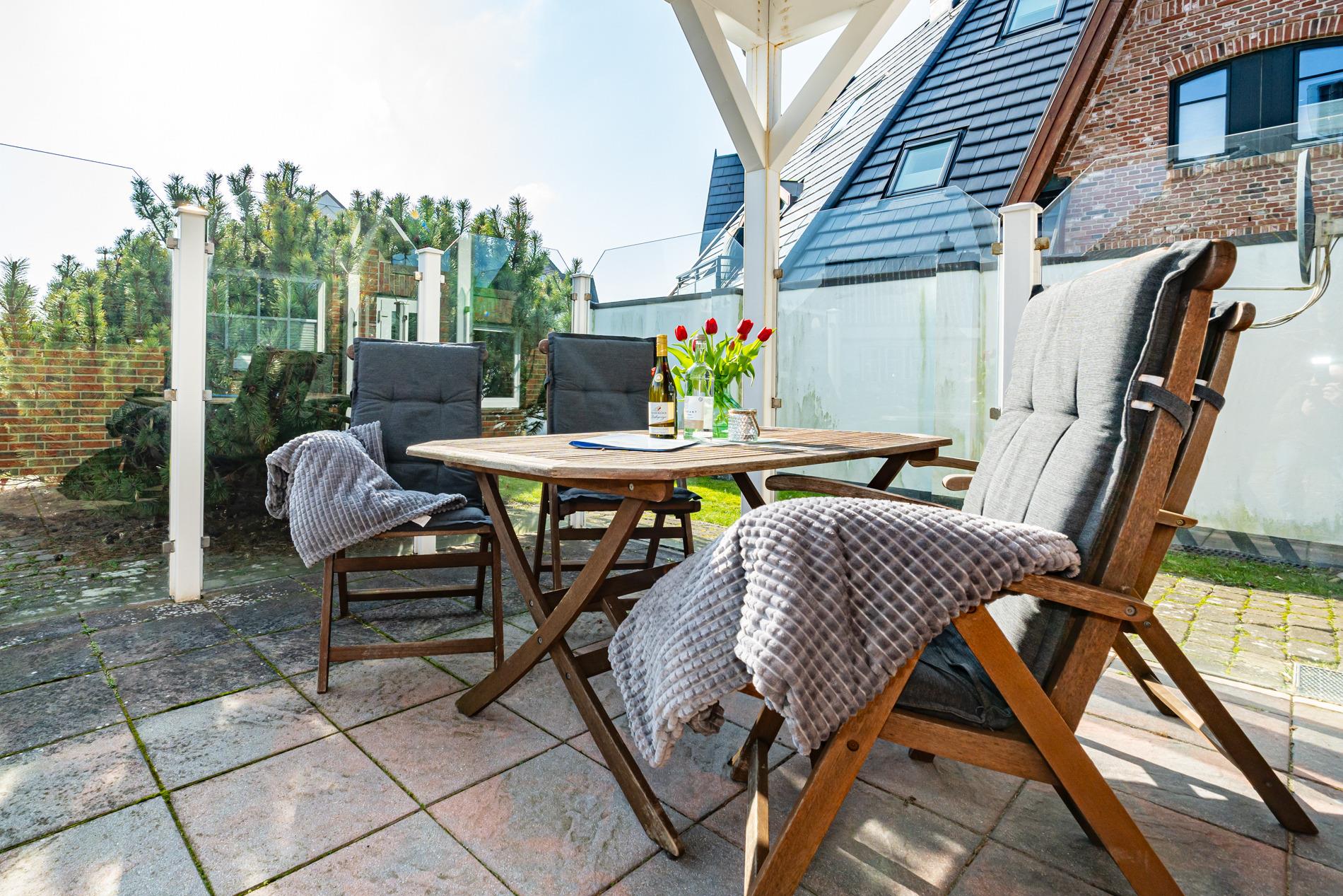 Die zweite, mit einem Friesenwall eingefasste Sonnenterrasse befindet sich separat im Garten und lädt zum Sonnenbaden und relaxen ein.