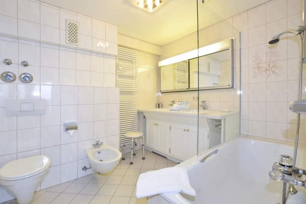 Das großzügige Bad bietet Wellness-Komfort auf hohem Niveau: Ein Doppelwaschtisch, eine Echtglas-Duschvorrichtung in der Badewanne, ein Bidet, ein Handtuchtrockner und ein Fön stehen Ihnen zur Verfügung – geschmackvoll ausgestattet und durchdacht gestaltet.