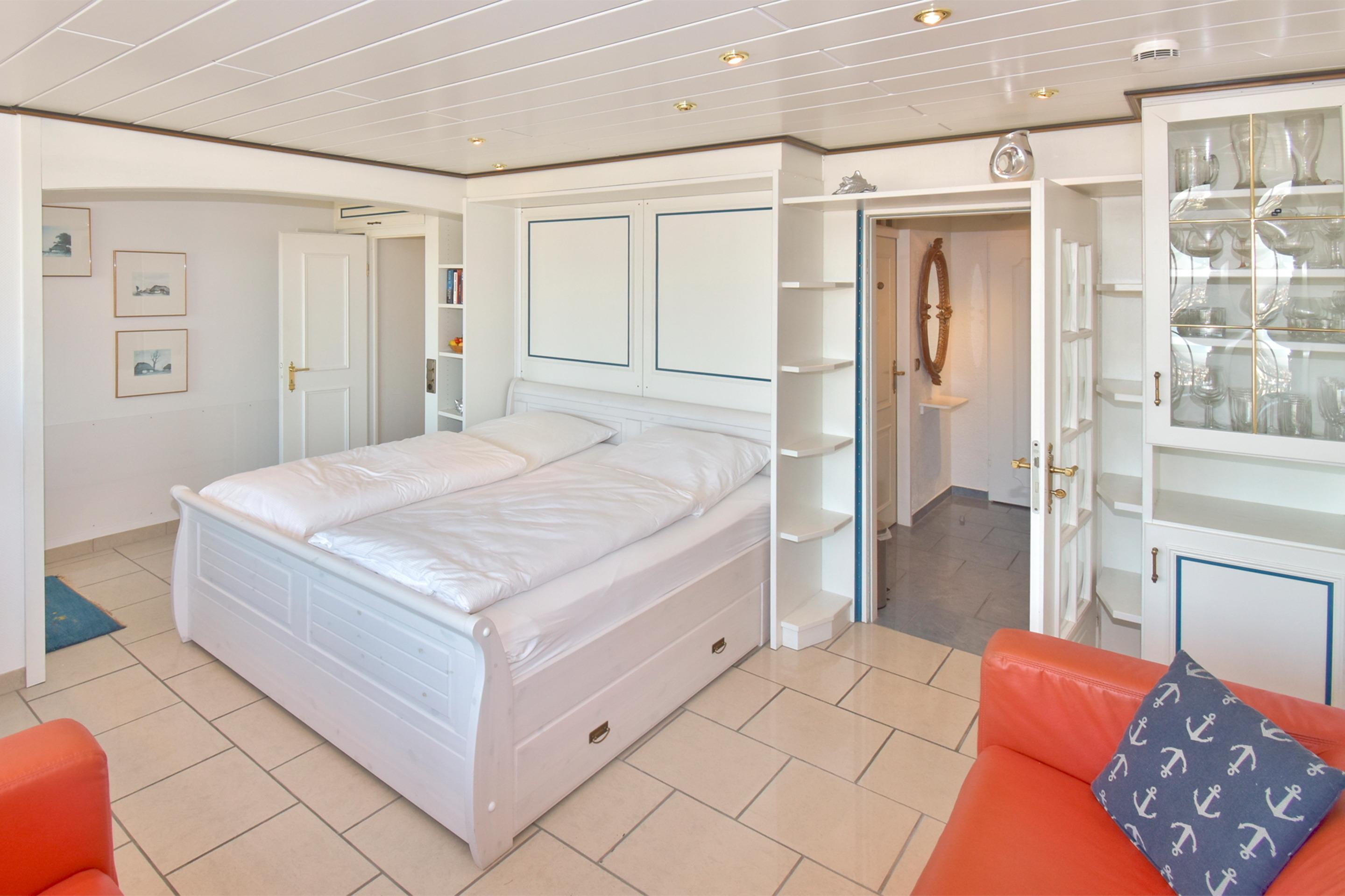 Im hellen Wohn- und Schlafbereich sorgt ein fest installiertes Doppelbett (0,90 x 2,00m - bestehend aus zwei Einzelmatratzen), für erholsame Nächte. Eine stilvolle, rote Leder-Couchgarnitur, ein separater Essplatz direkt am Fenster, ein großer Flachbildfernseher, sowie ein begehbarer Kleiderschrank runden das Ambiente perfekt ab. Der direkte Zugang zum Ostbalkon ermöglicht zusätzlichen Raum für entspannte Stunden.