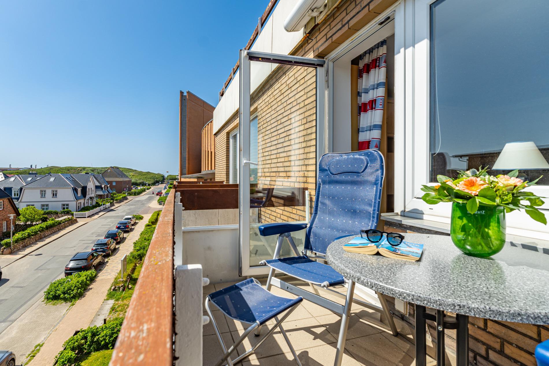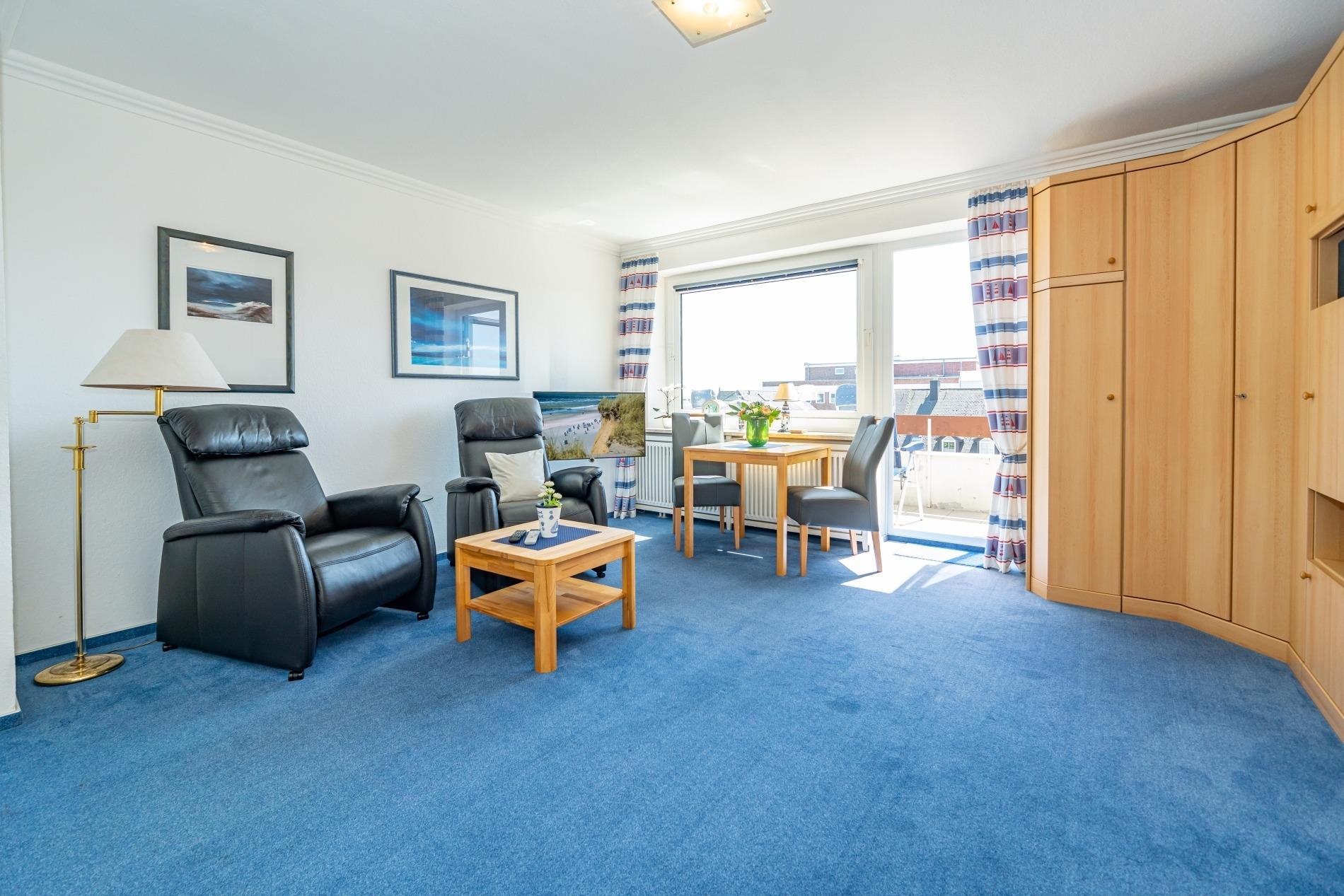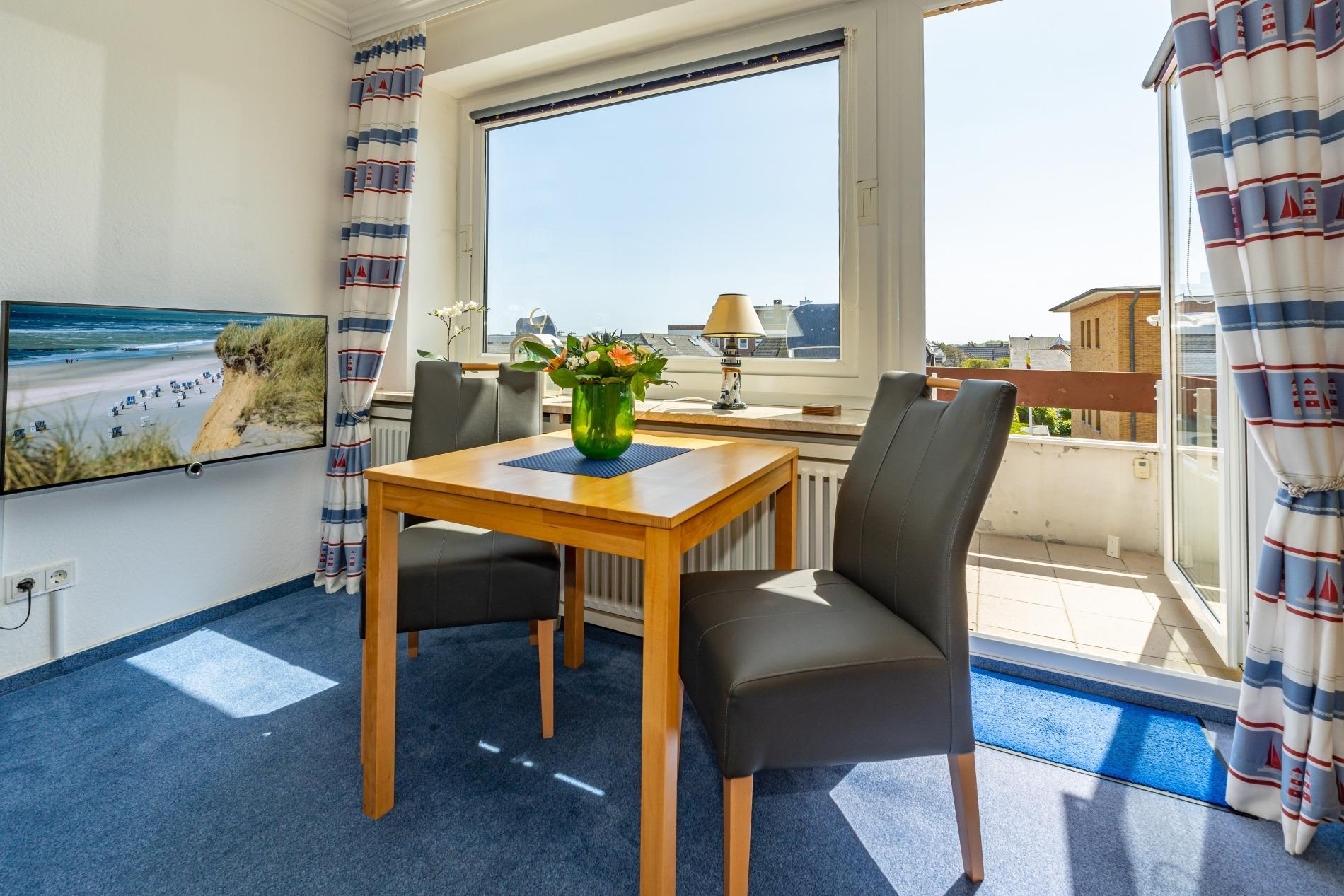 Gemütliche 1-Zimmer-Ferienwohnung mit Südbalkon und Einzelgarage in Westerland, ideal für 2 Personen und Haustiere willkommen.