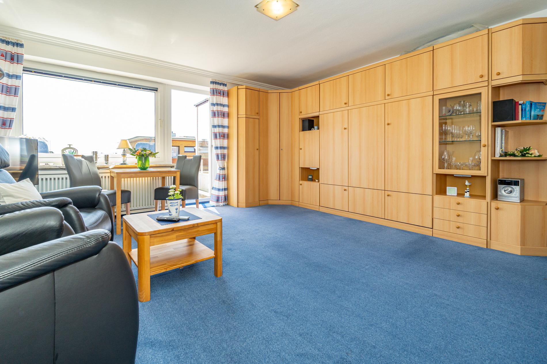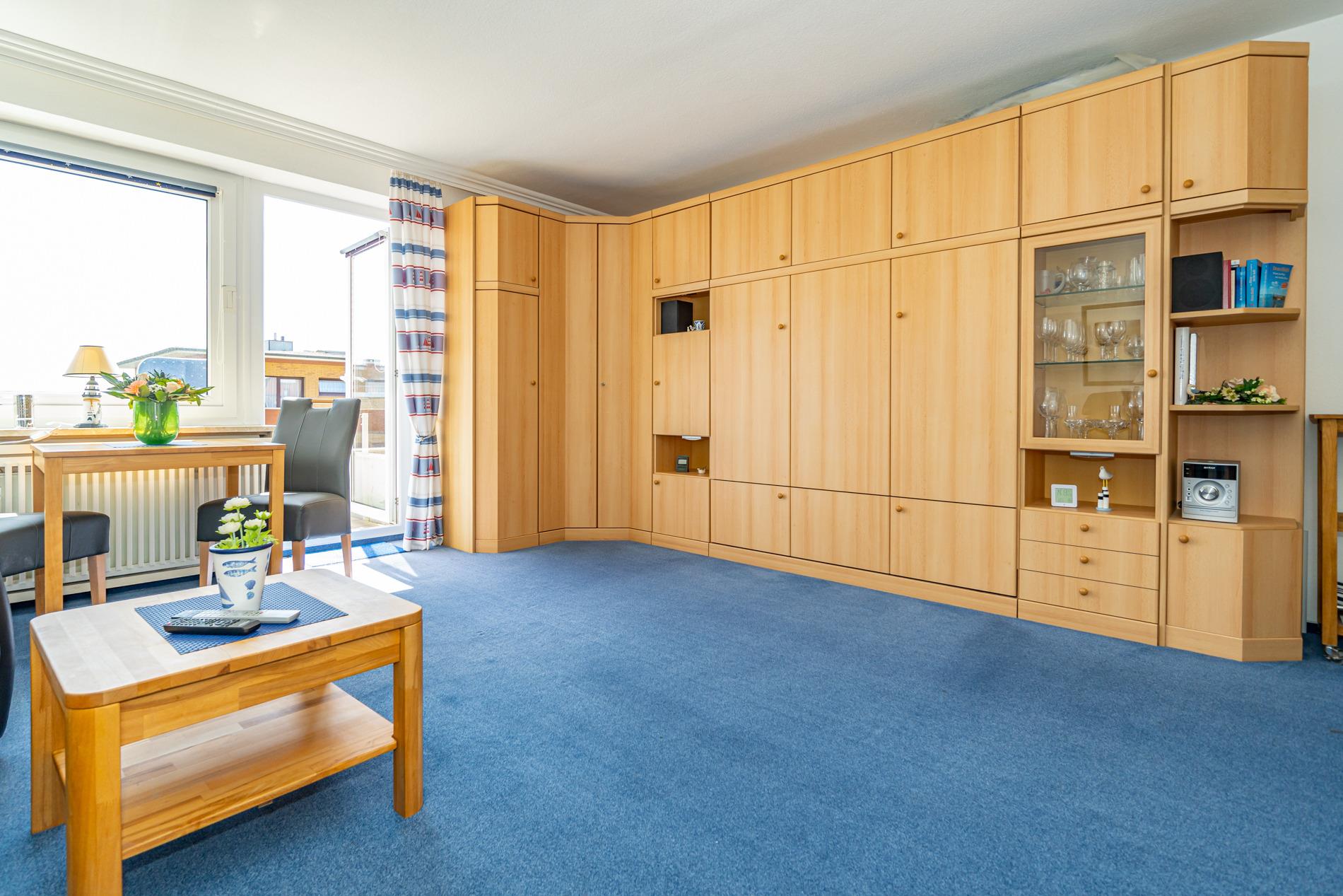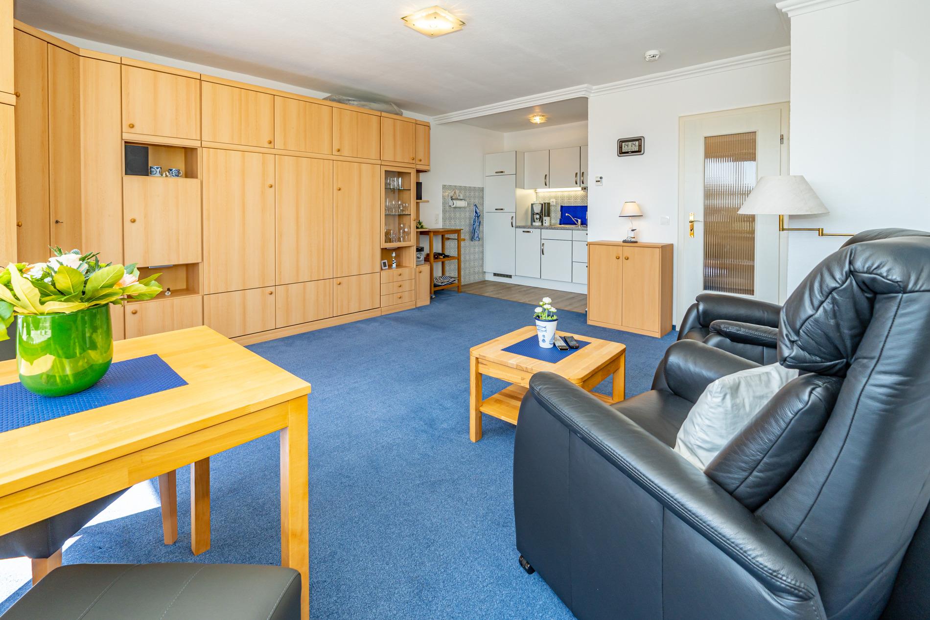 Der Wohn-/Schlafraum ist mit 2 gemütlichen Liegesesseln, einem Essplatz direkt am Fenster, einem Doppelschrankbett (Liegefläche 1,60 x 2 m mit Einzelmatratzen, als Ganzes ausklappbar), Kabel-Flachbild-TV, Radio und kostenlosem Internetnutzung per W-Lan ausgestattet.