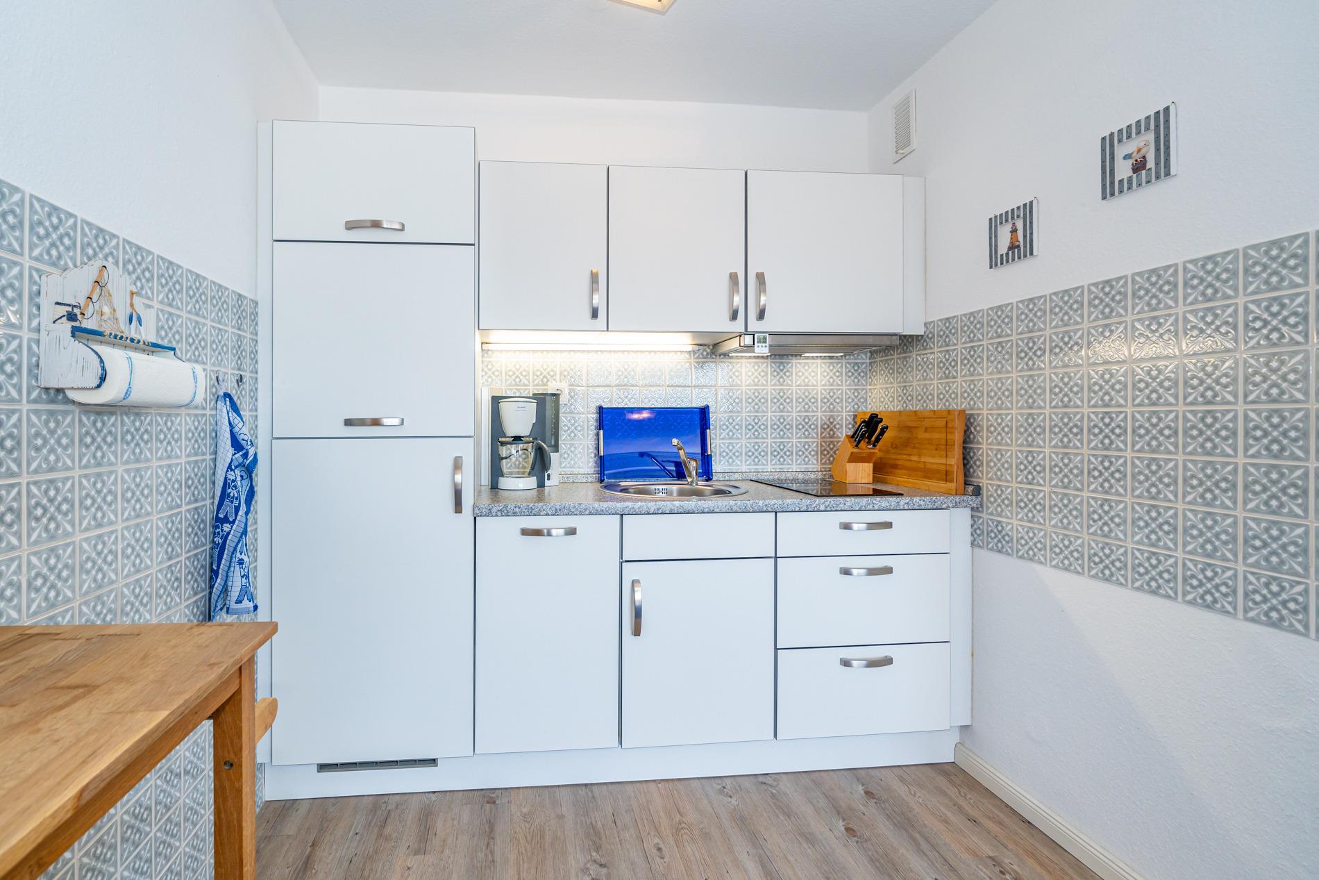 Die offene Einbauküche besitzt einen Geschirrspüler, eine Mikrowelle mit Grillfunktion und Cerankochfeld (2 Felder) sowie einen Kühlschrank mit Gefrierfach. Kaffeemaschine, Wasserkocher und Toaster gehören zur Grundausstattung.