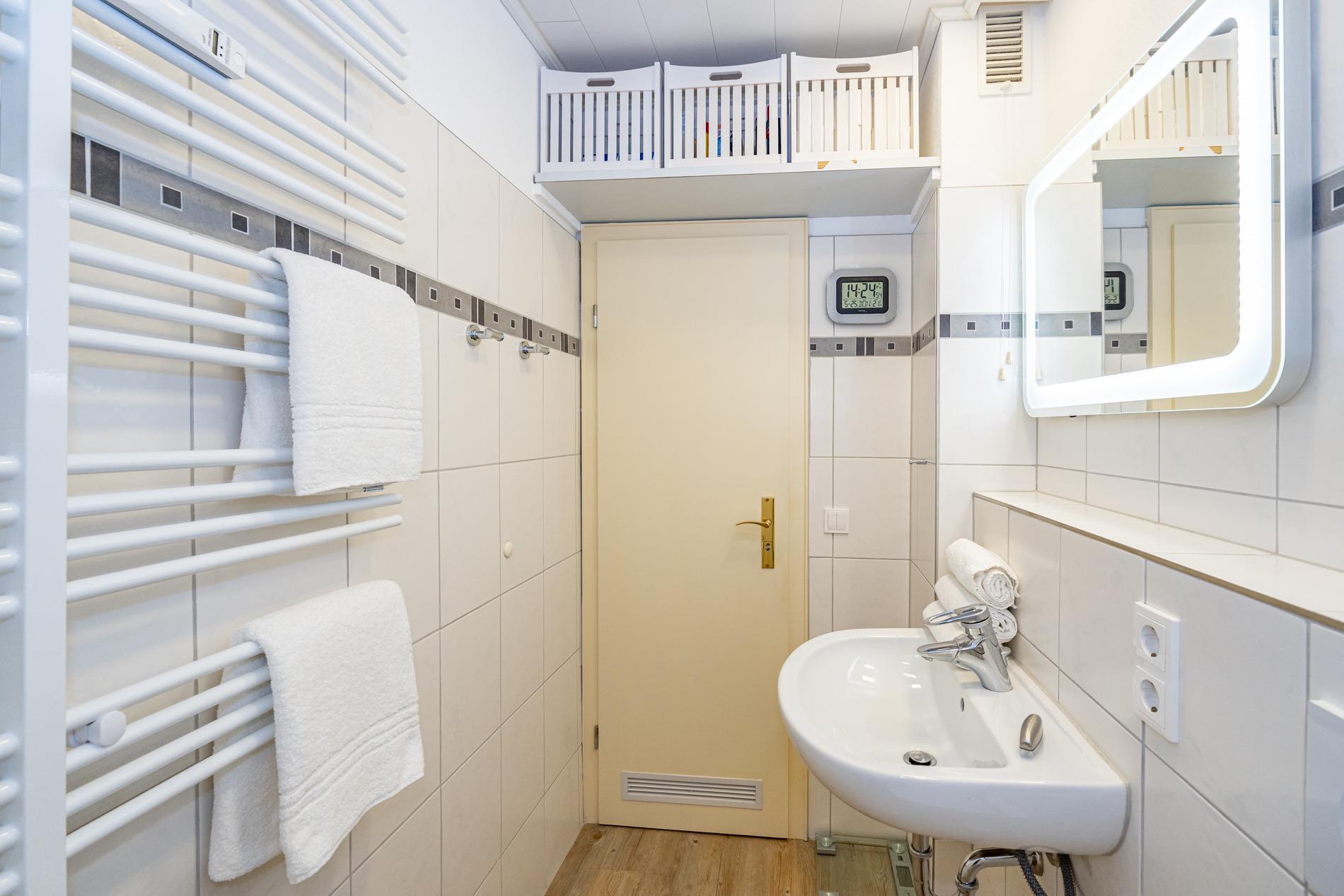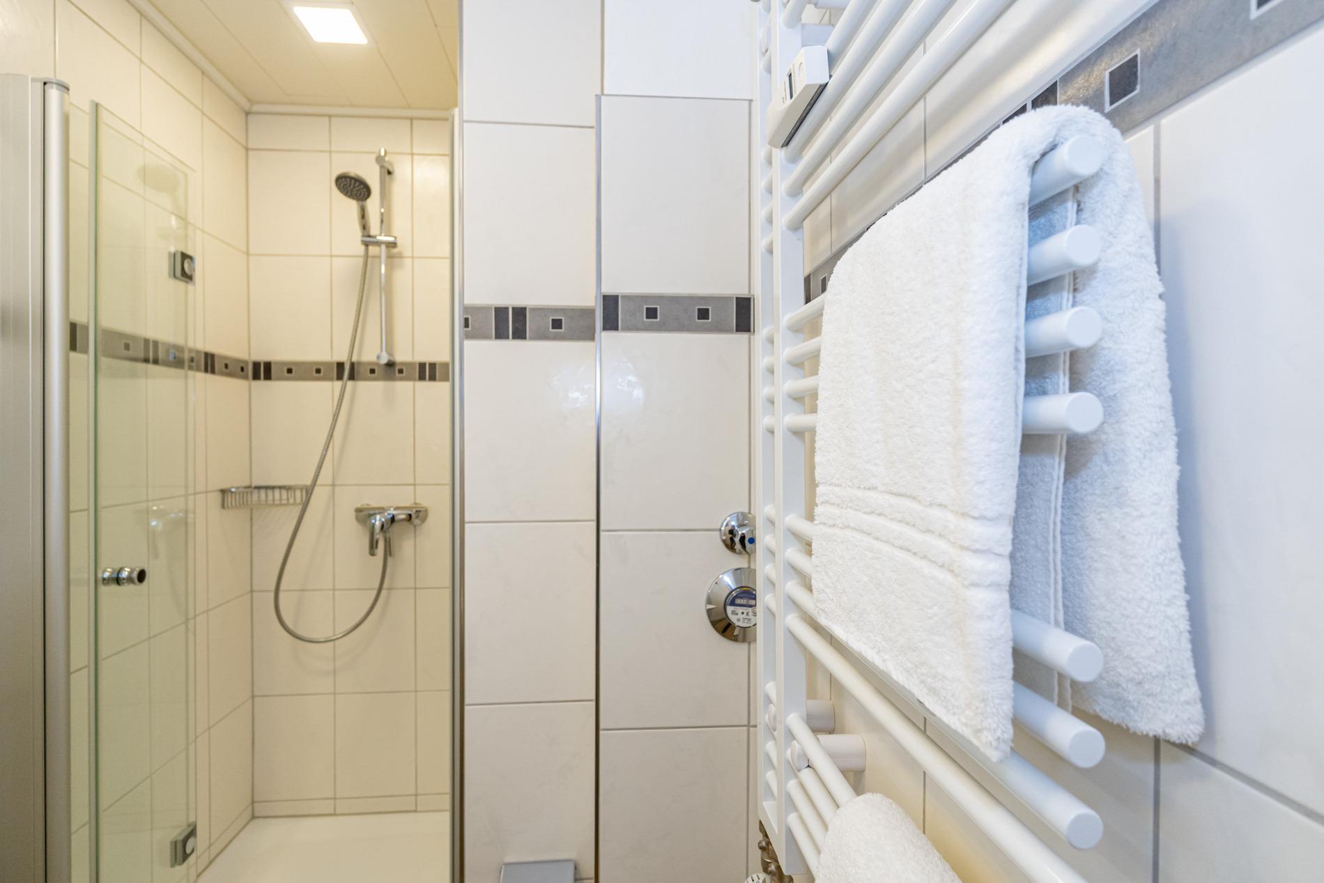 Das helle Duschbad hat eine Dusche, ein WC, einen Waschtisch sowie Handtuchtrockner.
