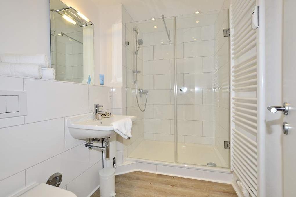 Das neue helle Duschbad ist mit einem Waschtisch, Handtuchtrockner, Dusche mit extraflachem Einstieg und WC ausgestattet.