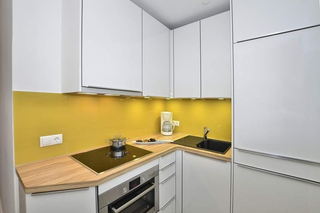 Die neue moderne Küche mit Fenster hat einen Geschirrspüler, einen Induktionsherd mit Backofen und Ceranfeld, eine Mikrowelle und einen Kühlschrank mit 3-Sterne-Gefrierfach. Kaffeemaschine, Wasserkocher und Toaster gehören zur Grundausstattung.
