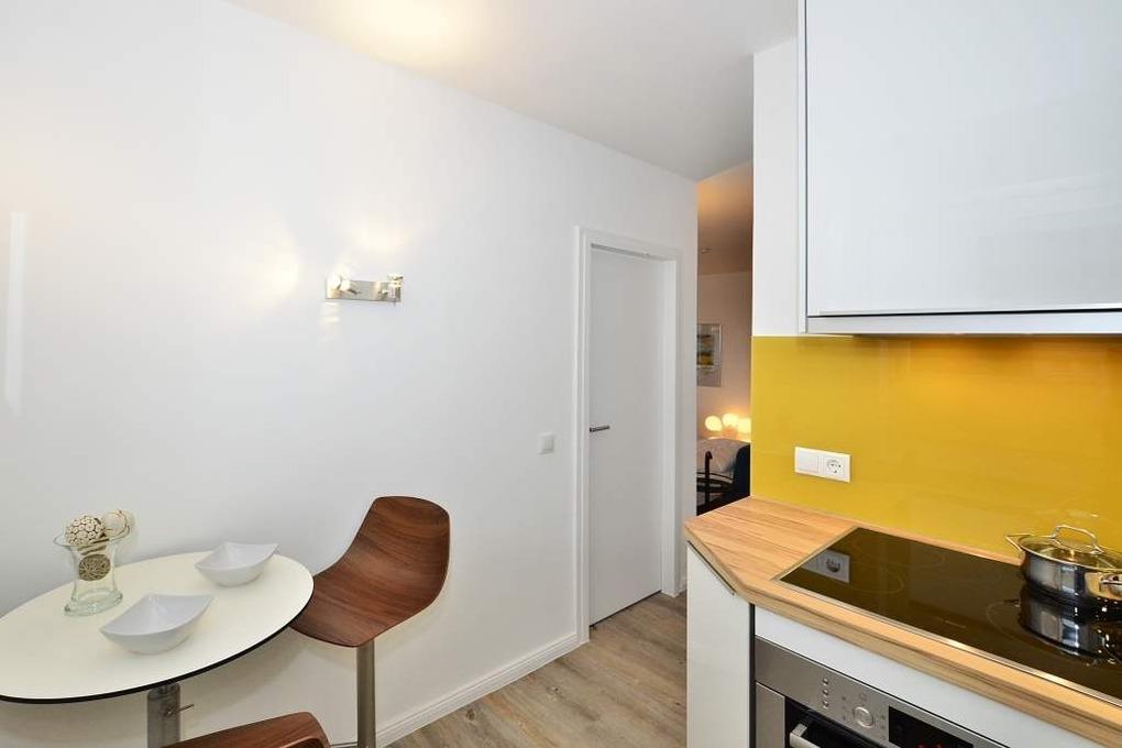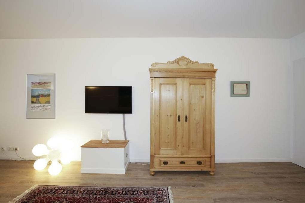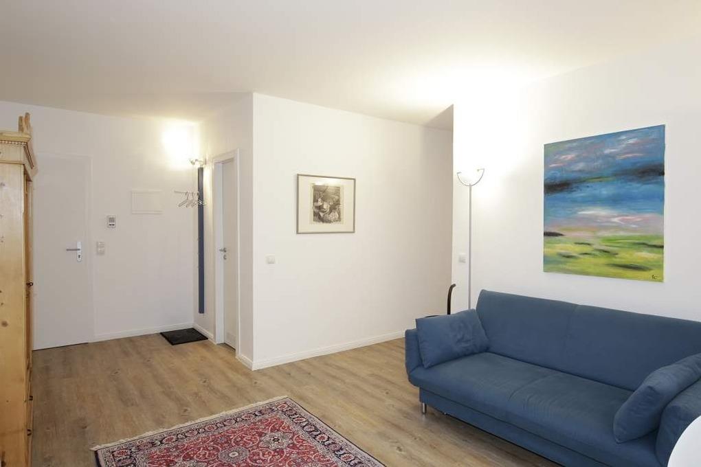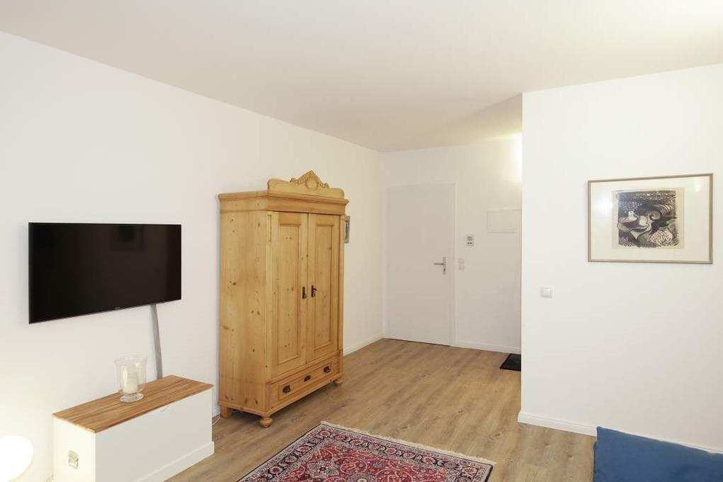 Die moderne Ferienwohnung besteht aus einem großzügigen Wohnraum mit einer Sitzgarnitur (Zweisitzer-Couch mit Schlaffunktion), einem Essplatz, Kabel-Flachbild-TV.
