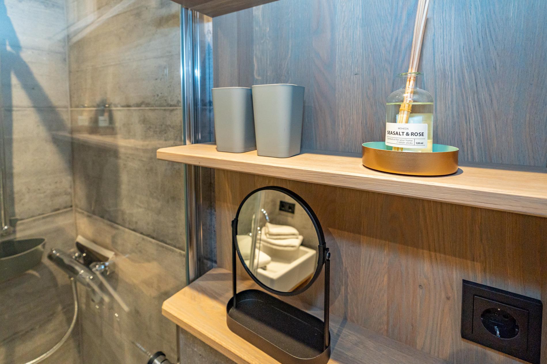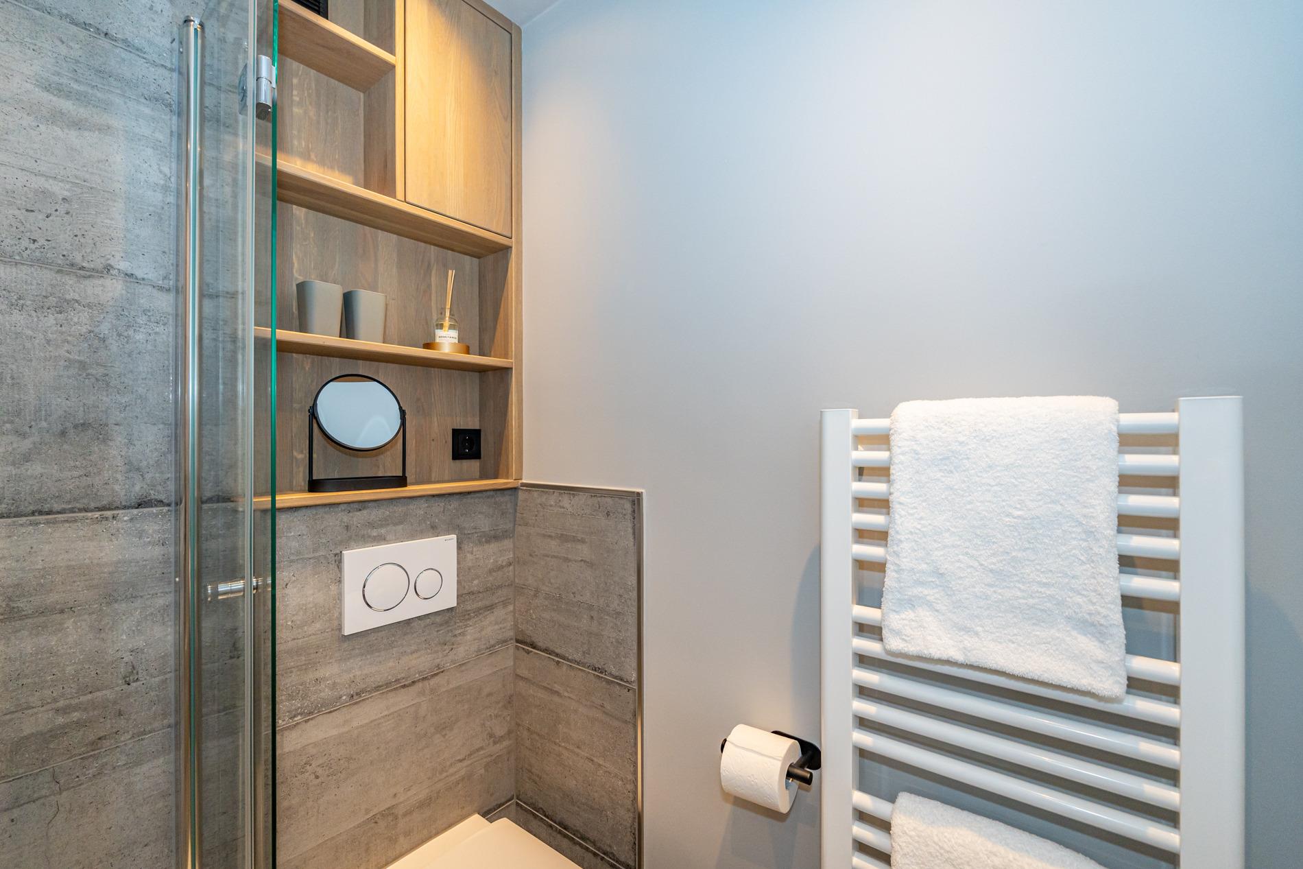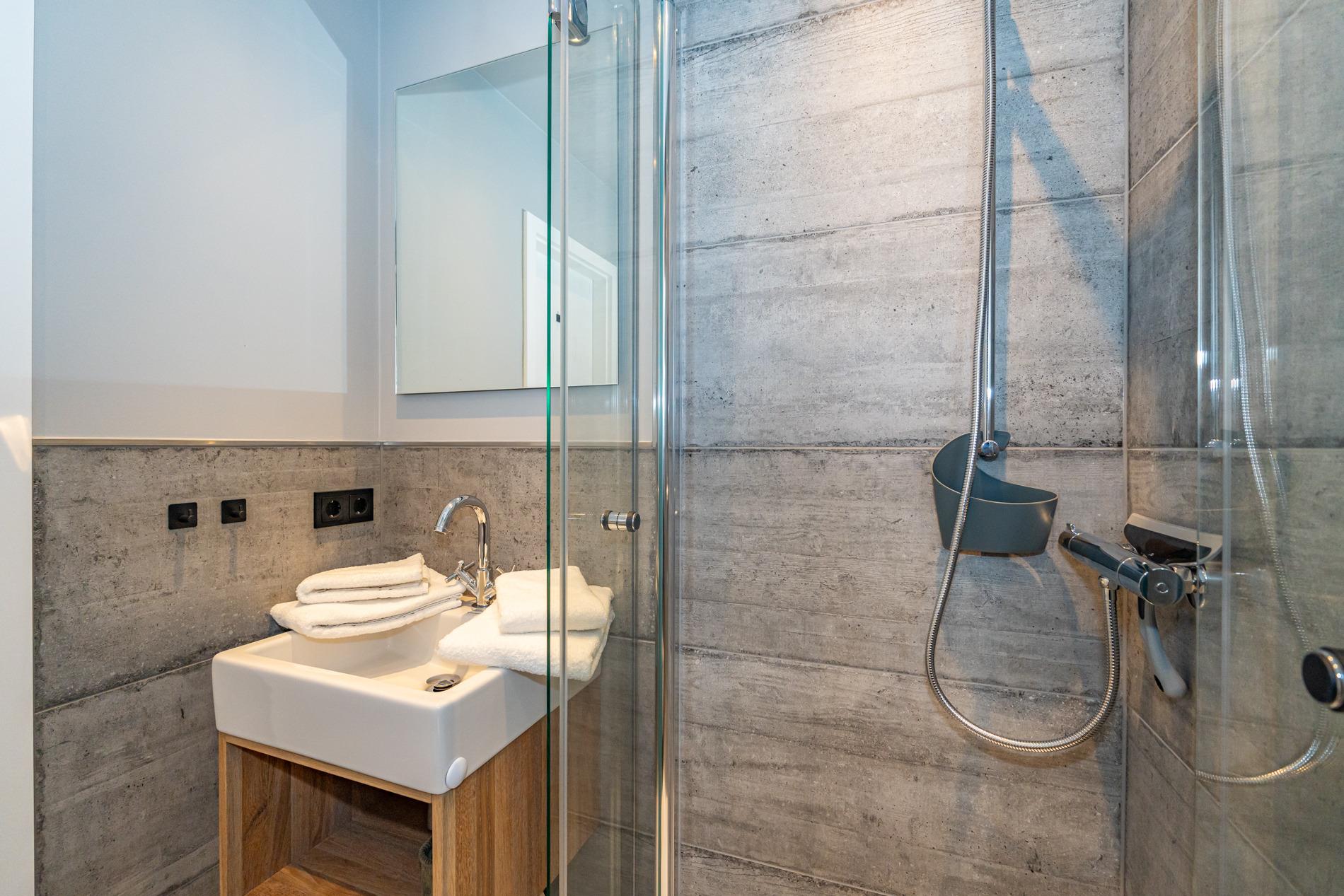 Das moderne Badezimmer ist mit einer extraflachen Dusche, Waschtisch, Handtuchtrockner, Fön, Kosmetikspiegel und WC ausgestattet.