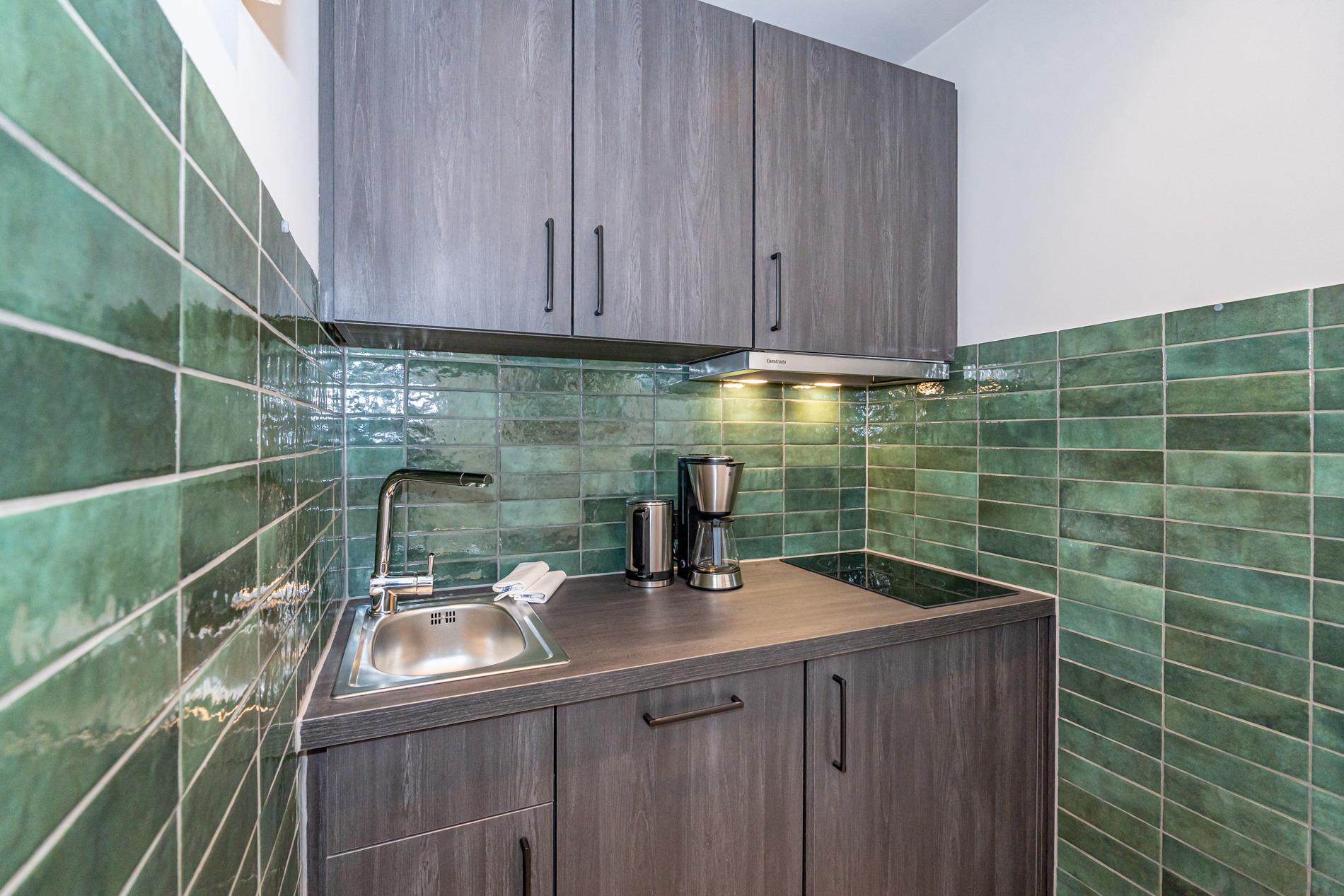 Die offene Einbauküche in der Diele besitzt einen Geschirrspüler, ein Cerankochfeld und einen Kühlschrank mit 3-Sterne-Gefrierfach. Kaffeemaschine, Wasserkocher und Toaster gehören zur Grundausstattung.
