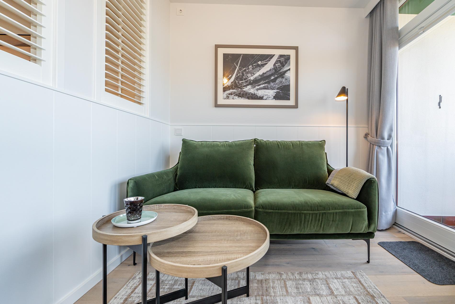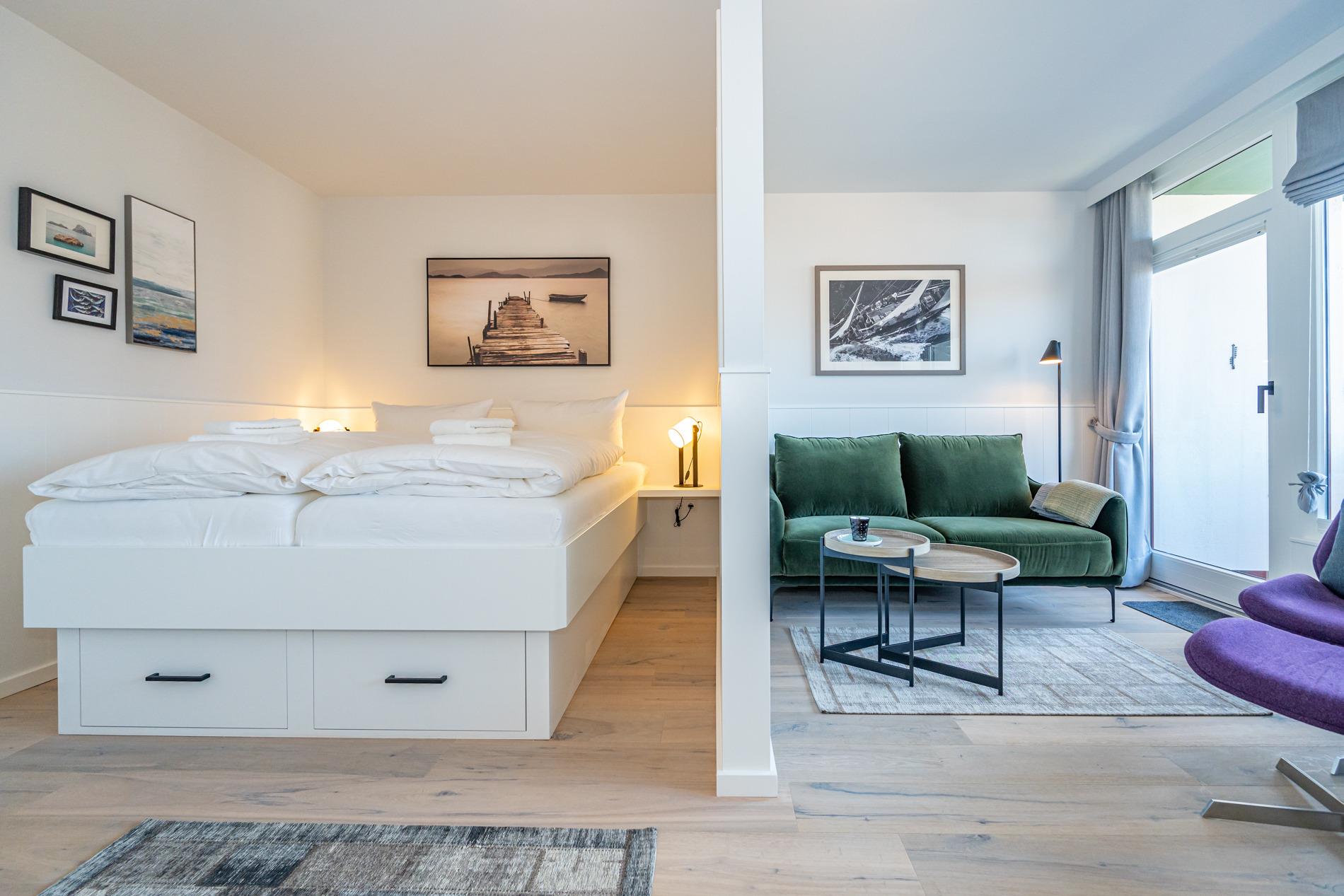 Die geschmackvoll ausgestattete 1-Zimmer-Nichtraucher-Ferienwohnung (ca. 36 qm) in der 3. Etage mit Westloggia (mit Balkonmöbeln und Auflagen) bietet höchsten Komfort auf kleinem Raum für max. 2 Personen.