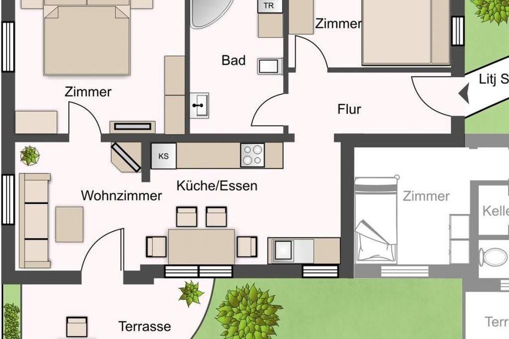 Vom Vorflur mit Garderobe gelangt man in das Wohn-/Esszimmer mit offener Küche (Geschirrspüler, Induktionskochfeld, Mikrowelle, Backofen, Kühlschrank, Kaffeemaschine, Nespresso Kapselmaschine etc.). Das Wohnzimmer ist mit einer gemütlichen Couch, Flachbild-TV, W-Lan und Telefonflat ins Deutsche Festnetz (Handynummern gesperrt) ausgestattet. Im großen Doppelschlafzimmer befinden sich ein Doppelbett (1,80 x 2,00 m, Bettdecken in Überlänge). Das kleinere Schlafzimmer verfügt über ein 1,40 x 2,00 m breites Bett (Bettdecken in Überlänge). Im geräumigen Duschbad mit großem Waschtisch und WC befindet sich außerdem eine Waschmaschine.