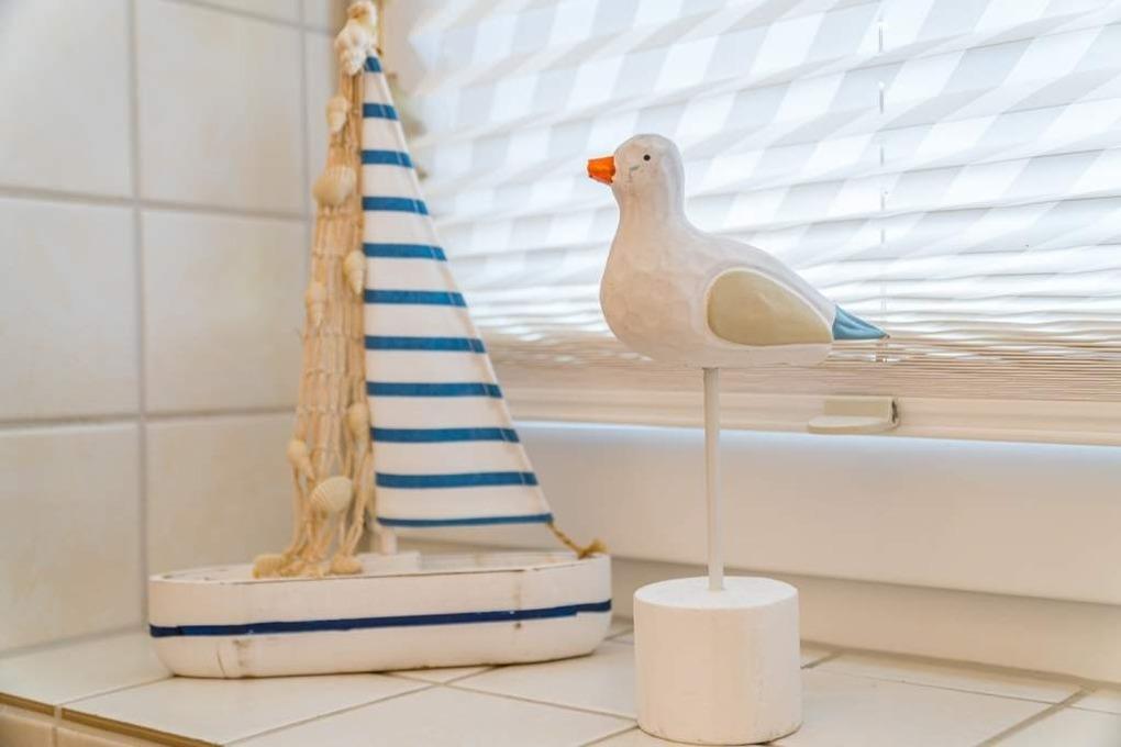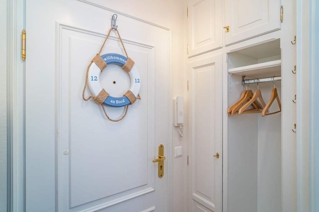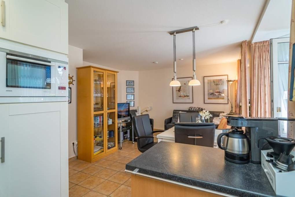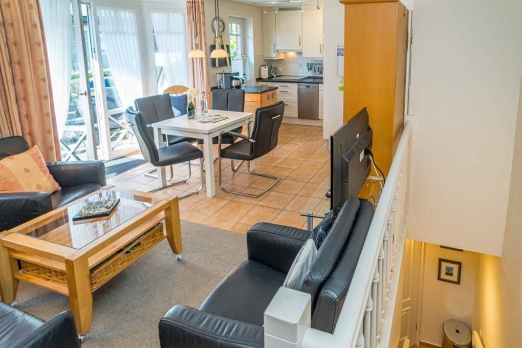 Im Eingangsbereich befindet sich der Flur mit Garderobe und das Gäste-WC. Daran schließt sich das Wohnzimmer mit direktem Zugang zur geschützten Westterrasse an. Es hat eine Sitzgarnitur (2-Sitzer-Couch und 2 Sessel), einen separaten Essplatz, eine Vitrine, Radio, Flachbild-TV, Telefon (kostenlose Telefonie ins dt. Festnetz, Handynummern gesperrt), Wlan und eine offene Küche. Die mit allem Komfort ausgestattete Küche lässt mit 4-Platten-Ceranfeld, Geschirrspüler, Mikrowelle und einem Backofen keine Wünsche offen. Kaffeemaschine, Wasserkocher und Toaster gehören zur Grundausstattung.