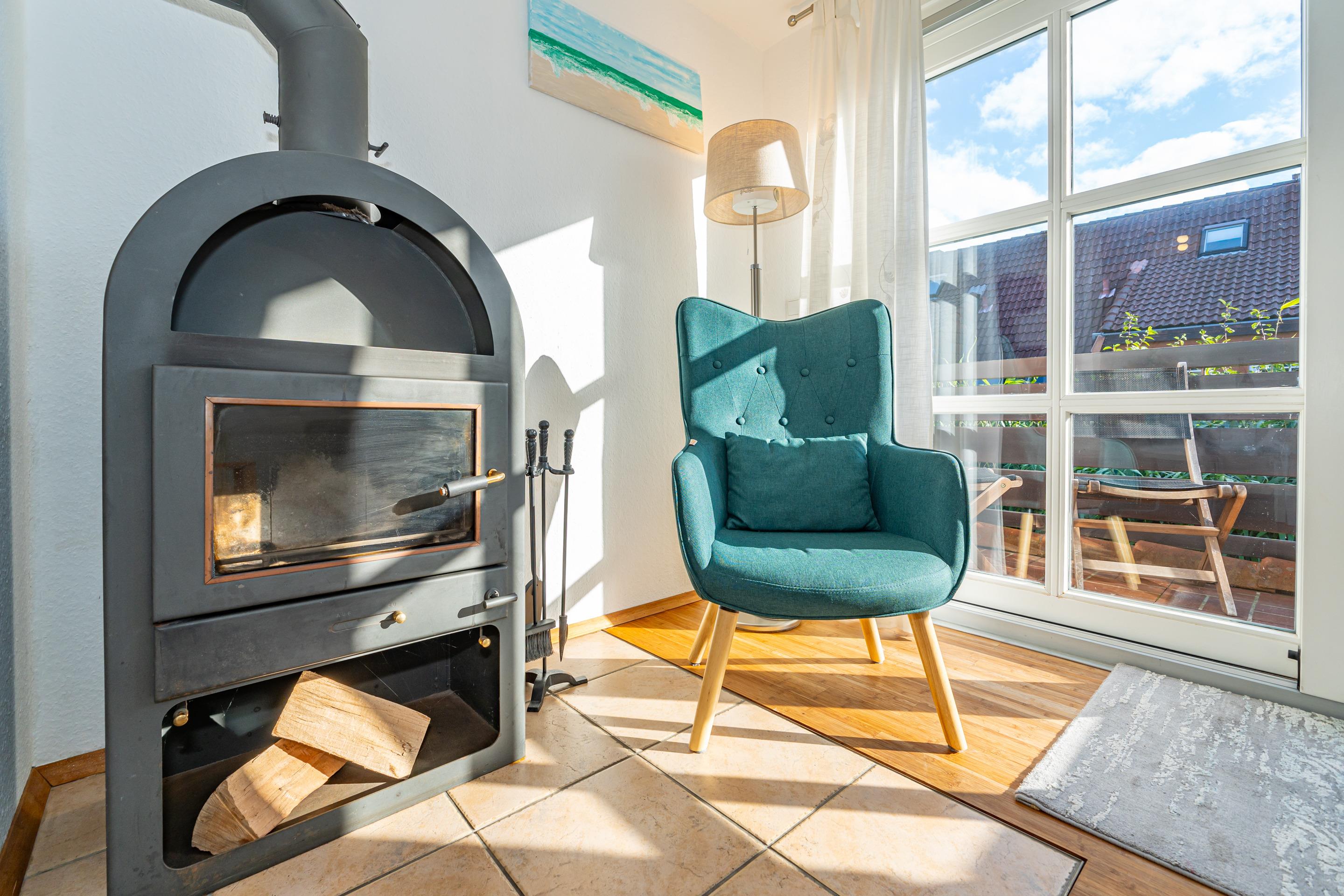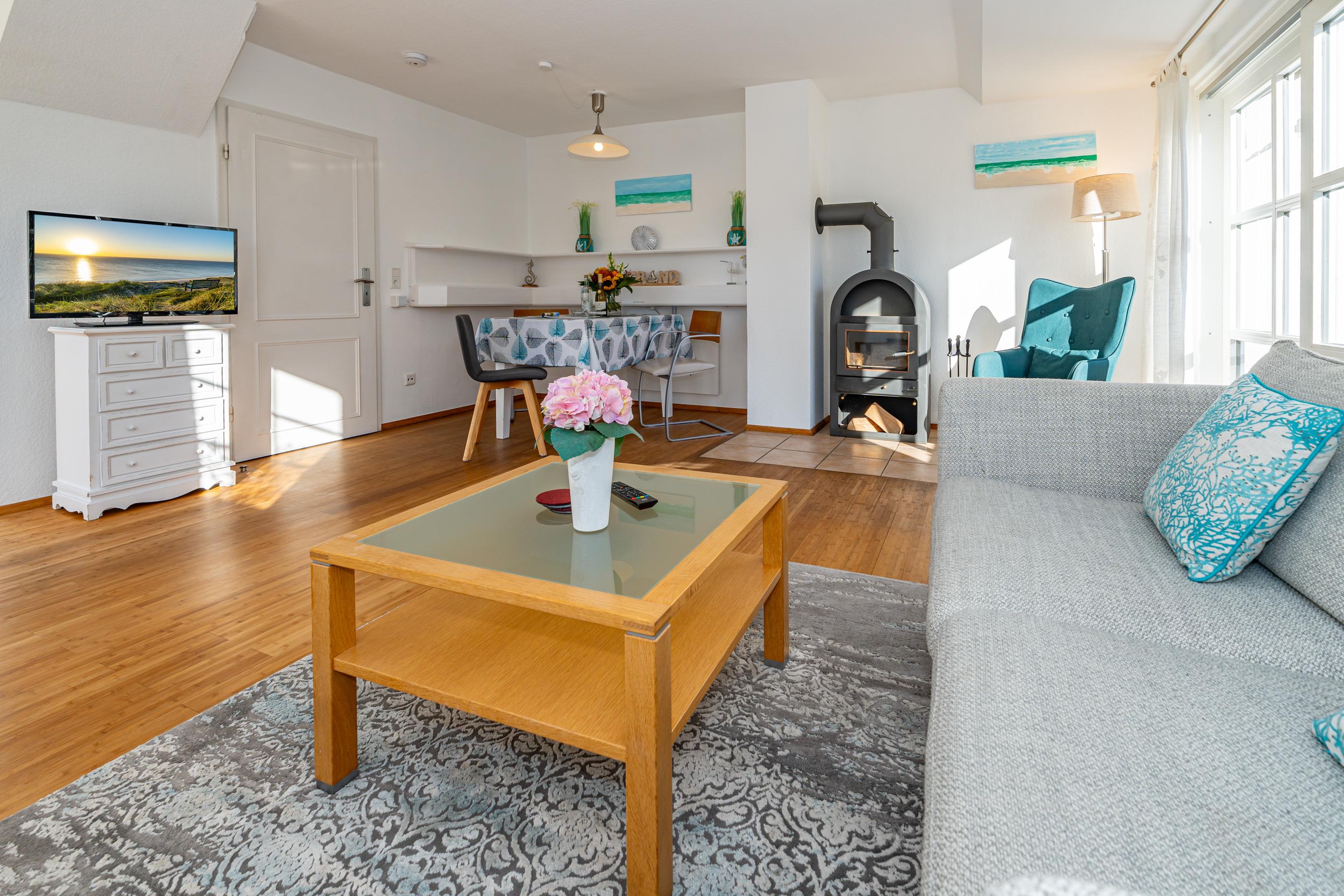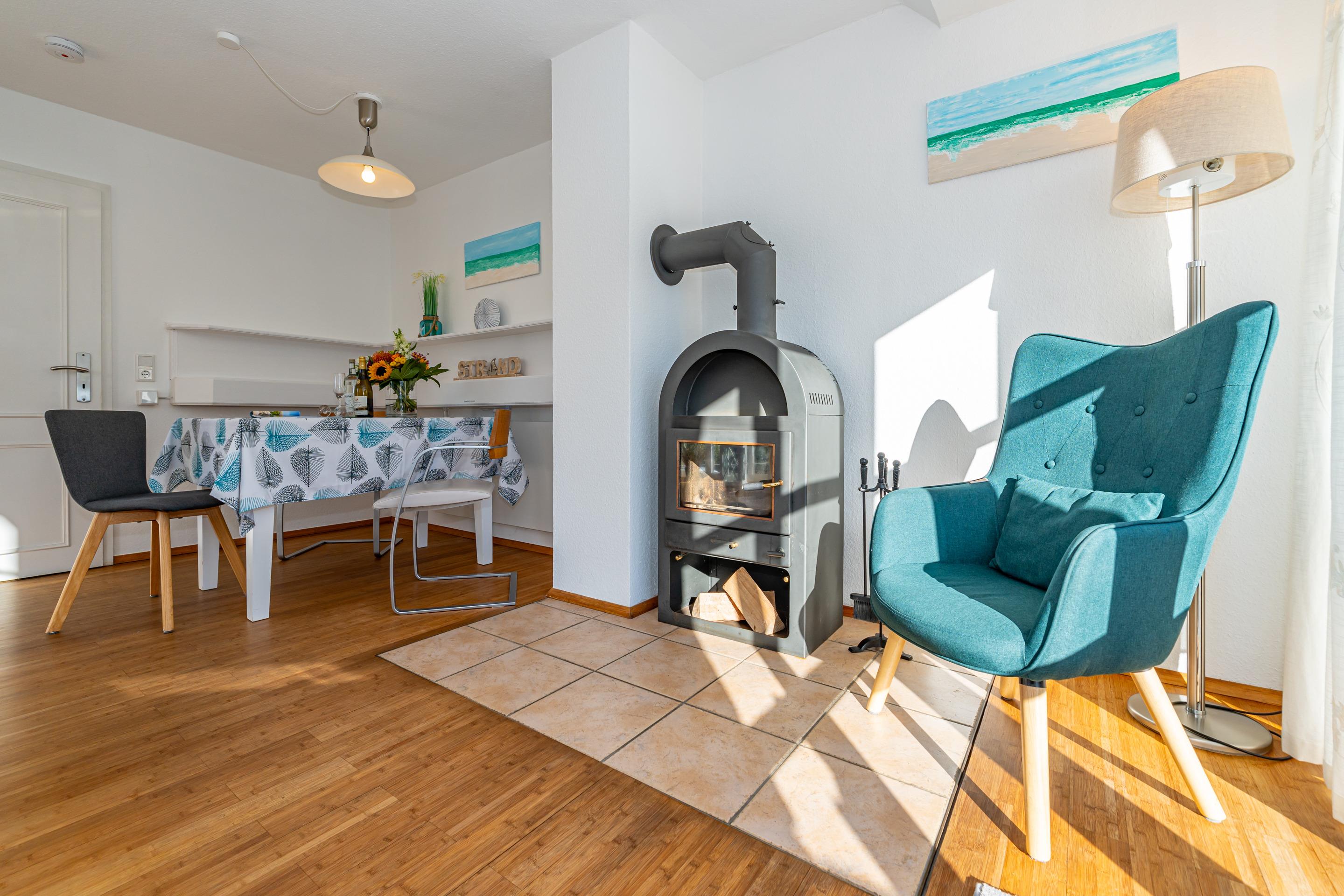 Der Wohnraum verfügt über eine gemütliche Sitzecke (2,5-Sitzer-Sofa) mit Sessel, einen separaten Essplatz, Radio/CD und Flachbild-TV, einen Kaminofen und ein großes Panoramafenster nach Westen
