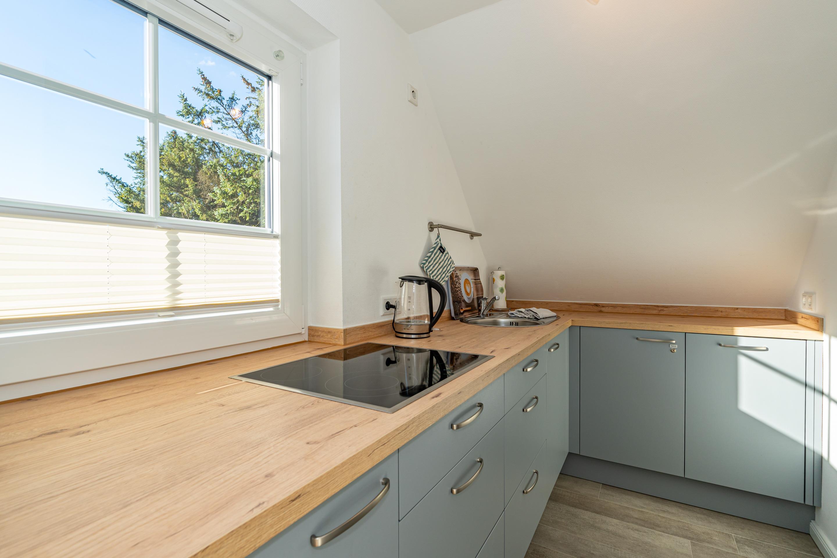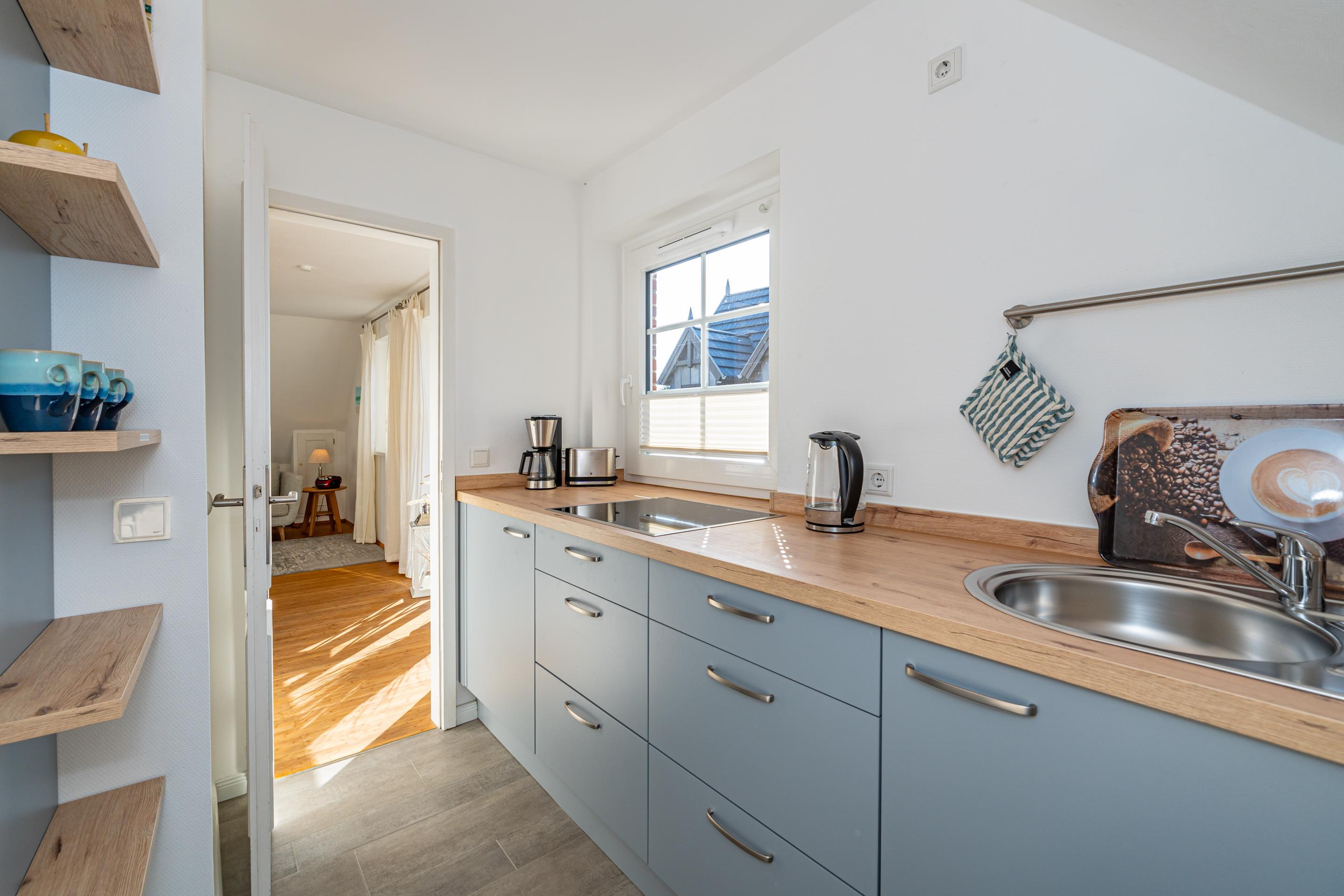 Die separate Einbauküche besitzt einen Geschirrspüler, ein Ceranfeld, eine Mikrowelle und einen Kühlschrank (ohne Gefrierfach). Kaffeemaschine, Wasserkocher und Toaster gehören zur Grundausstattung.