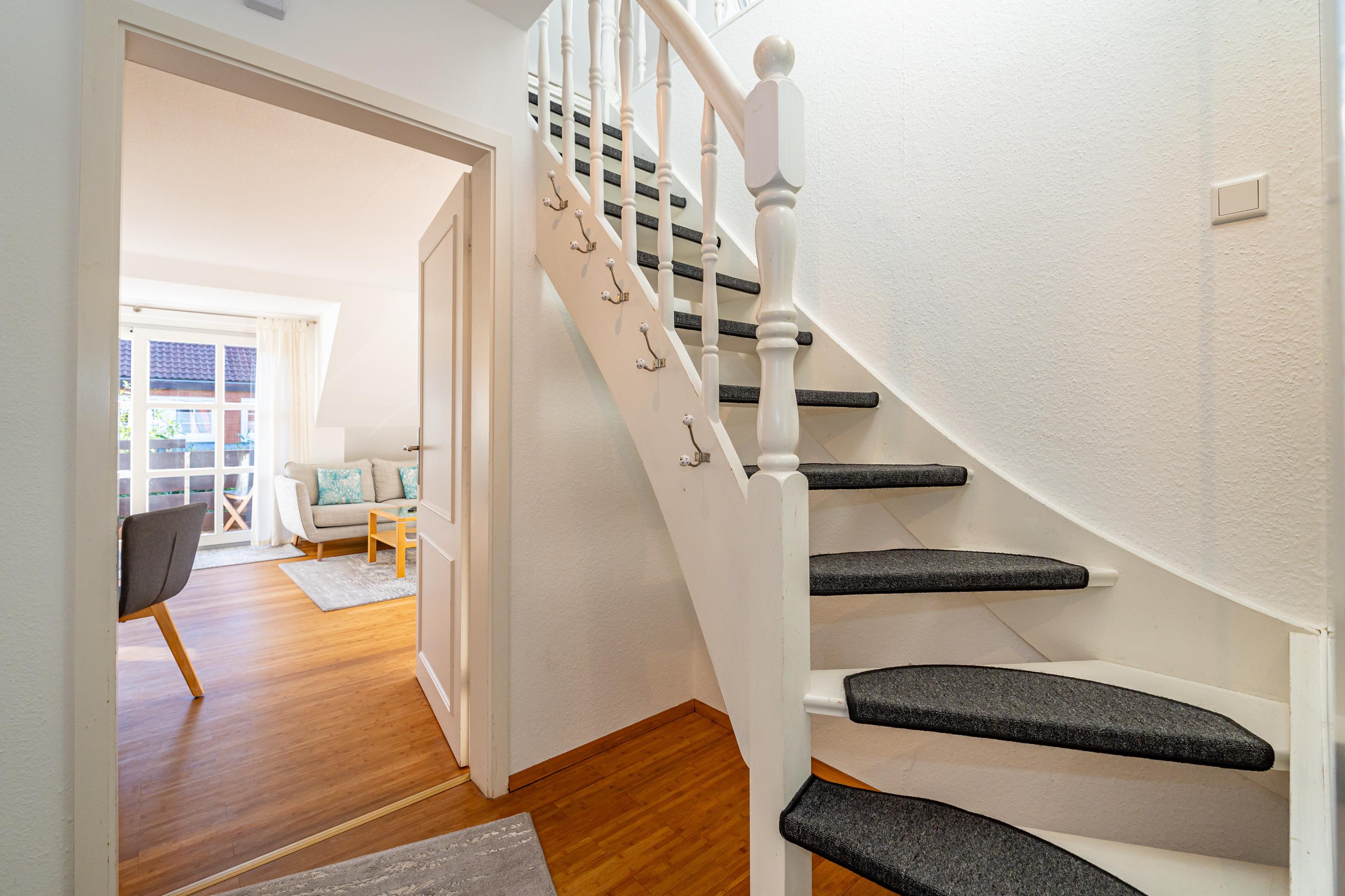 Hochwertig ausgestattete lichtdurchflutete 2-Zimmer-Nichtraucher-Ferienwohnung, Wohnen auf 2 Ebenen, ca. 65 qm im 1. OG mit Balkon und Balkonmöbeln für max. 2 Personen.