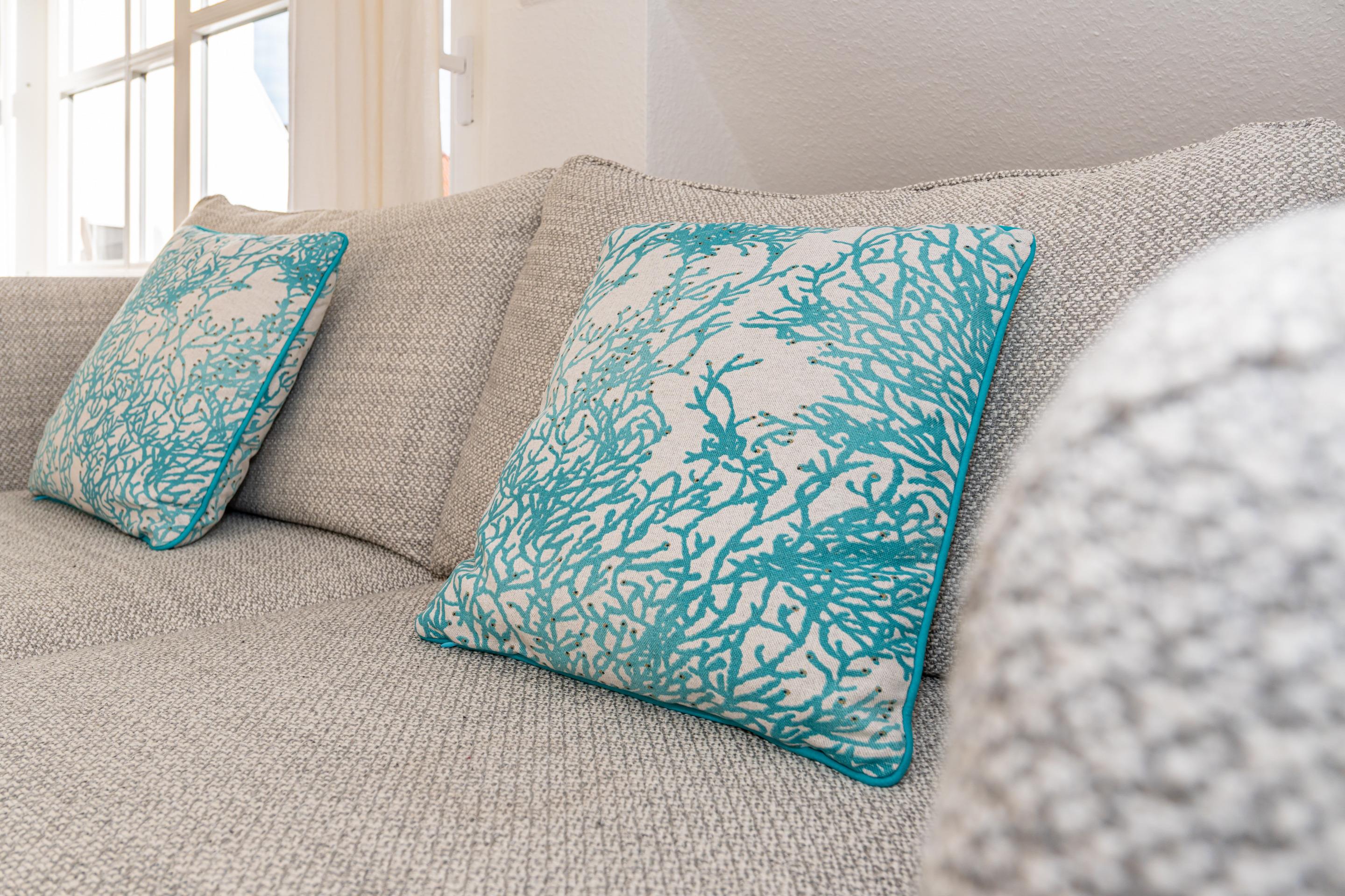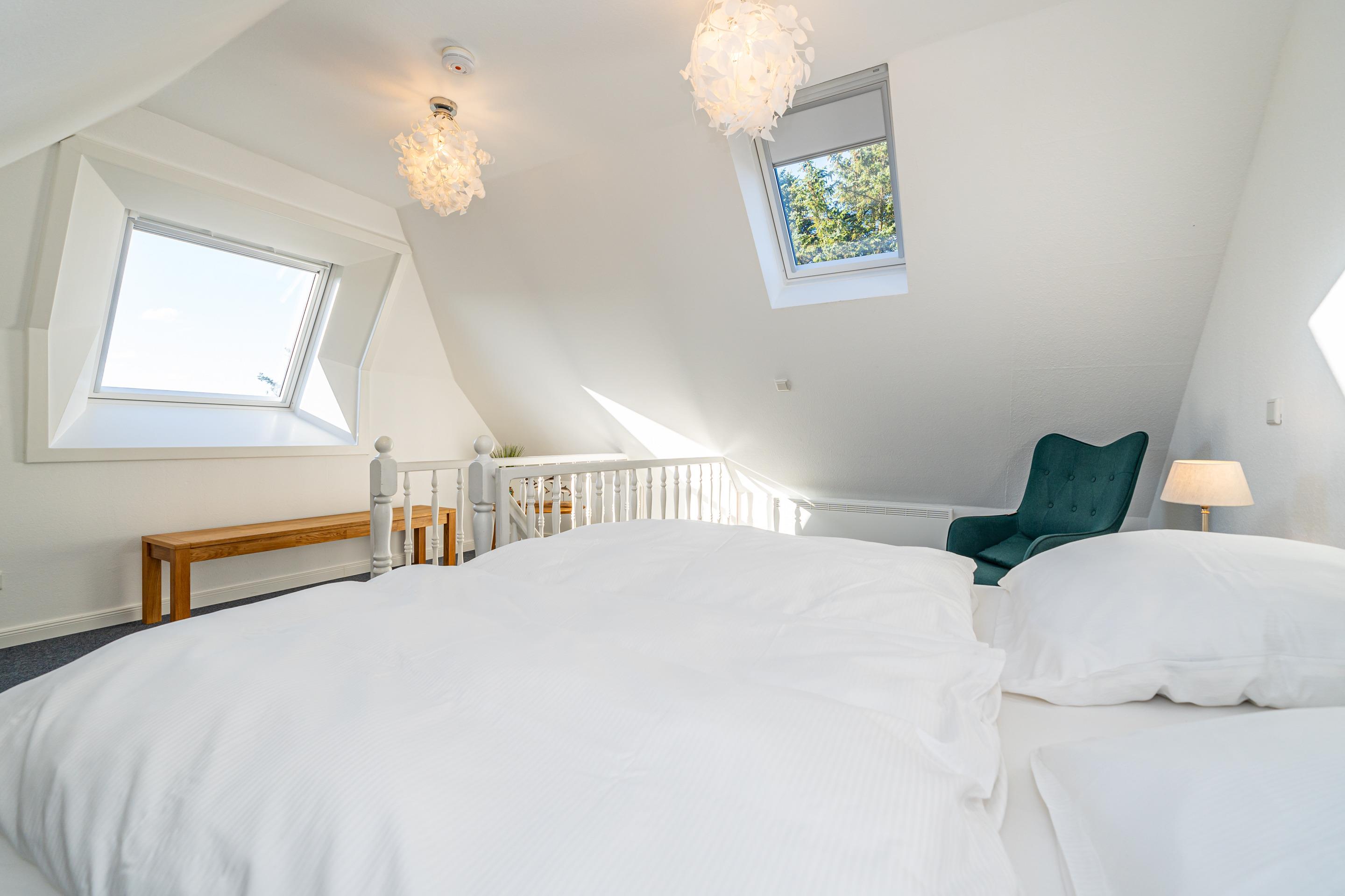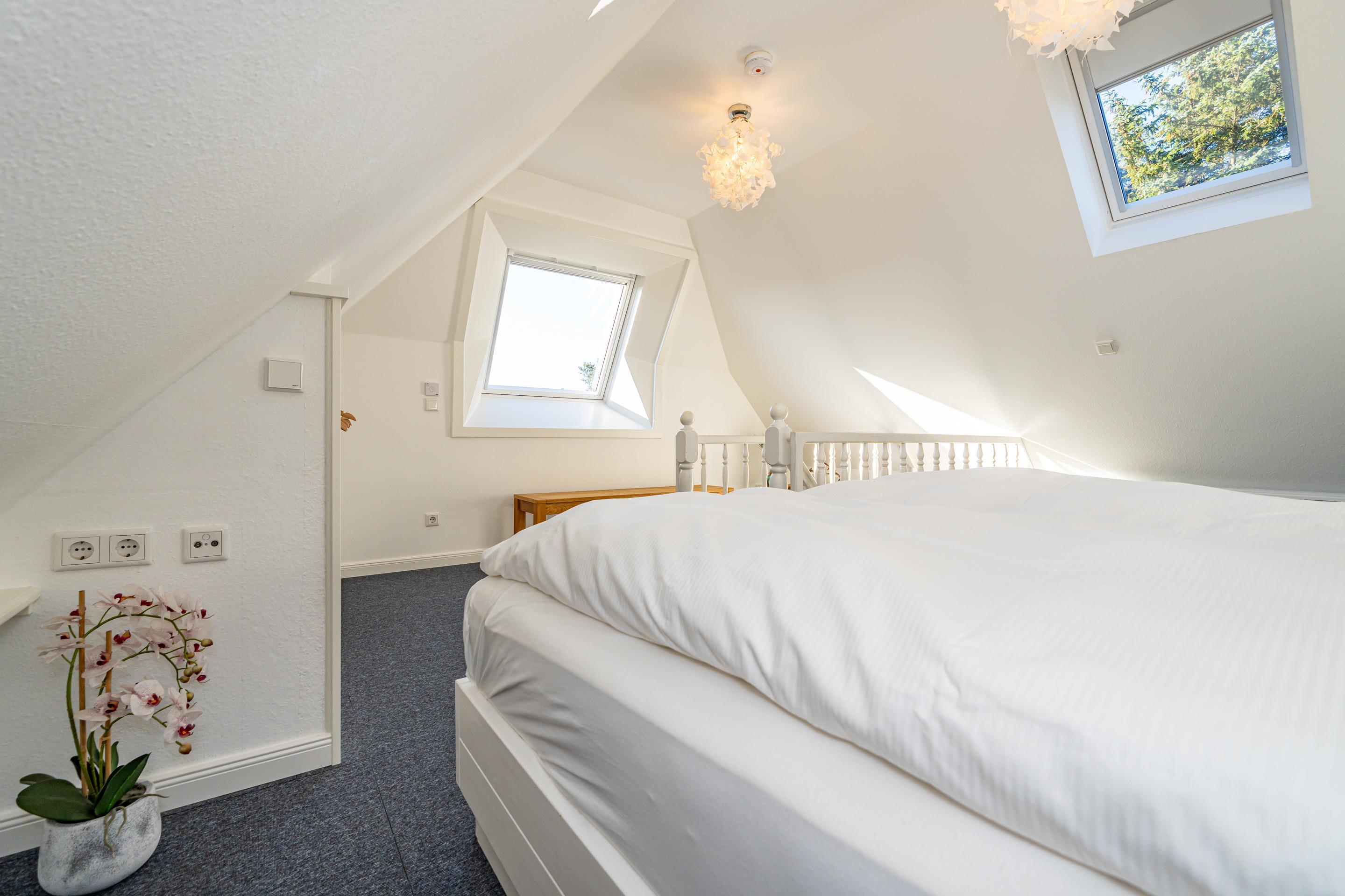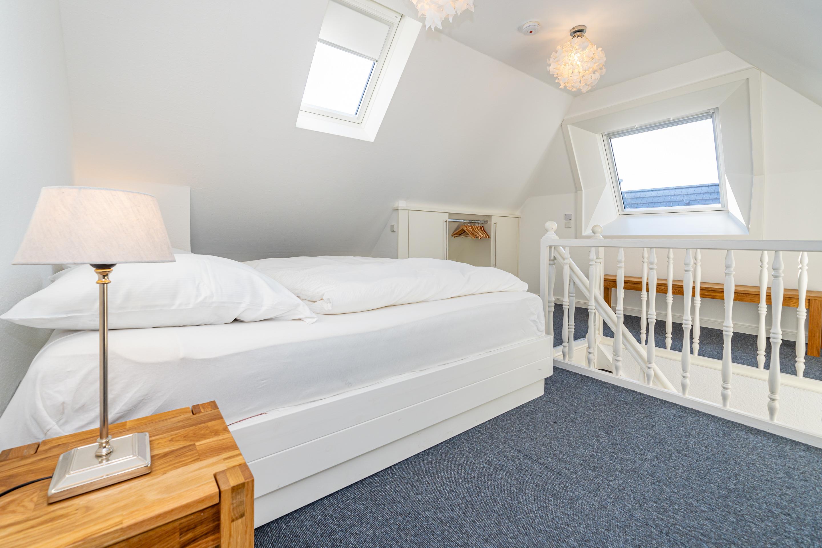 Das Schlafzimmer ist mit einem guten Doppelbett (durchgehende hochwertige Kaltschaummatratze, Liegefläche 1,80 x 2,00 m), Kleiderschrank und mit einer kleinen Sitzecke mit einem Sessel eingerichtet. Die Wohnung bietet teilweise Dünenblick.
