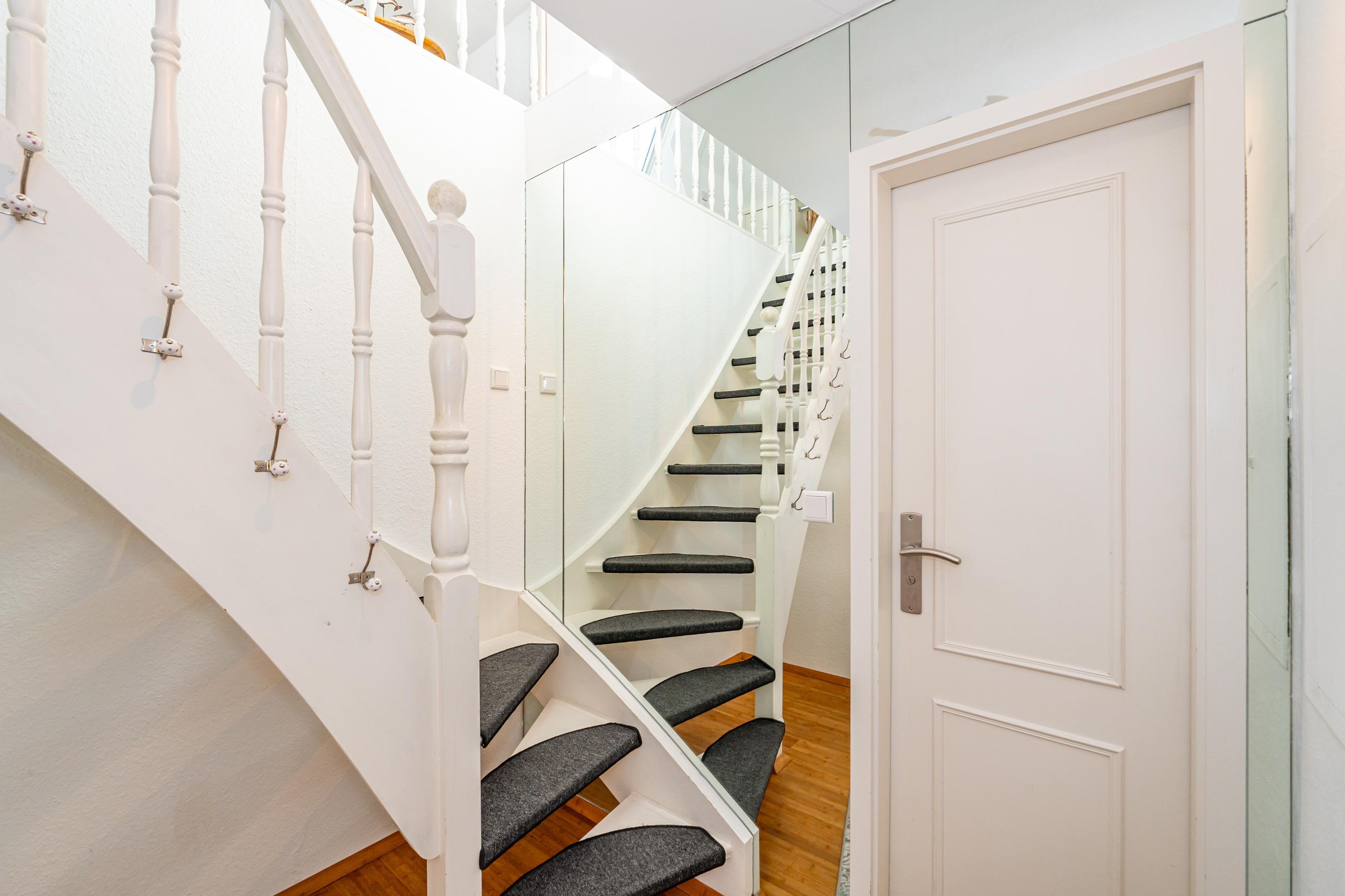 Vom Vorflur mit Garderobe gelangt man in das Wohnzimmer (mit Austritt zum Südbalkon und Blick in die angrenzenden Gärten), das Duschbad/WC und über eine Treppe in das Schlafzimmer.