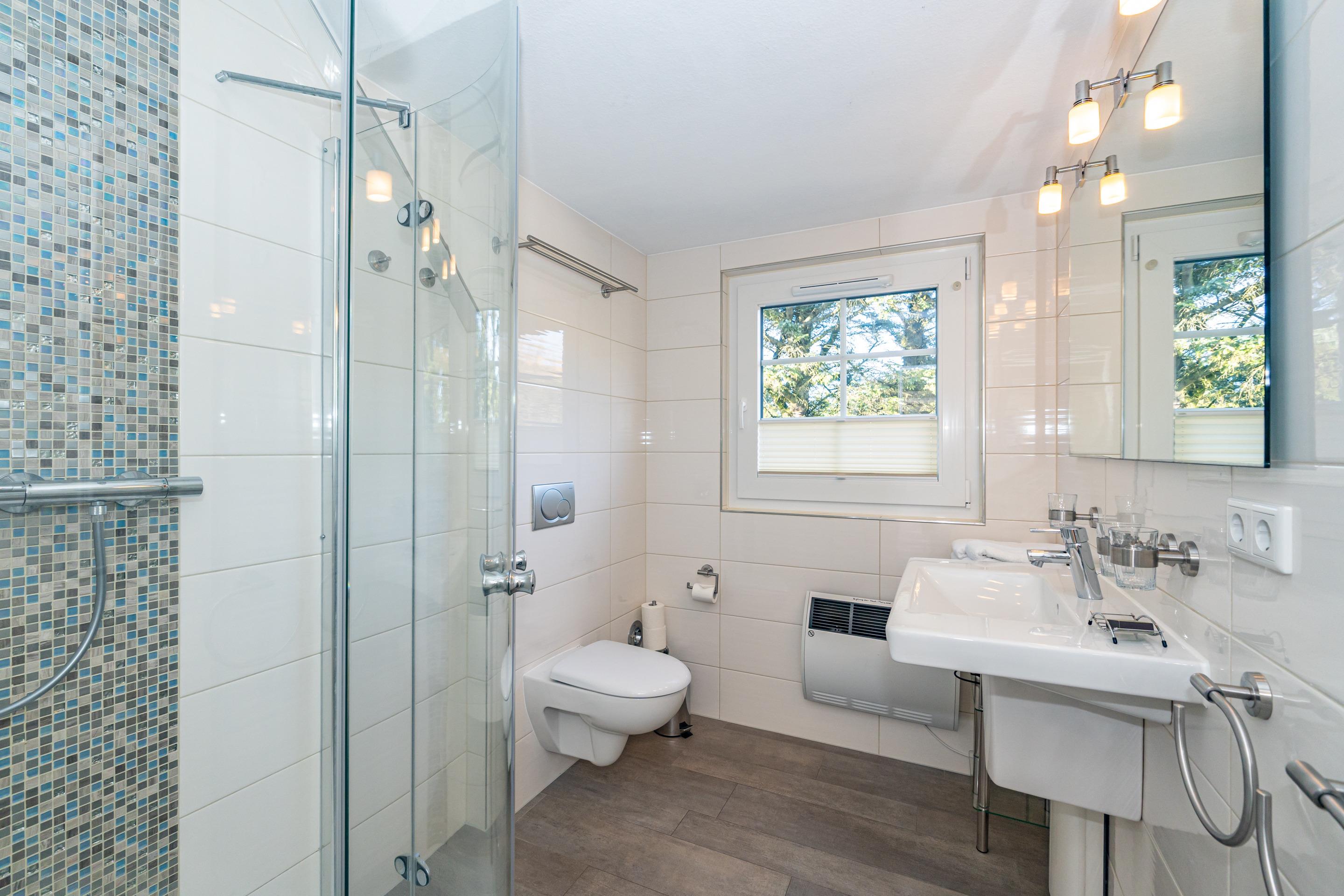 Das Badezimmer mit Fenster ist mit einer Dusche und WC, Waschtisch, Fön und Kosmetikspiegel ausgestattet.