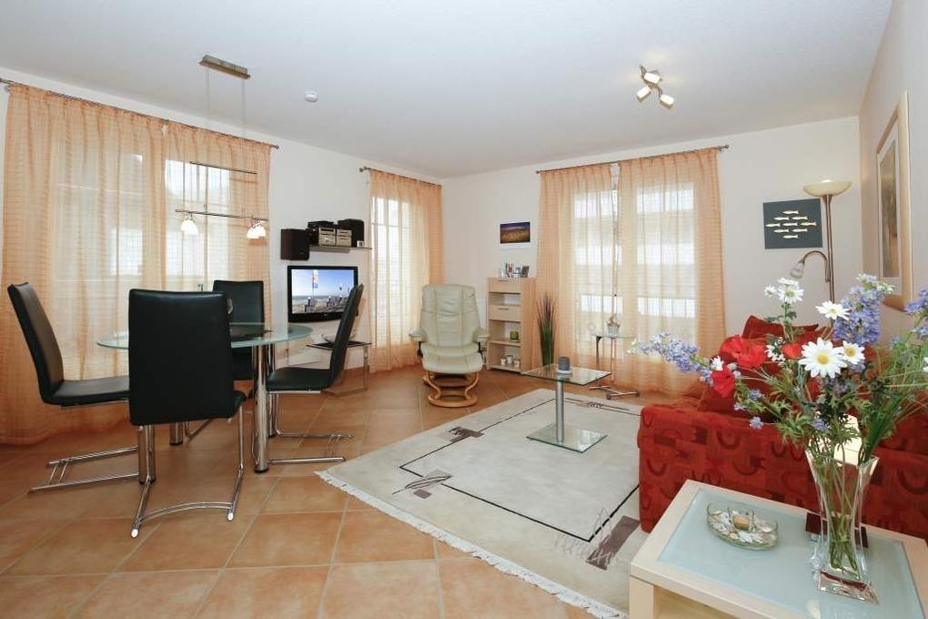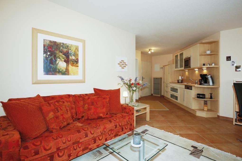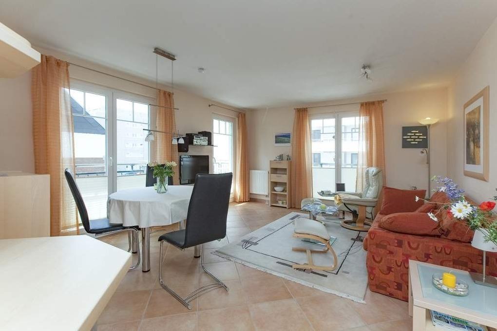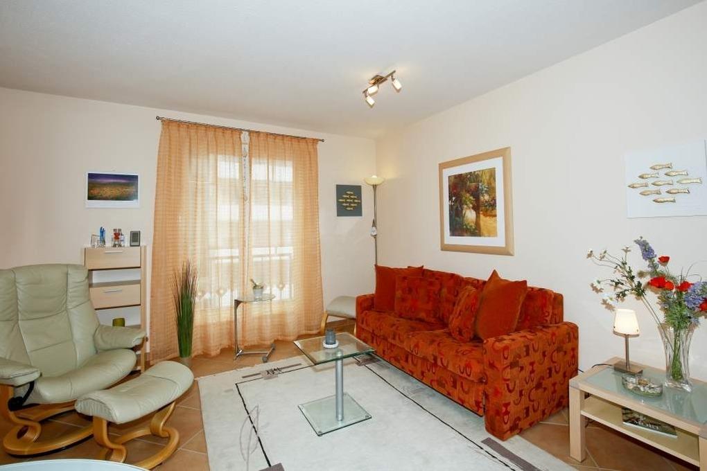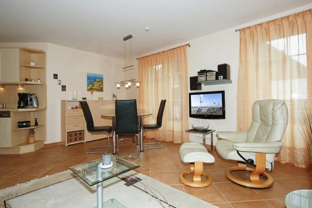 Das geräumige mit Fliesen ausgelegte Wohnzimmer ist mit einer gemütlichen Sitzecke mit Sofa (mit Schlaffunktion, 1,50 x 2,00m), Stressless-Sessel und dazugehörigem Fußhocker, Essplatz, moderner, offener Küchenzeile, Flachbildfernseher mit Kabelanschluss sowie Garderobe ausgestattet. Vom Wohnraum erreicht man den sonnigen Südwestbalkon (mit Balkonmöbeln), das großzügige Schlafzimmer und das Badezimmer.