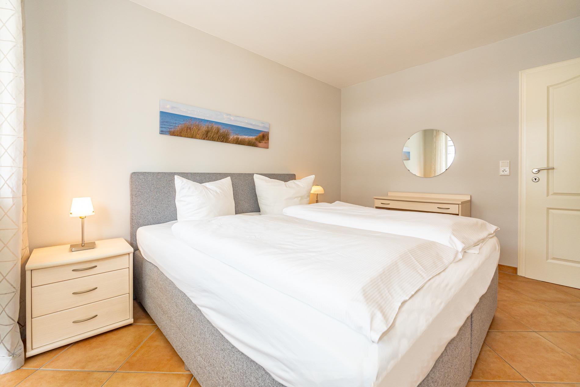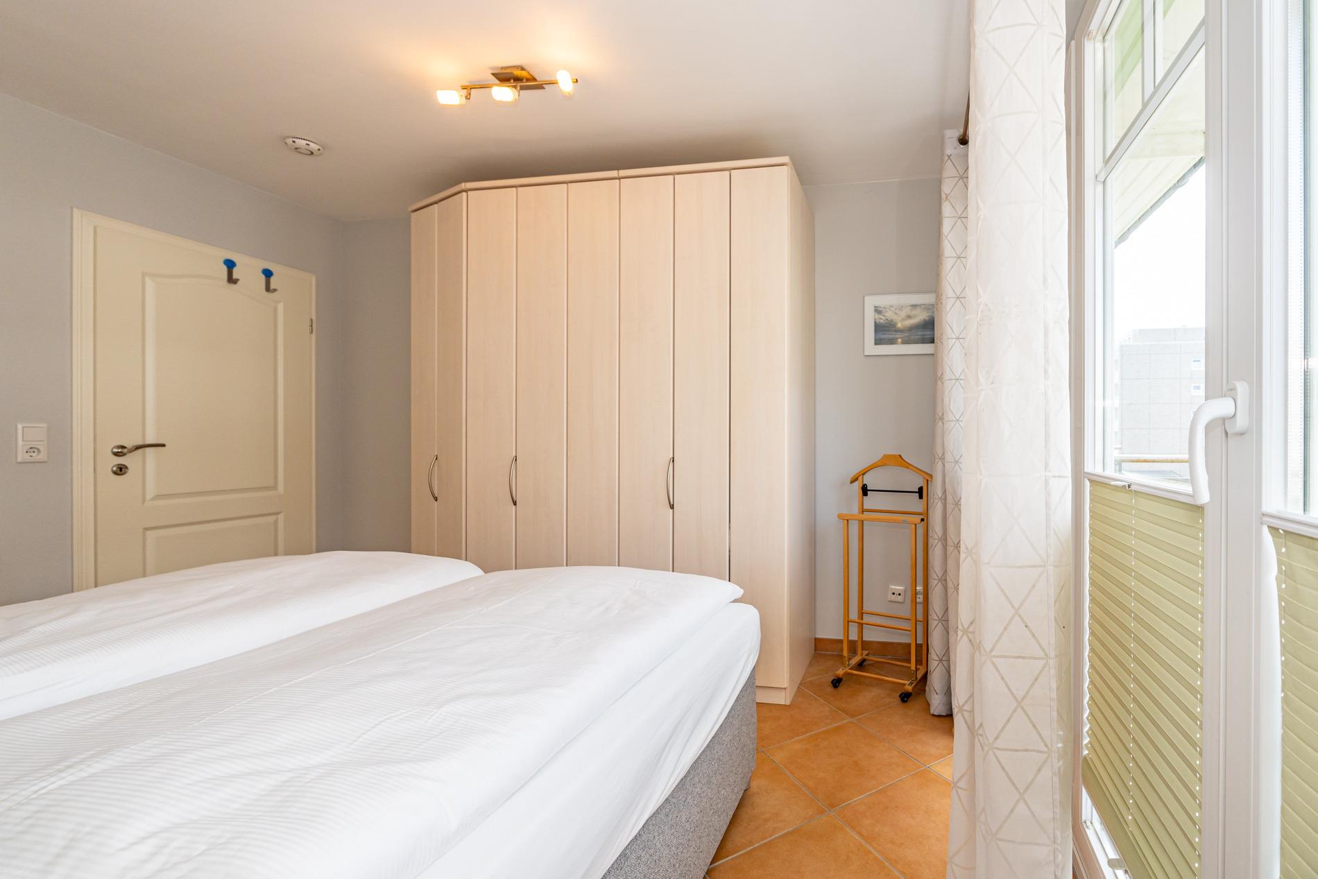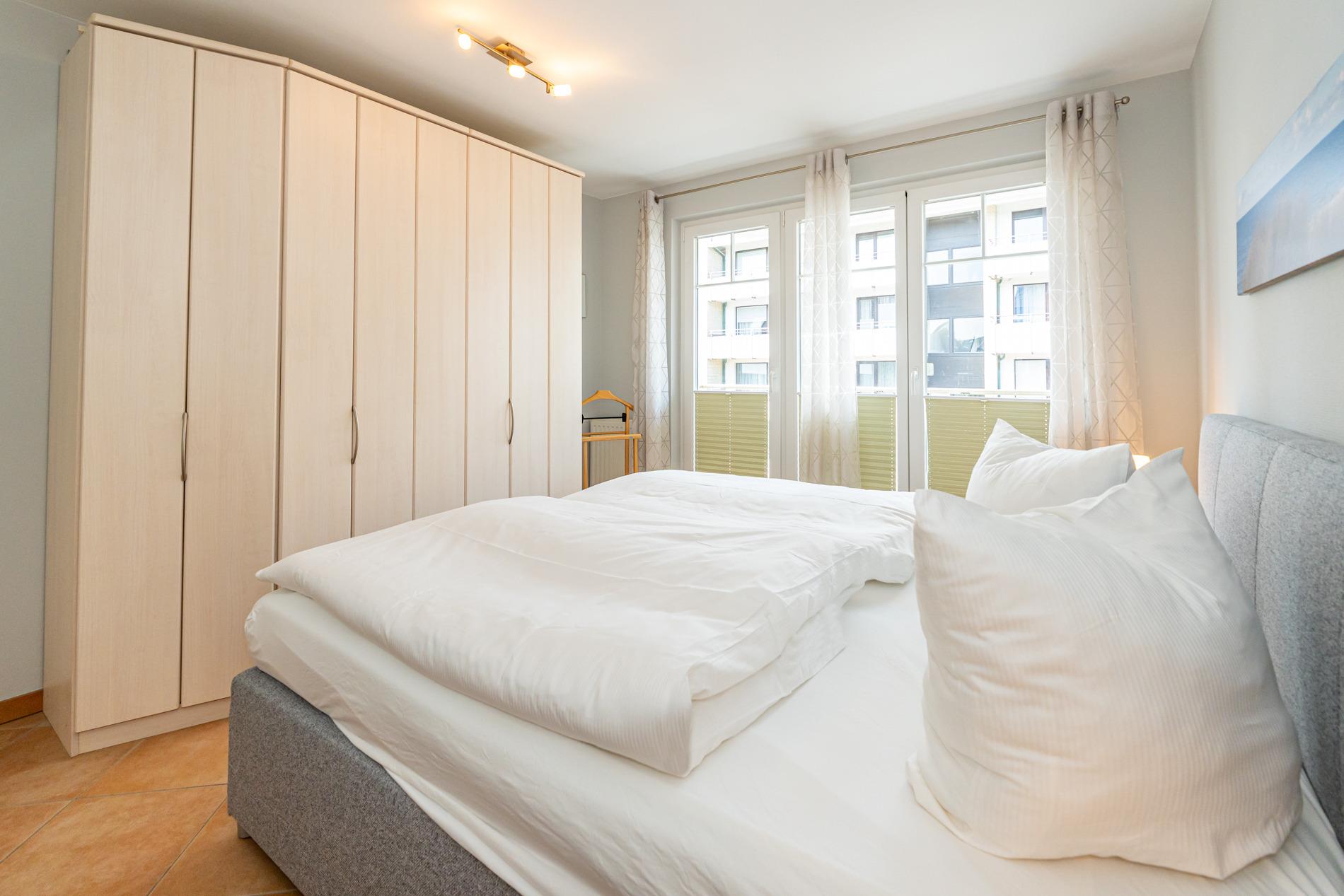 Das Schlafzimmer hat ein Doppelbett mit durchgängiger Matratze (1,80 x 2,00m) mit Austritt zum separaten, zweiten Balkon (Westseite).