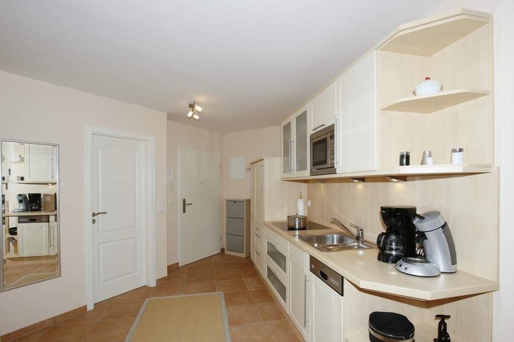 Die Küchenzeile ist mit Geschirrspüler, Mikrowelle, 2-Platten-Ceranfeld und Kühlschrank mit 3-Sterne-Gefrierfach ausgestattet. Kaffeemaschine, Wasserkocher und Toaster gehören zur Grundausstattung.