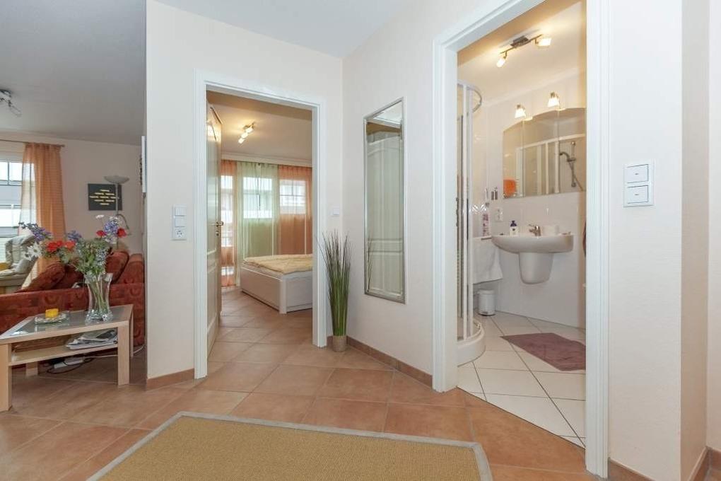 Im modernen Badezimmer befinden sich eine Dusche mit flachem Einstieg, ein Waschtisch, ein Handtuchtrockner, ein Fön sowie das WC.