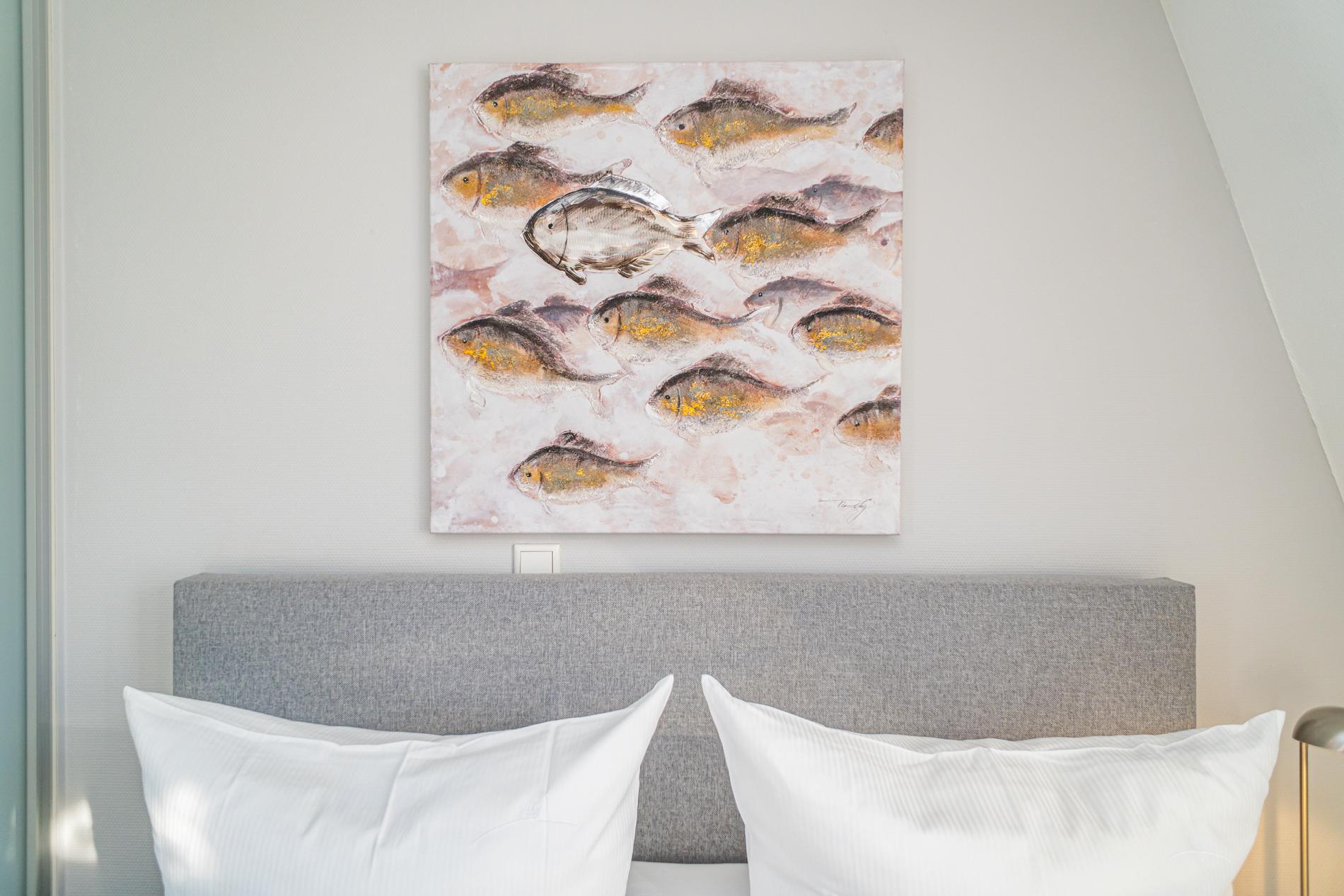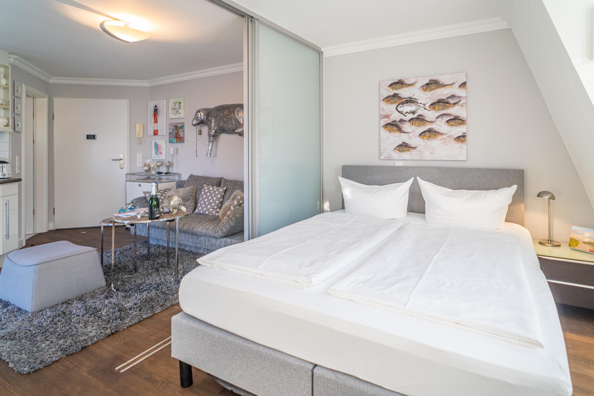 Der Wohn-/Schlafraum ist mit einer gemütlichen Sitzgarnitur, einem hochwertigen Boxspringbett (Liegefläche 1,60 x 2 m, mit zwei Einzelmatratzen und durchgehendem Topper), Flachbild-TV, HiFi-Anlage, Telefon inklusive Flatrate für Gespräche ins deutsche Festnetz (Handynummern gesperrt) und W-Lan ausgestattet.