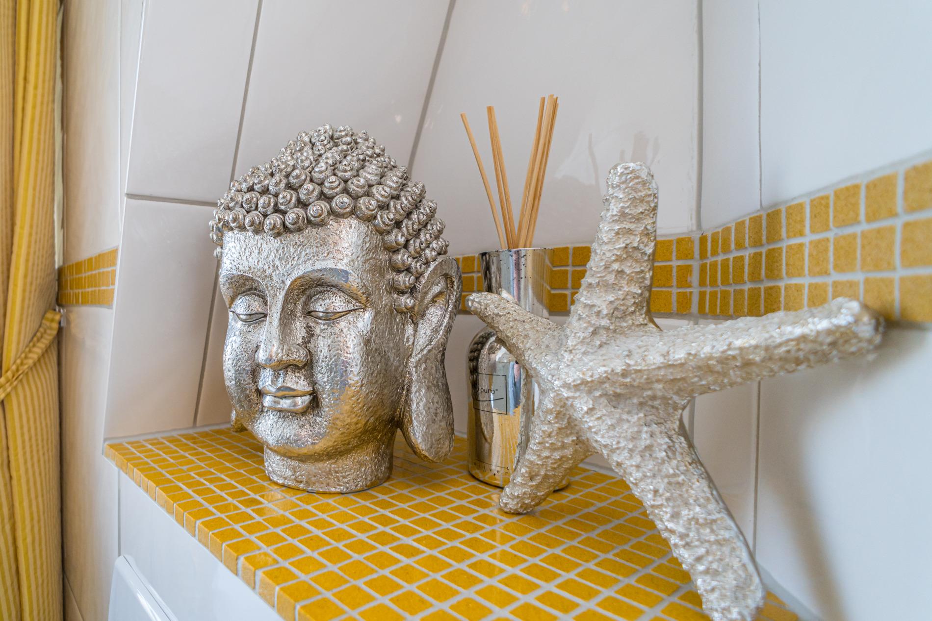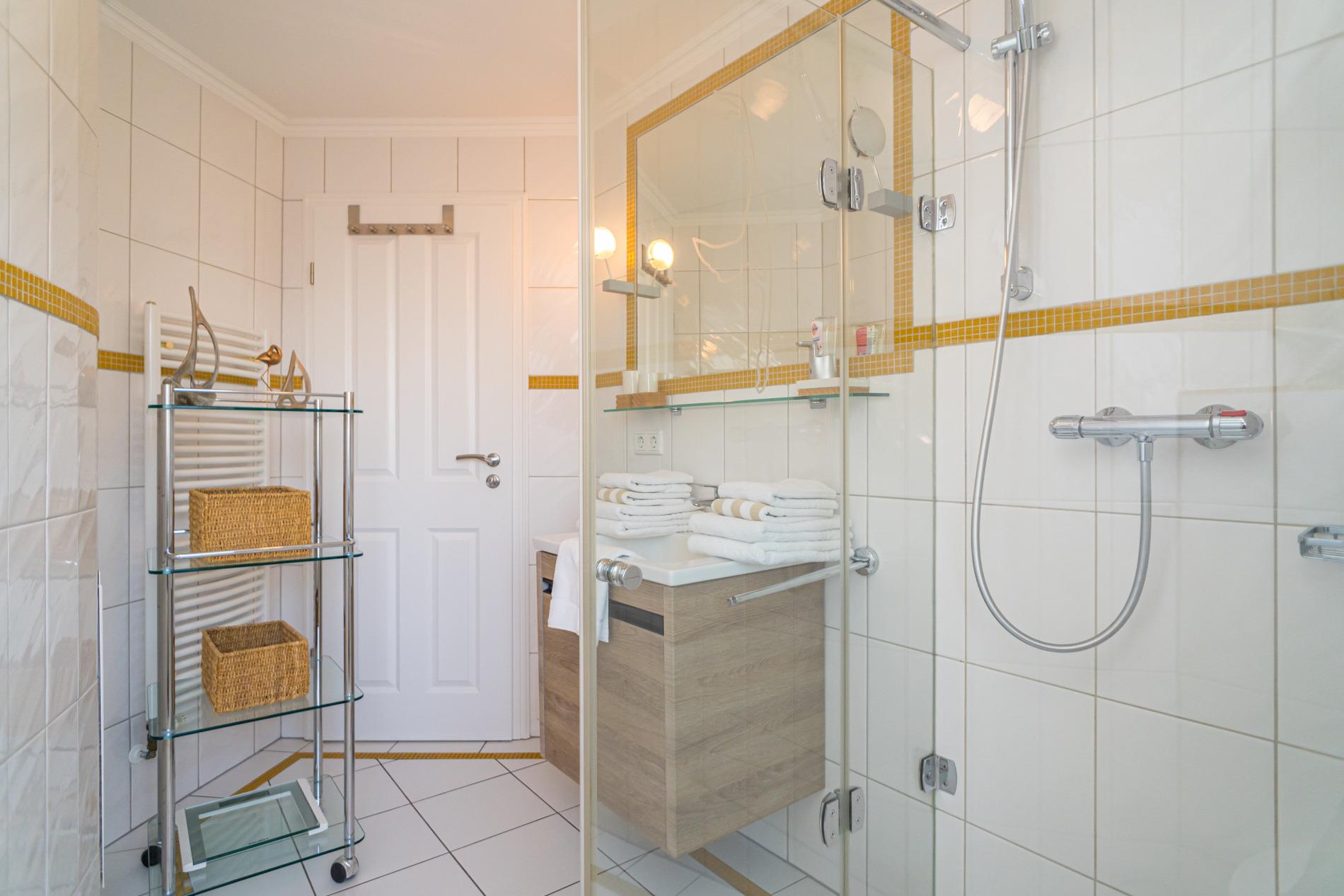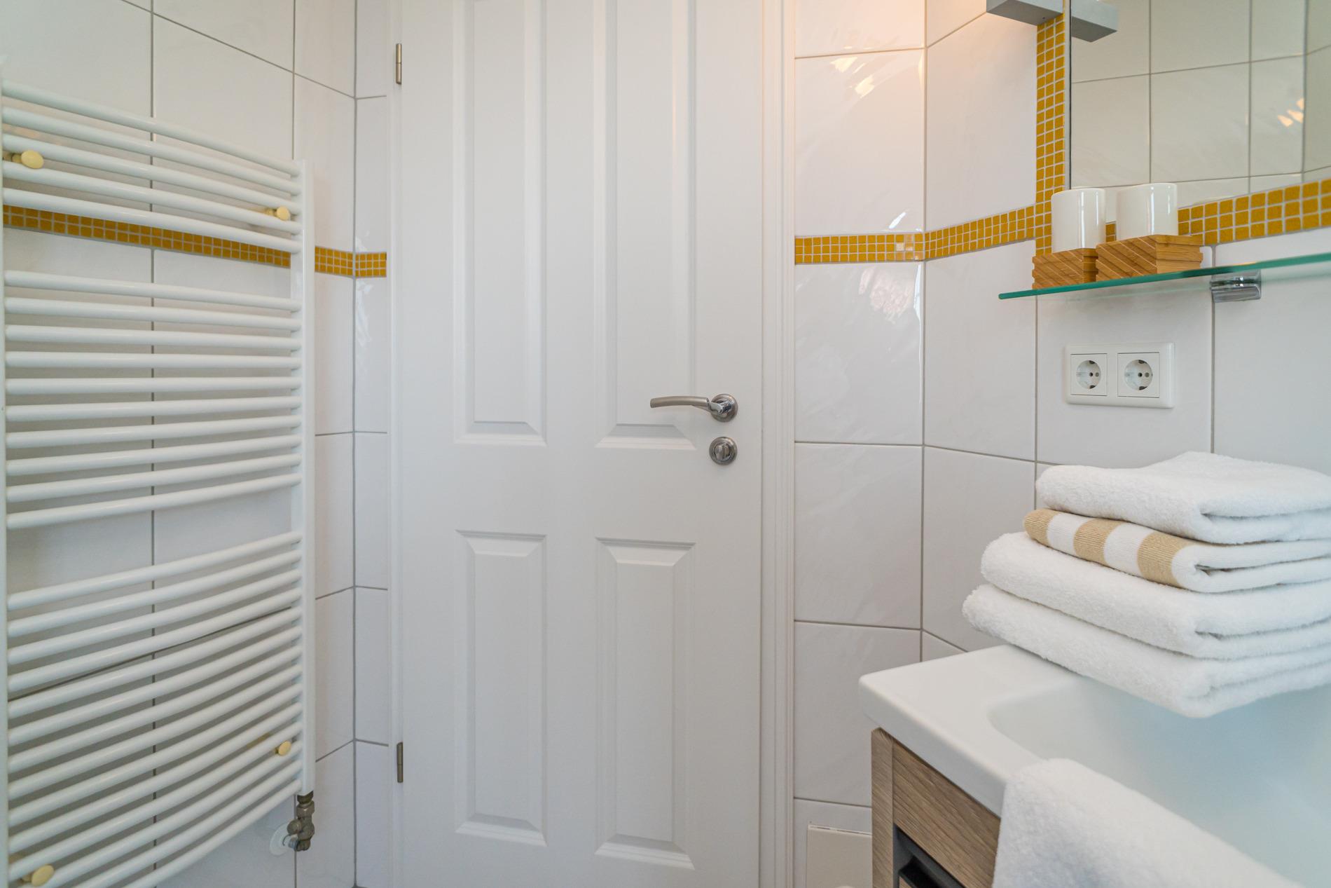 Das moderne neuwertige Badezimmer mit Fenster ist perfekt für einen guten Start in den Urlaubstag. Es besitzt eine Dusche mit extraflachem Einstieg, einen Waschtisch, Handtuchtrockner, WC sowie Fön.