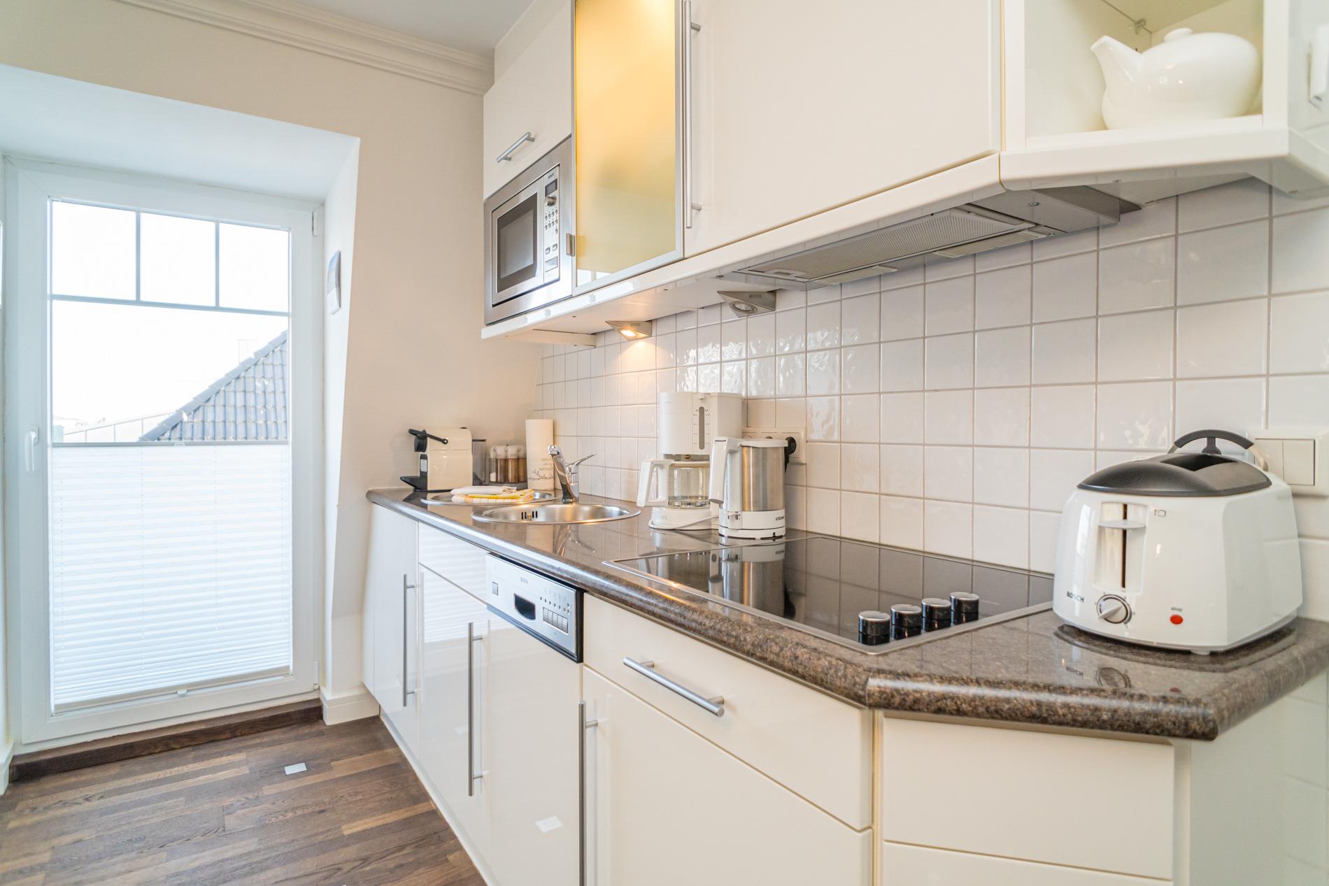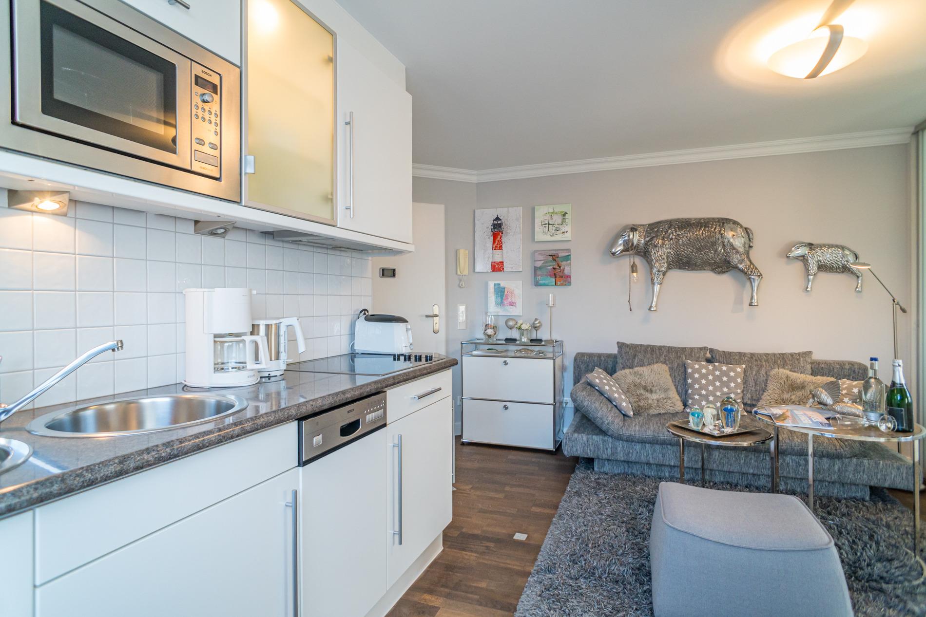 Die offene Küche[nbsp][nbsp]hat einen Geschirrspüler, eine Mikrowellen-Backofen-Kombi, ein Cerankochfeld und einen Kühlschrank mit 3*-Gefrierfach. Kaffeemaschine, Wasserkocher und Toaster gehören zur Grundausstattung.