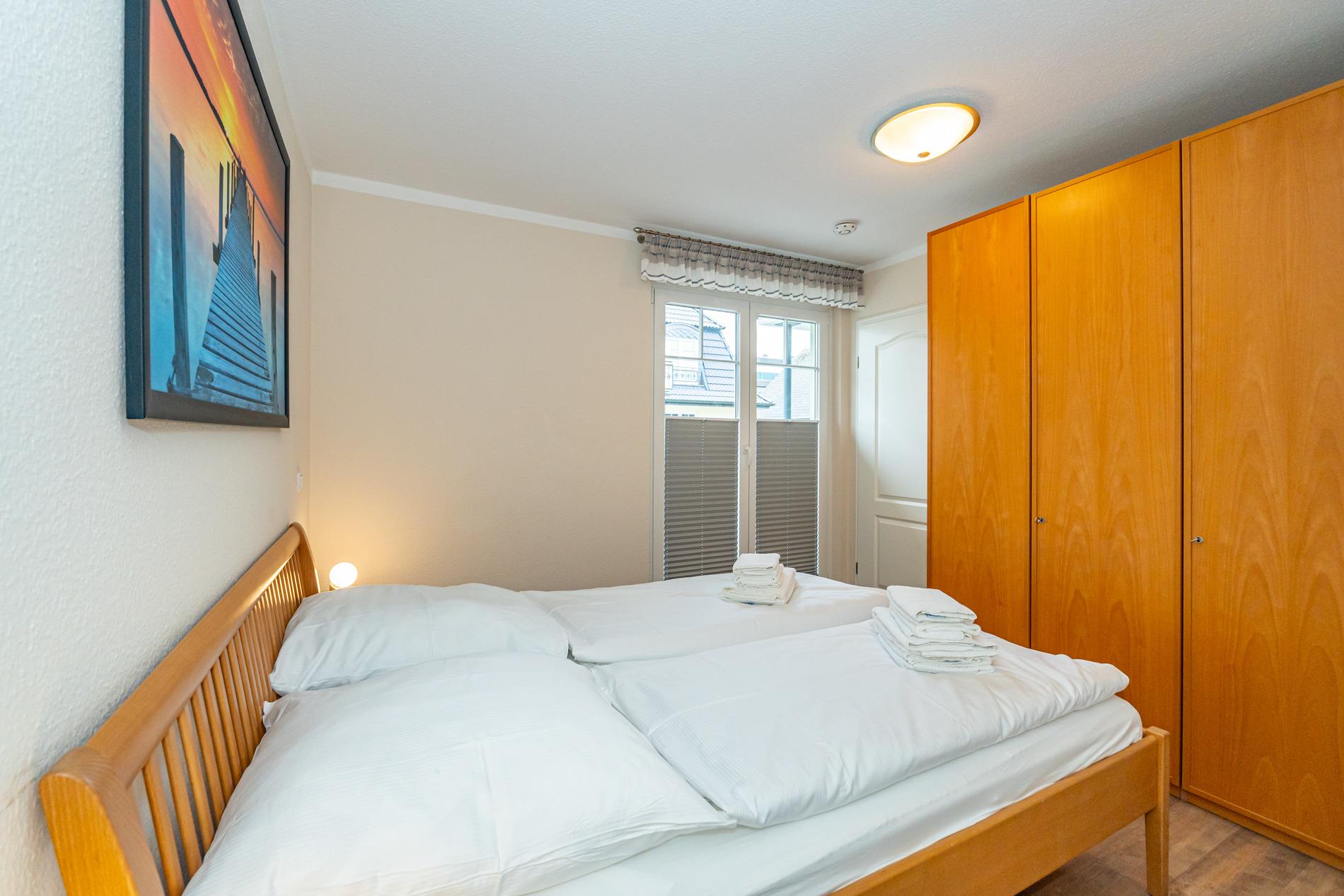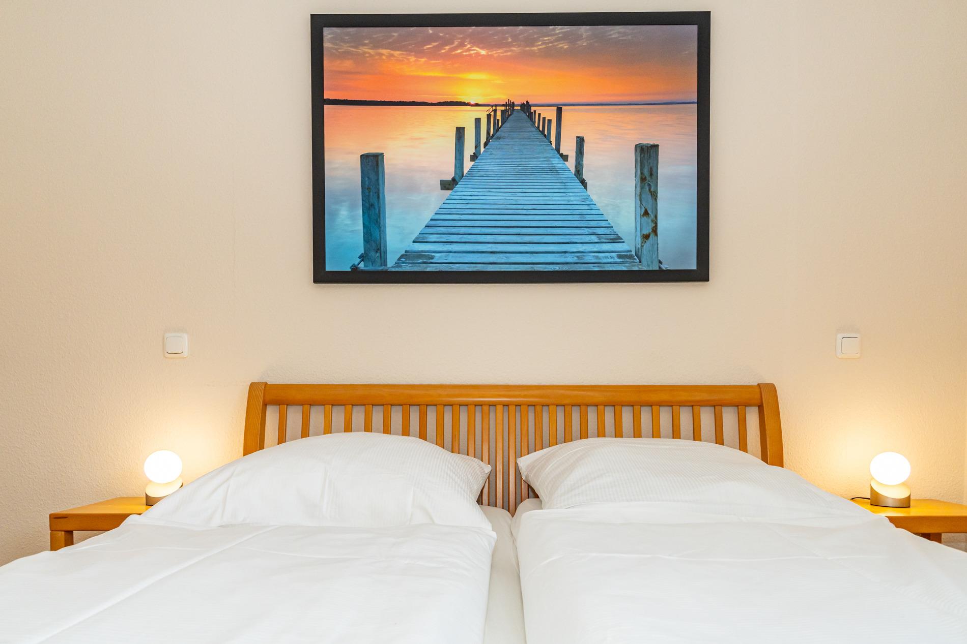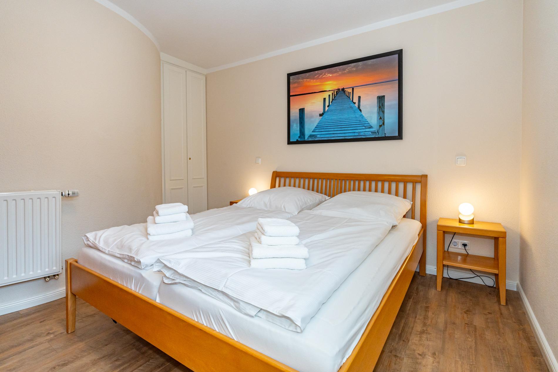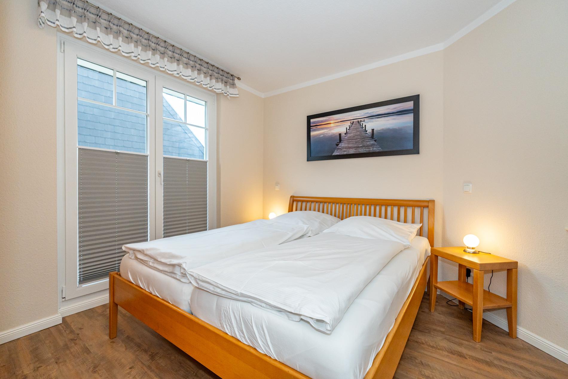 Vom Wohnzimmer aus betreten Sie das Schlafzimmer mit einem Doppelbett (zwei Einzelmatratzen je 0,80 x 1,95 m). Auch hier haben Sie Zugang zur Terrasse. Das helle Duschbad ist mit WC, Fön und modernen Armaturen ausgestattet.