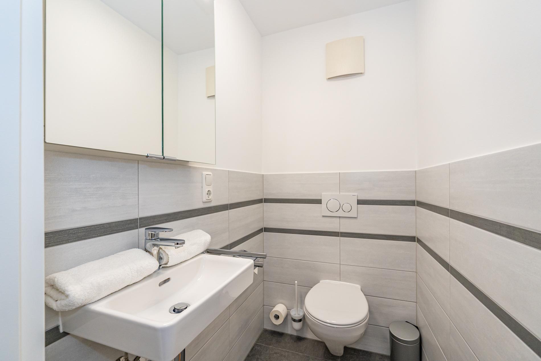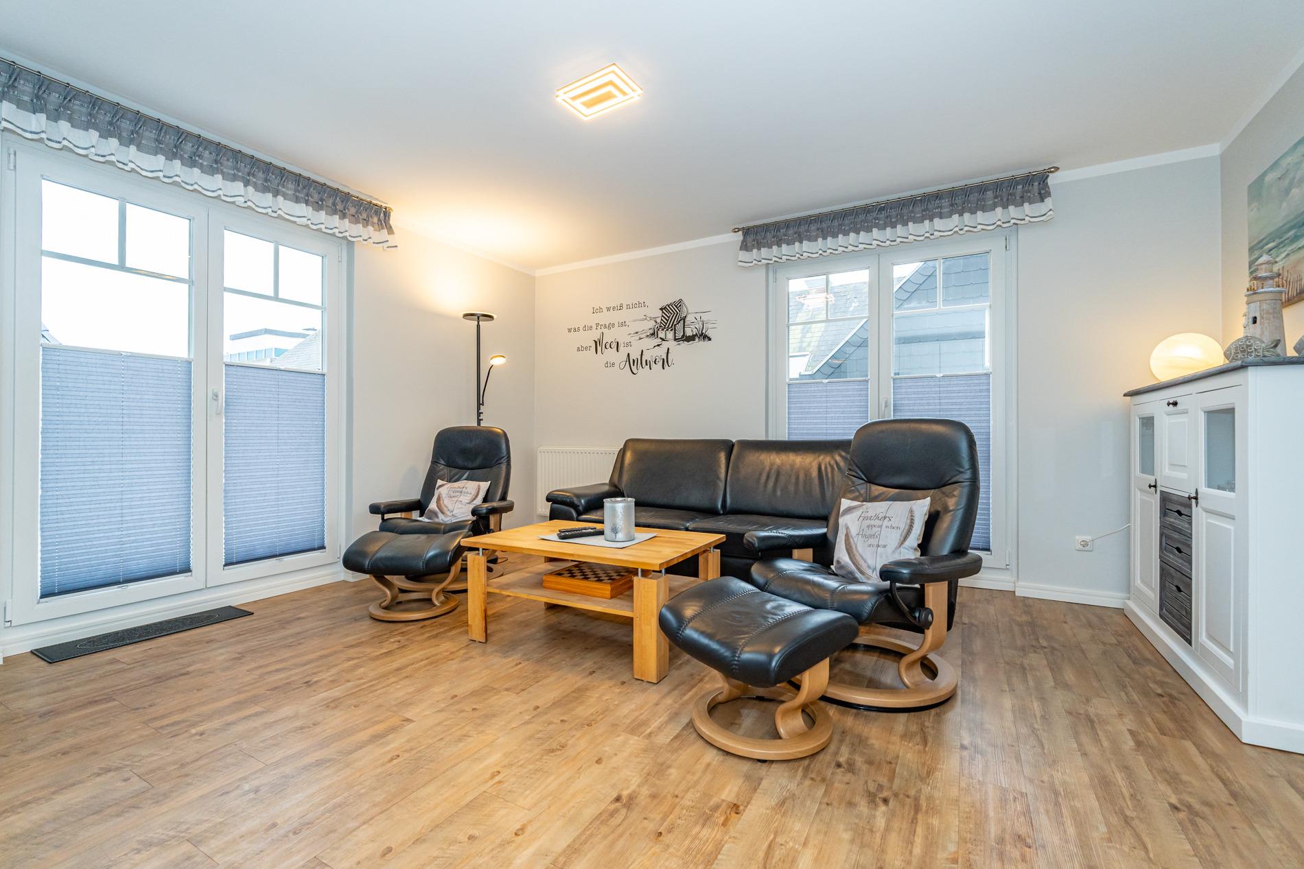 Vom einladenden Vorflur mit Garderobe gelangen Sie direkt in das helle Wohnzimmer mit Zugang zur Terrasse, in die separate Küche sowie in das praktische Gäste-WC. Der Wohnbereich ist mit einem modernen Designerboden in Holzoptik, einer hochwertigen Sitzgarnitur (2-Sitzer-Couch und Sessel), einem Essplatz sowie einem großen Kabel-Flachbild-TV (4K Ultra HD, Streaming-Dienste, Sprachsteuerung) und einem Radio ausgestattet – der perfekte Raum zum Entspannen.