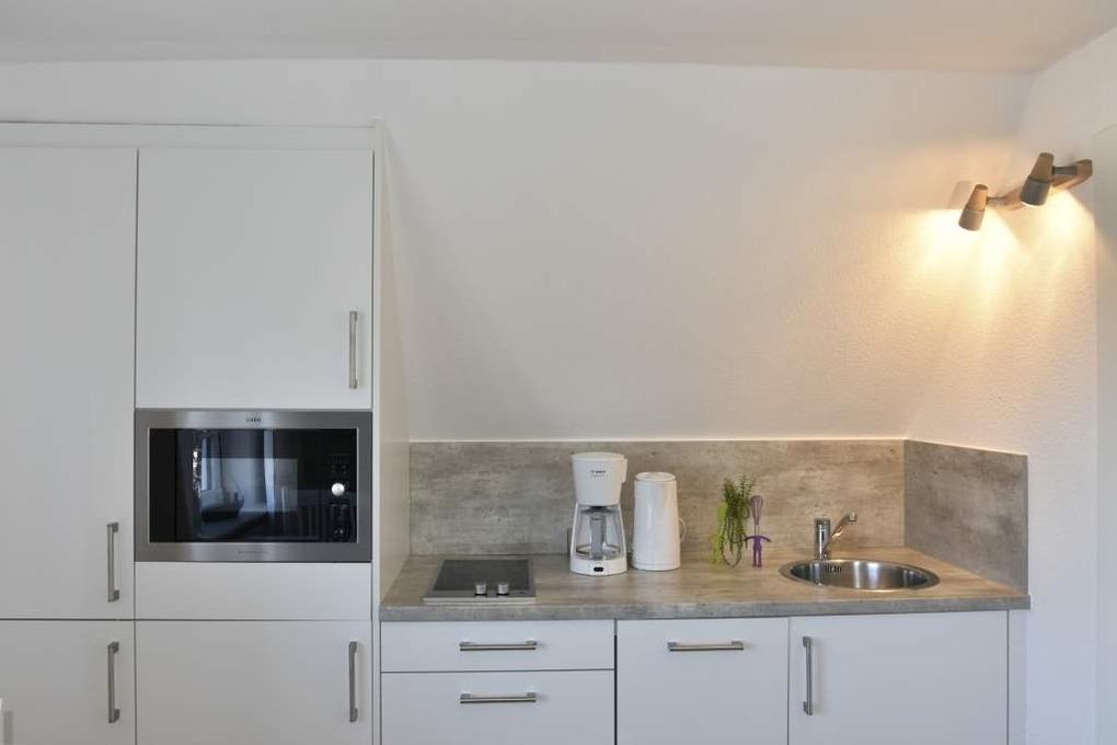Die Küchenzeile hat einen Ceranfeld mit 2 Kochfeldern, einen Geschirrspüler, eine Mikrowelle mit Grillfunktion und einen Kühlschrank mit 3-Sterne-Gefrierfach. Kaffeemaschine, Wasserkocher und Toaster gehören zur Grundausstattung.