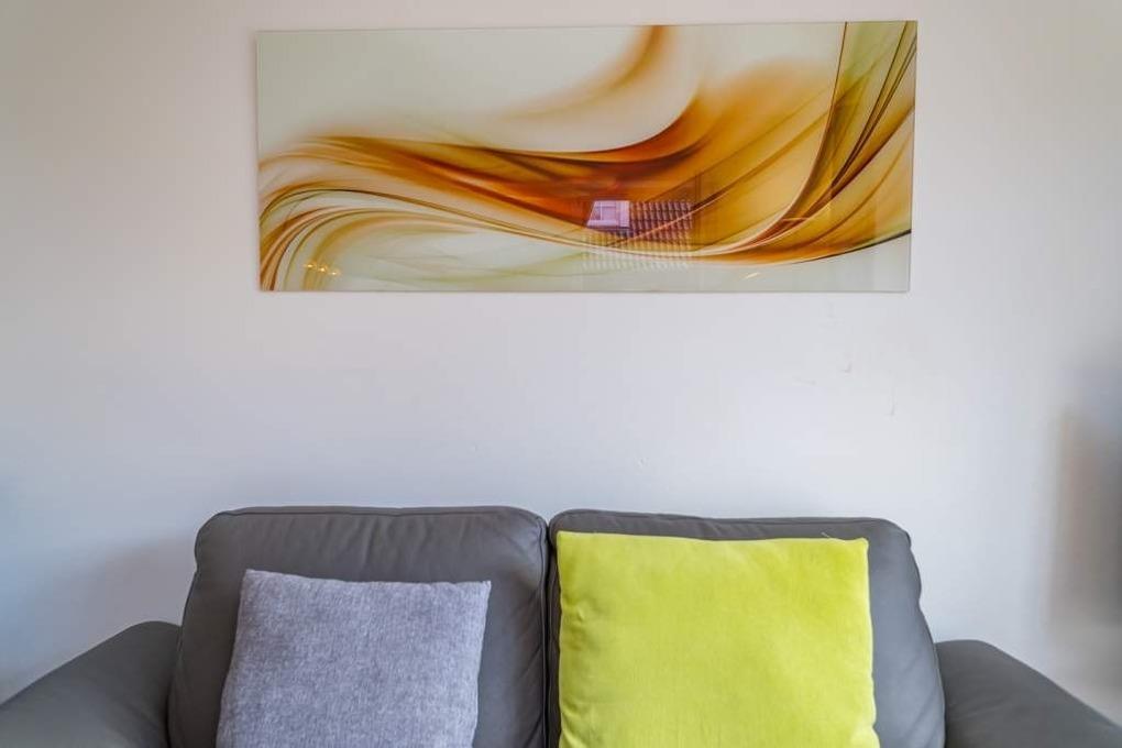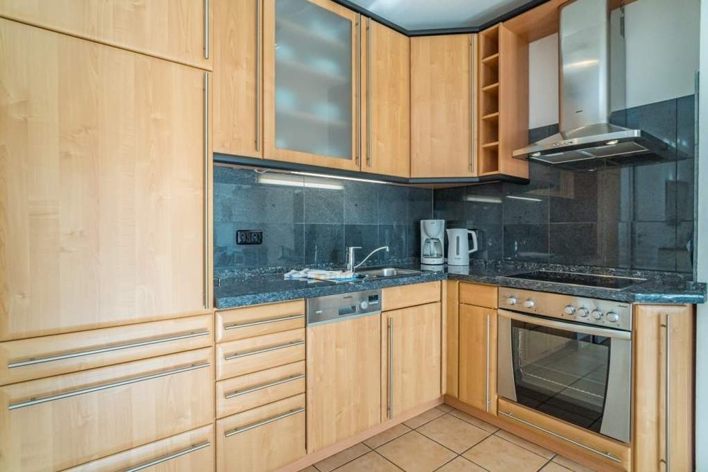 Die vollausgestattete Küche hat einen Geschirrspüler, ein Cerankochfeld mit Dunstabzugshaube, einen Backofen und einen Kühlschrank mit 3-Sterne-Gefrierfach.