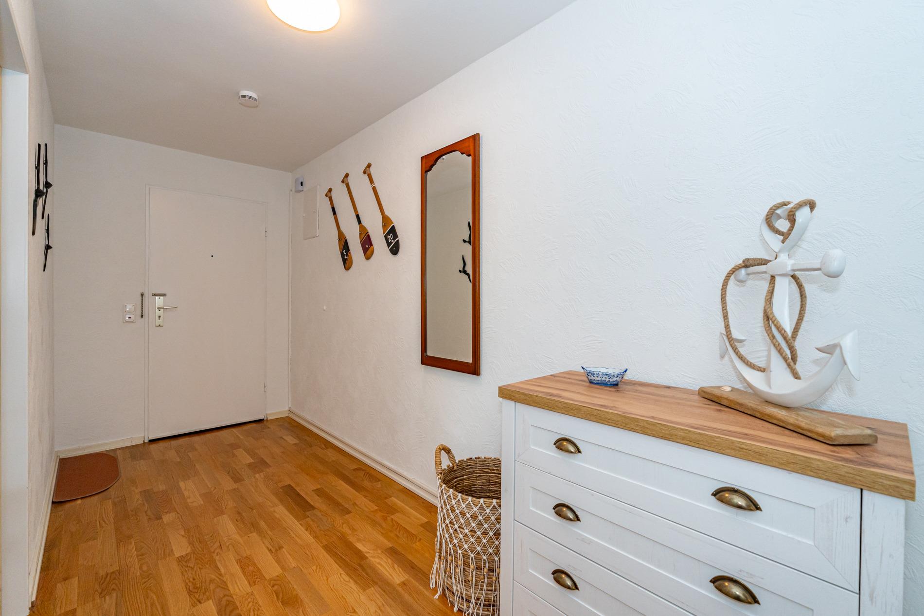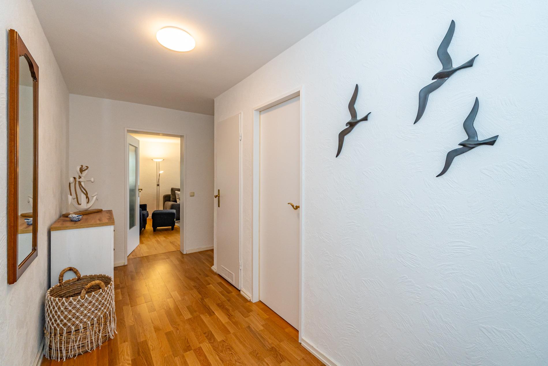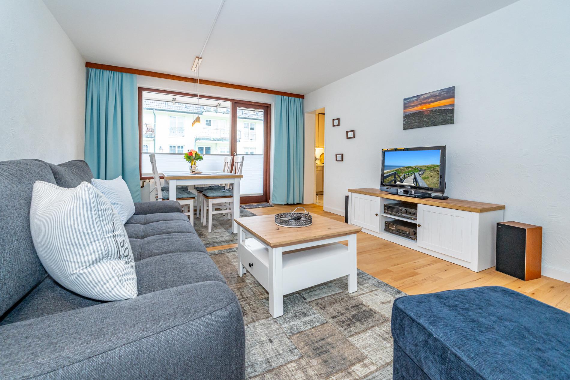Komfortable Ferienwohnung, ca. 56 qm im Hochparterre zur Landseite mit Ostloggia (Morgensonne, mit Balkonmöbeln und Auflagen) für max. 3 Personen. Von der großzügigen Diele aus gelangt man in das Wohnzimmer, das Schlafzimmer und das neuwertige Duschbad/WC. Der Wohnraum besteht aus einer Sitzgarnitur (3-Sitzer-Schlafcouch, Liegefläche ca. 1,40 x 2,00 m, einem bequemen Ohrensessel mit Fußhocker), einem Essplatz direkt am Fenster, Kabel-TV, Stereoanlage mit Radio, WLAN und Zugang zur Ostloggia. Die Einbauküche mit Fenster ist mit Cerankochfeld (4 Felder), Geschirrspüler, Backofen, Mikrowelle, Kühlschrank mit Gefrierfach und Senseo-Kaffeemaschine ausgestattet. Eine Filterkaffeemaschine, Wasserkocher und Toaster gehören zur Grundausstattung. Das separate Schlafzimmer hat ein Doppelbett (1,80 x 2,00 m, mit guten Einzelmatratzen), 2 Nachttische und einen Kleiderschrank mit Zugang zum zweiten Balkon. Im Bad befinden sich eine großzügige Dusche mit extraflachem Einstieg, ein Waschtisch, Handtuchtrockner, Fön, Kosmetikspiegel und WC. An Extras stehen ein Bügelbrett und Bügeleisen zur Verfügung.