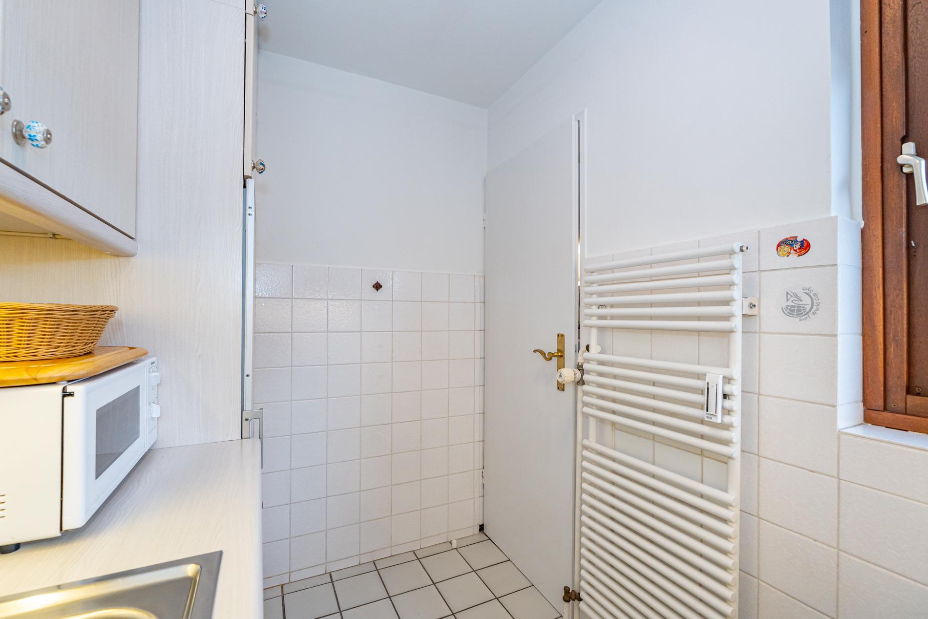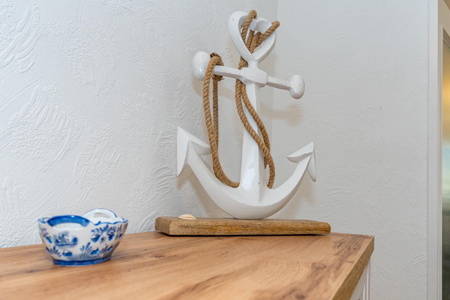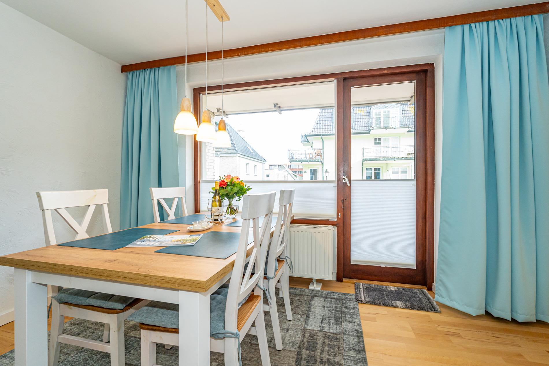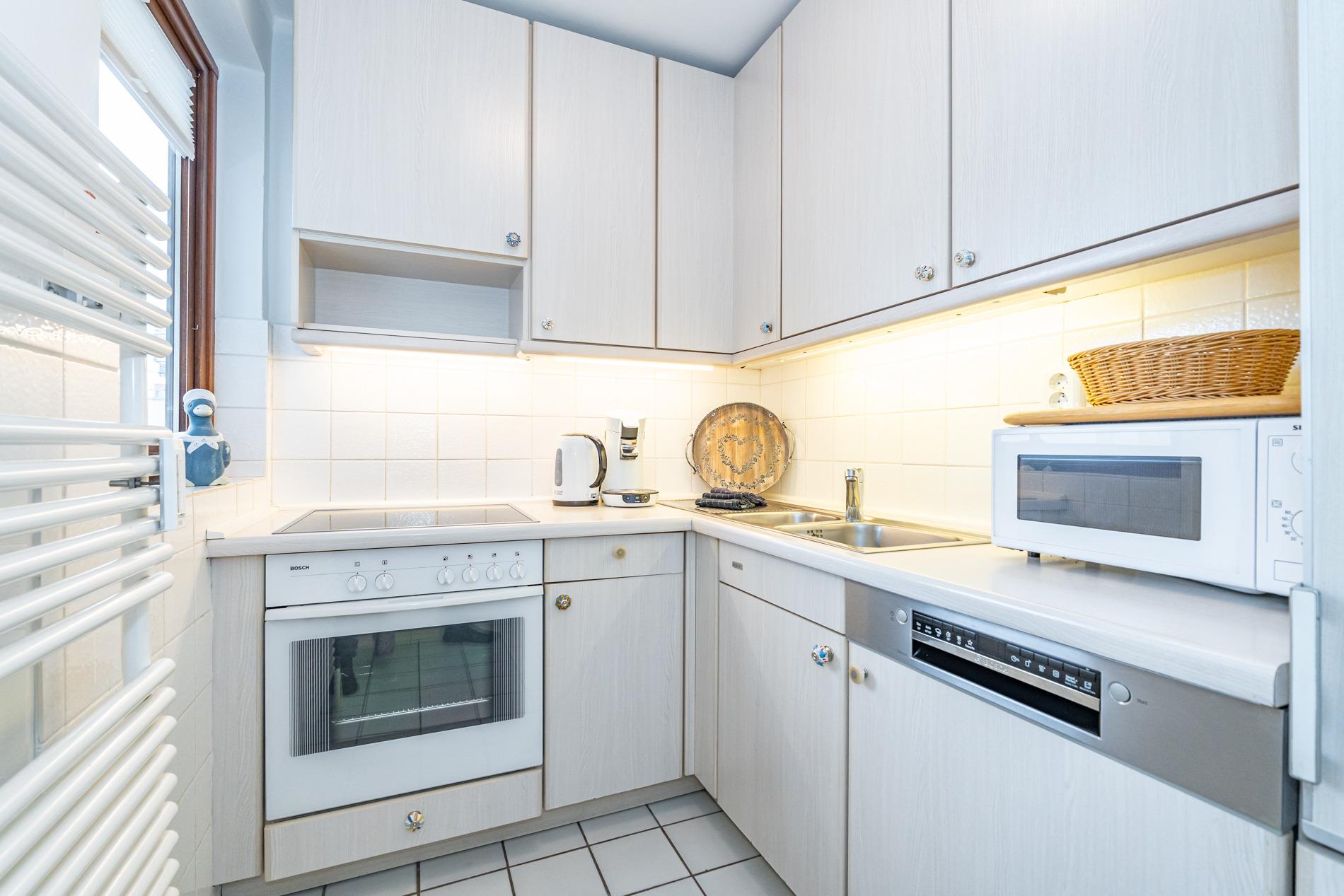 Komfortable Ferienwohnung, ca. 56 qm im Hochparterre zur Landseite mit Ostloggia (Morgensonne, mit Balkonmöbeln und Auflagen) für max. 3 Personen. Von der großzügigen Diele aus gelangt man in das Wohnzimmer, das Schlafzimmer und das neuwertige Duschbad/WC. Der Wohnraum besteht aus einer Sitzgarnitur (3-Sitzer-Schlafcouch, Liegefläche ca. 1,40 x 2,00 m, einem bequemen Ohrensessel mit Fußhocker), einem Essplatz direkt am Fenster, Kabel-TV, Stereoanlage mit Radio, WLAN und Zugang zur Ostloggia. Die Einbauküche mit Fenster ist mit Cerankochfeld (4 Felder), Geschirrspüler, Backofen, Mikrowelle, Kühlschrank mit Gefrierfach und Senseo-Kaffeemaschine ausgestattet. Eine Filterkaffeemaschine, Wasserkocher und Toaster gehören zur Grundausstattung. Das separate Schlafzimmer hat ein Doppelbett (1,80 x 2,00 m, mit guten Einzelmatratzen), 2 Nachttische und einen Kleiderschrank mit Zugang zum zweiten Balkon. Im Bad befinden sich eine großzügige Dusche mit extraflachem Einstieg, ein Waschtisch, Handtuchtrockner, Fön, Kosmetikspiegel und WC. An Extras stehen ein Bügelbrett und Bügeleisen zur Verfügung.