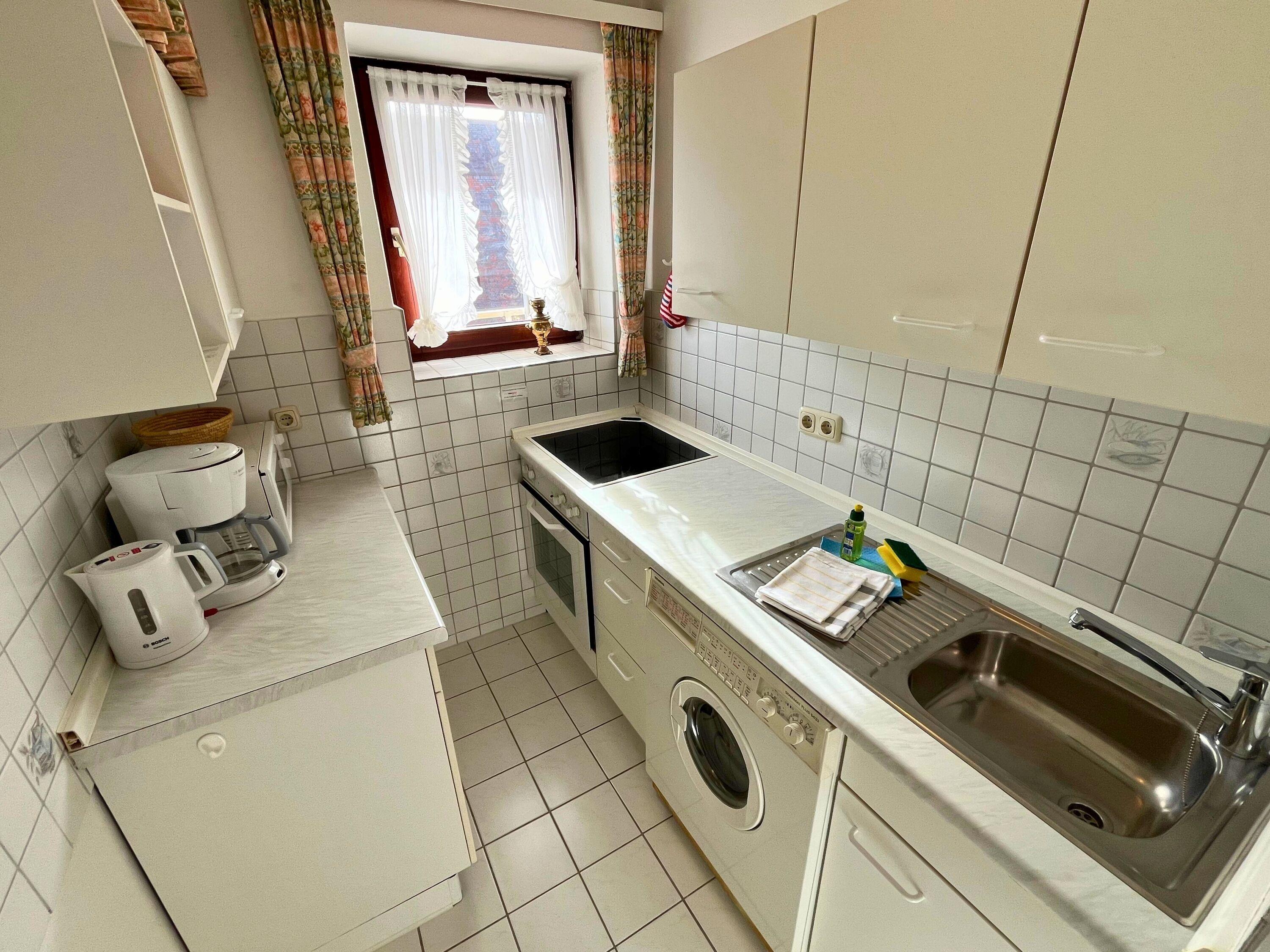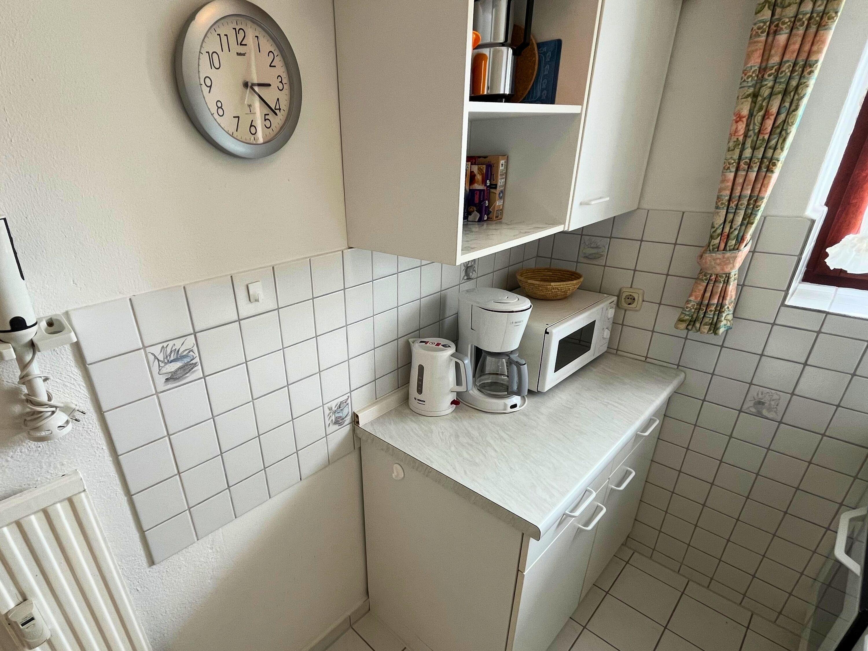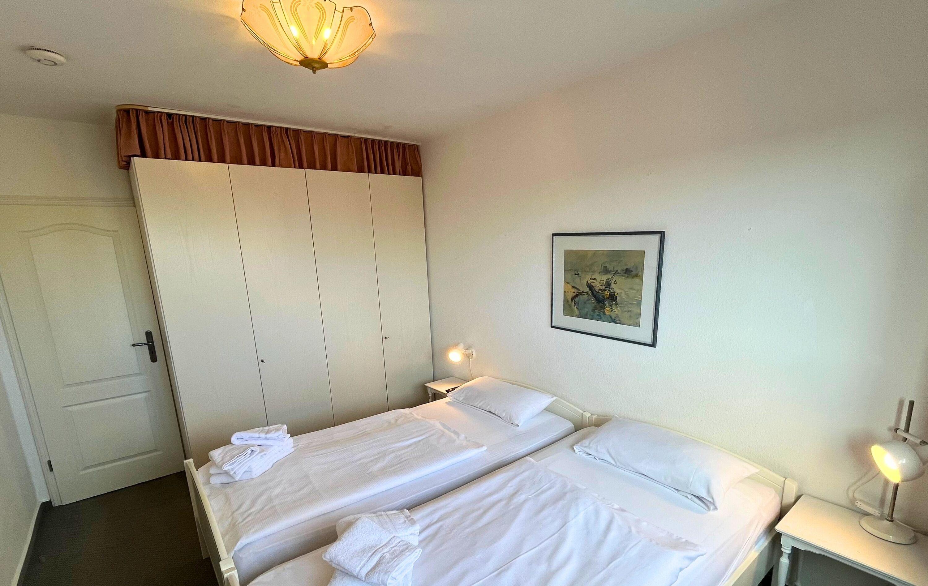 Das separate Schlafzimmer liegt zur Ostseite hin und verfügt über ein Doppelbett mit zwei Einzelmatratzen – ideal für erholsamen Schlaf. Die Küche ist voll ausgestattet und bietet neben einem Backofen und einer Mikrowelle auch eine Waschmaschine mit integriertem Trockner. Ein großer Kühlschrank mit separatem Gefrierfach sorgt für ausreichend Stauraum. Zur Grundausstattung gehören außerdem eine Kaffeemaschine, ein Wasserkocher und ein Toaster.