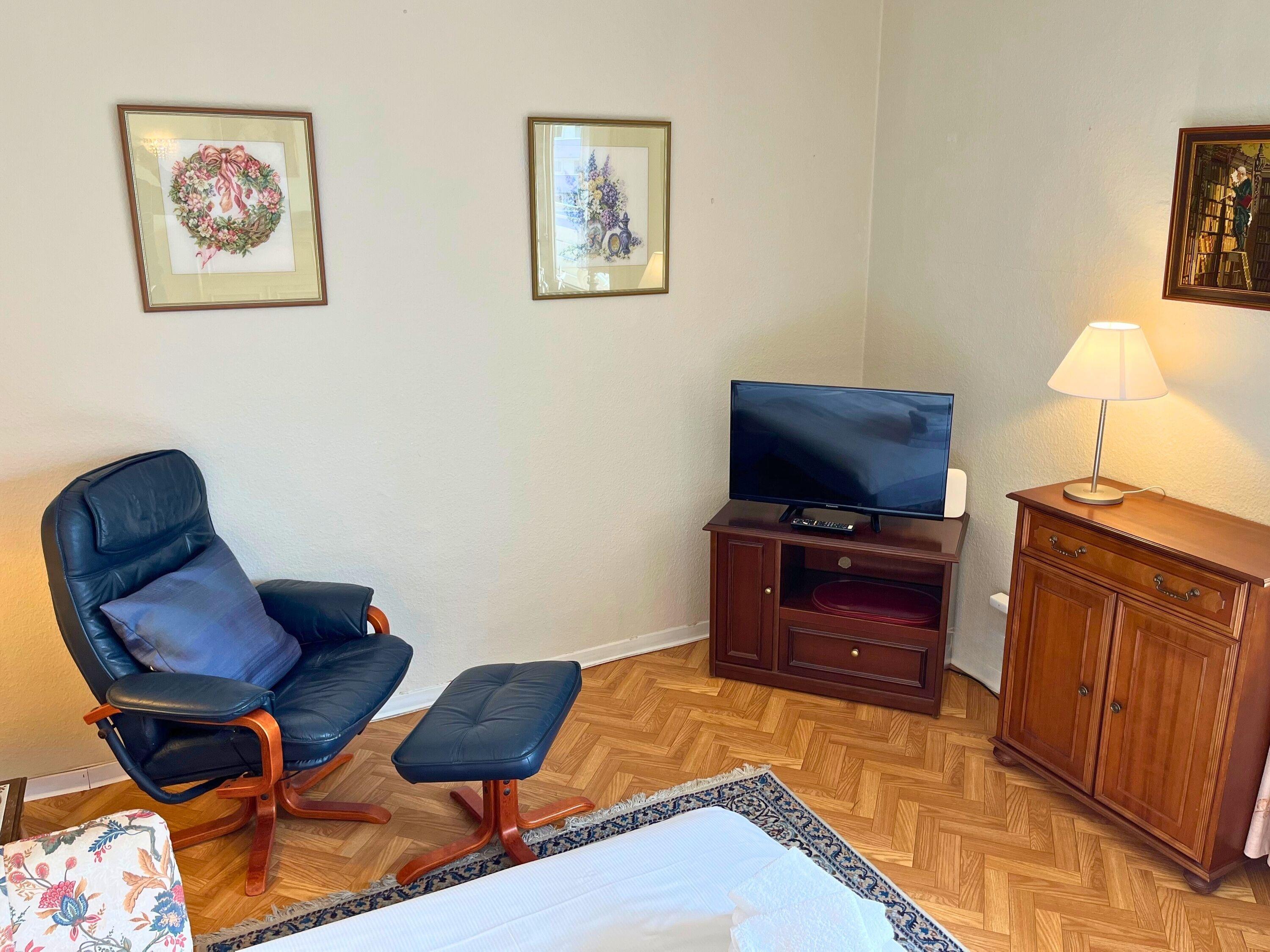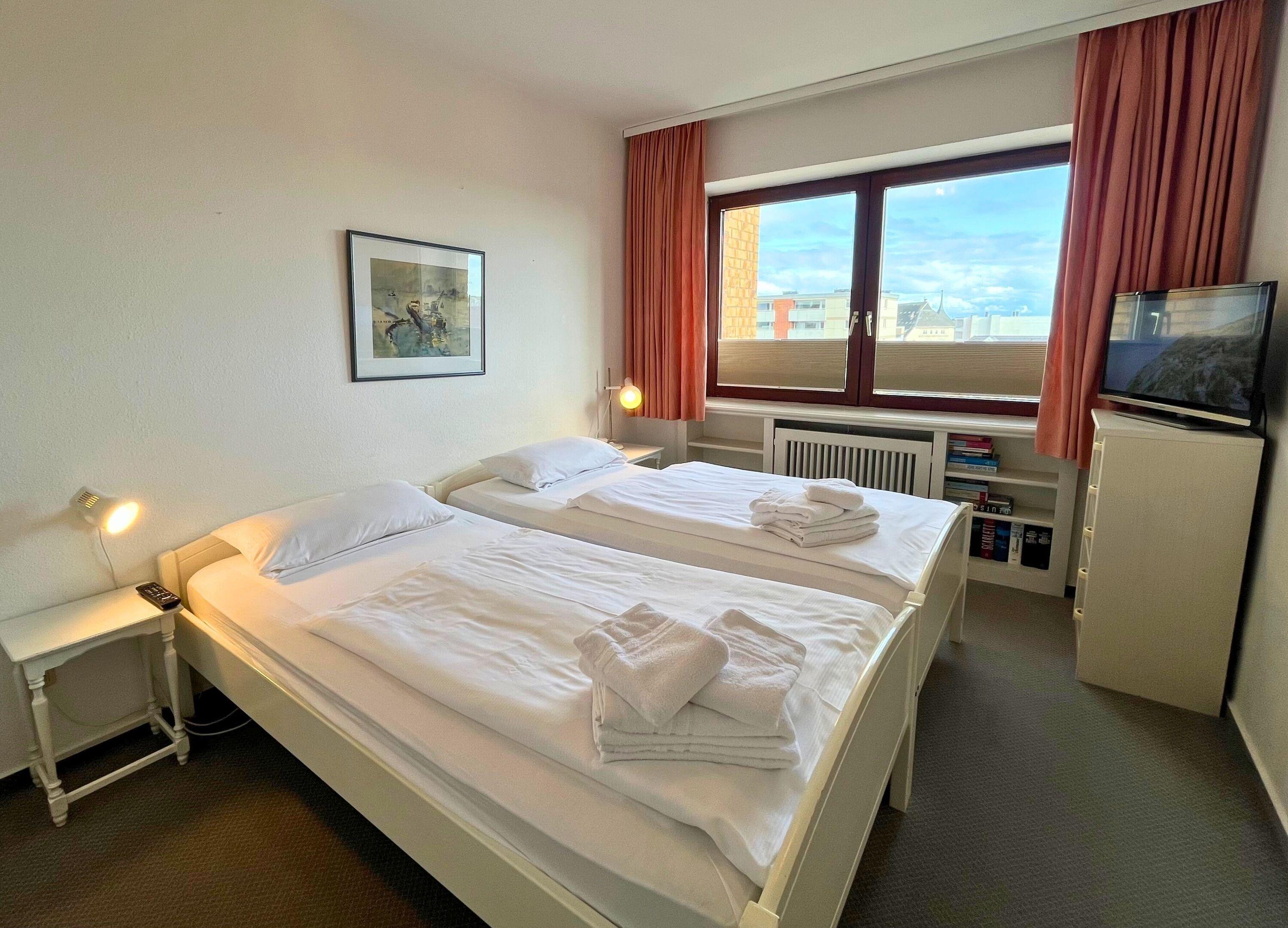 Diese gepflegte 2-Zimmer-Nichtraucher-Ferienwohnung in der 4. Etage bietet auf ca. 48?m² ausreichend Platz für bis zu vier Personen. Der Wohnbereich ist mit einer komfortablen Doppelschlafcouch, einem Essplatz sowie Kabel-TV, DVD-Player, Radio mit CD-Funktion und einem Telefon ausgestattet. WLAN steht selbstverständlich kostenfrei zur Verfügung. Vom Wohnzimmer aus gelangen Sie auf den sonnigen Südbalkon, der zum Verweilen und Entspannen einlädt.