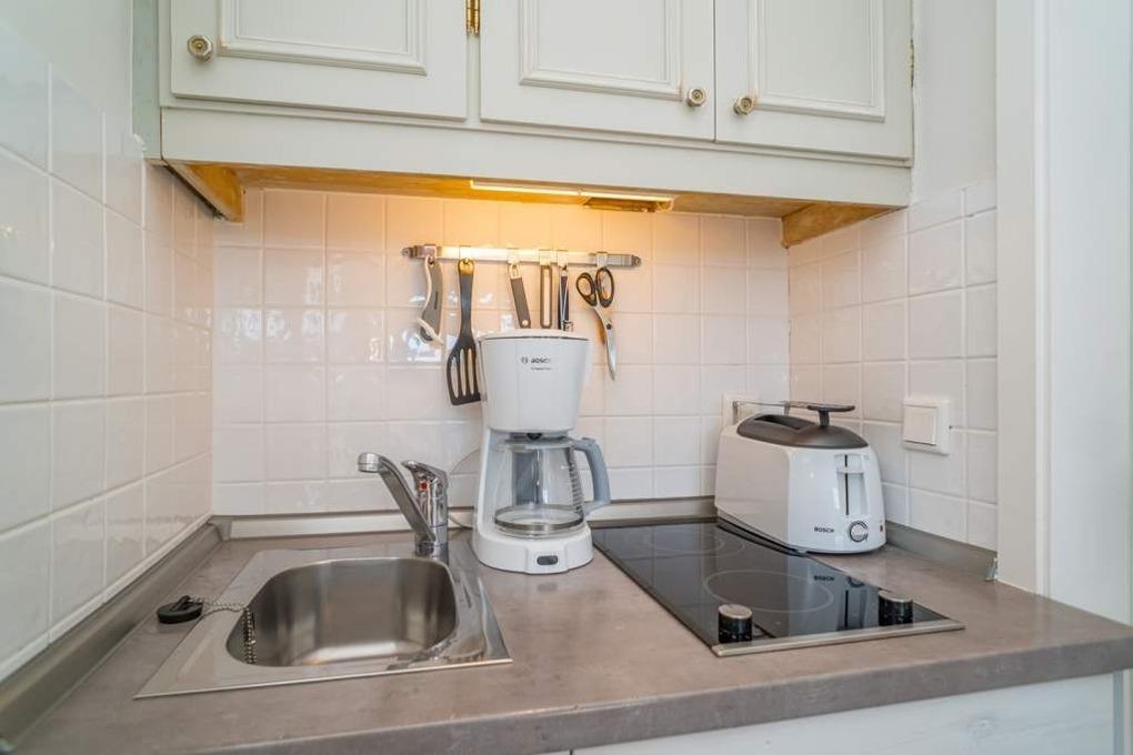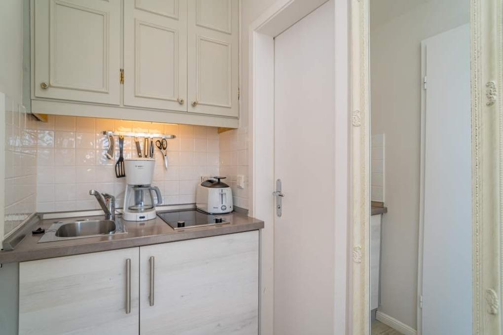 Die kleine Küchenzeile hat ein Ceranfeld mit 2 Kochfeldern und einen Kühlschrank. Kaffeemaschine, Wasserkocher und Toaster gehören zur Grundausstattung.