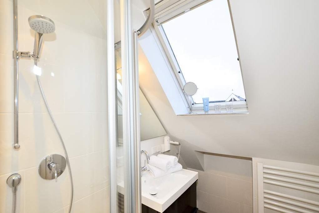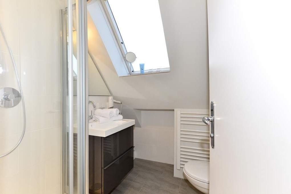 Im Bad befinden sich eine Dusche, ein WC und ein Waschtisch.