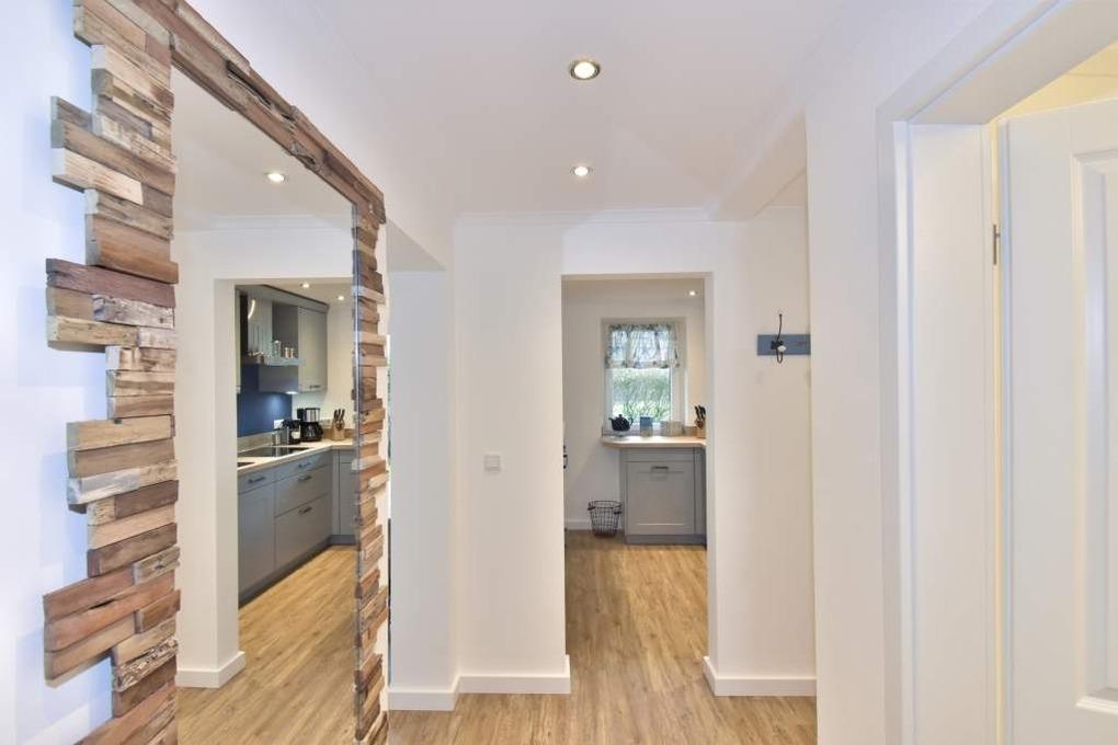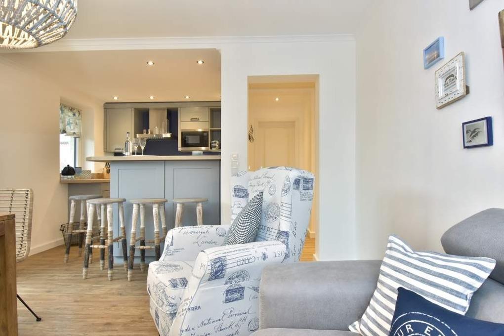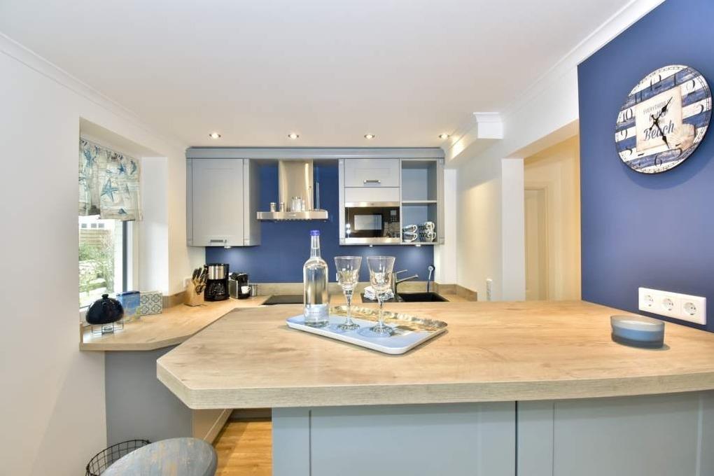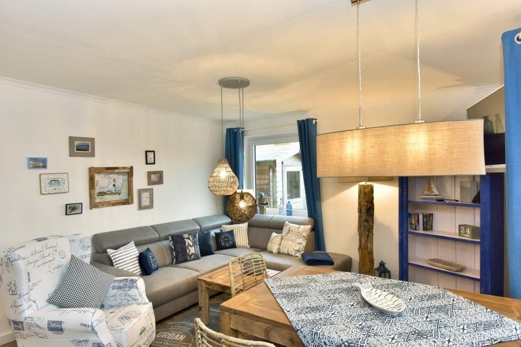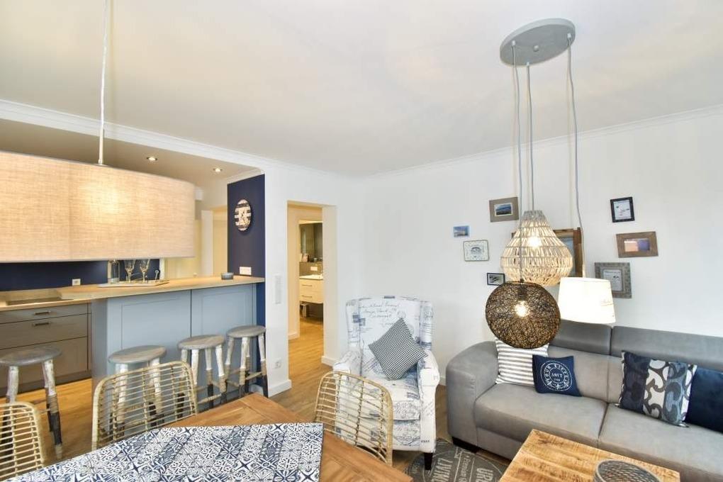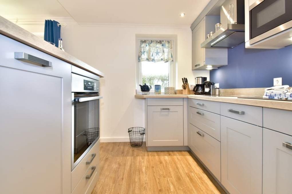 Vom Vorflur gelangt man direkt ins neue Duschbad/WC (extraflacher Duscheinstieg, Handtuchtrockner, Bidet, Waschtisch [&] Föhn) und ein paar Schritte weiter in den gemütlichen Wohnraum (Ecksofa, verlängerbarer Esstisch, Kinderstuhl, Kabel-Flachbild-TV, WLAN [&] Internet-Radio [&] kostenfreie Telefonie ins dt. Festnetz (o. Gewähr)). Der mit einer großzügigen Theke anschließende, offene Küchenbereich lädt auch mal zur Zubereitung eines umfangreicheren Menüs ein (Geschirrspüler, Backofen-/Mikrowellenkombination, 4-flammiges Ceran-Kochfeld, großer Kühlschrank mit 3*-Gefrierfach) und hält eine Kaffee- [&] Nespresso-Maschine, Wasser- [&] Eierkocher sowie einen Toaster als Grundausstattung für Sie bereit.