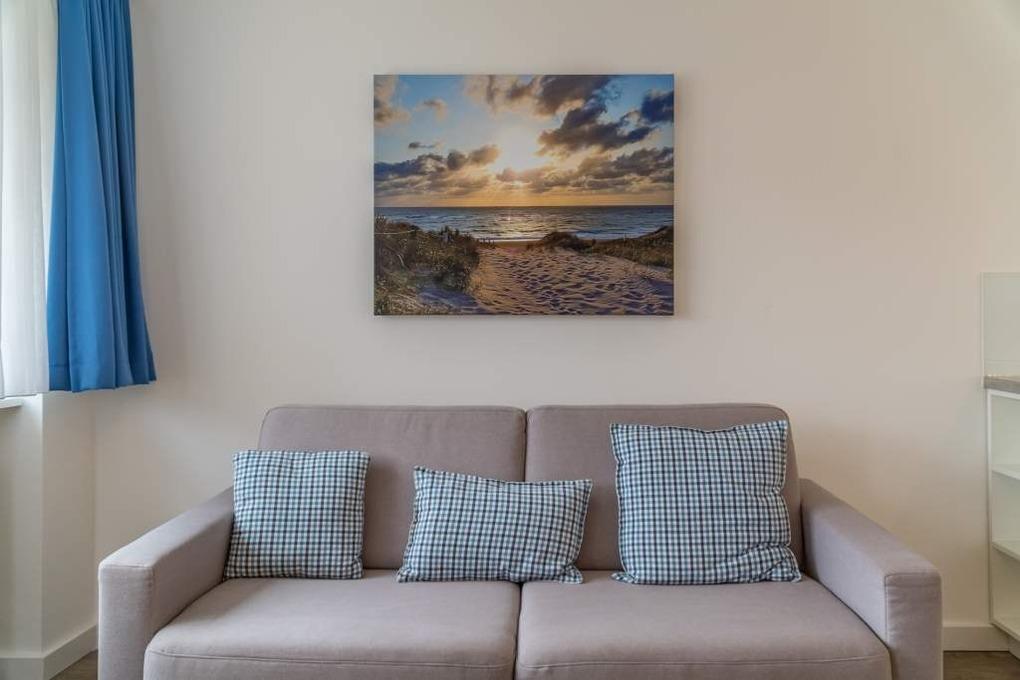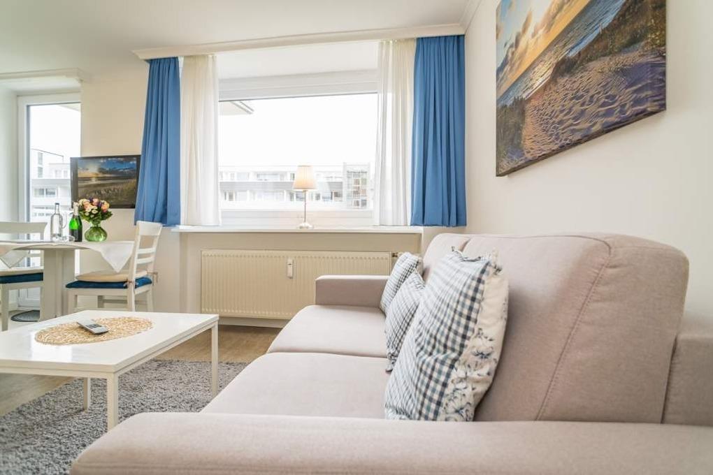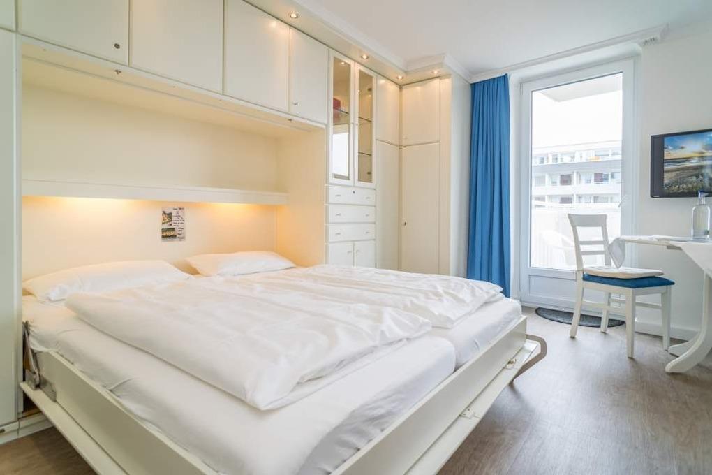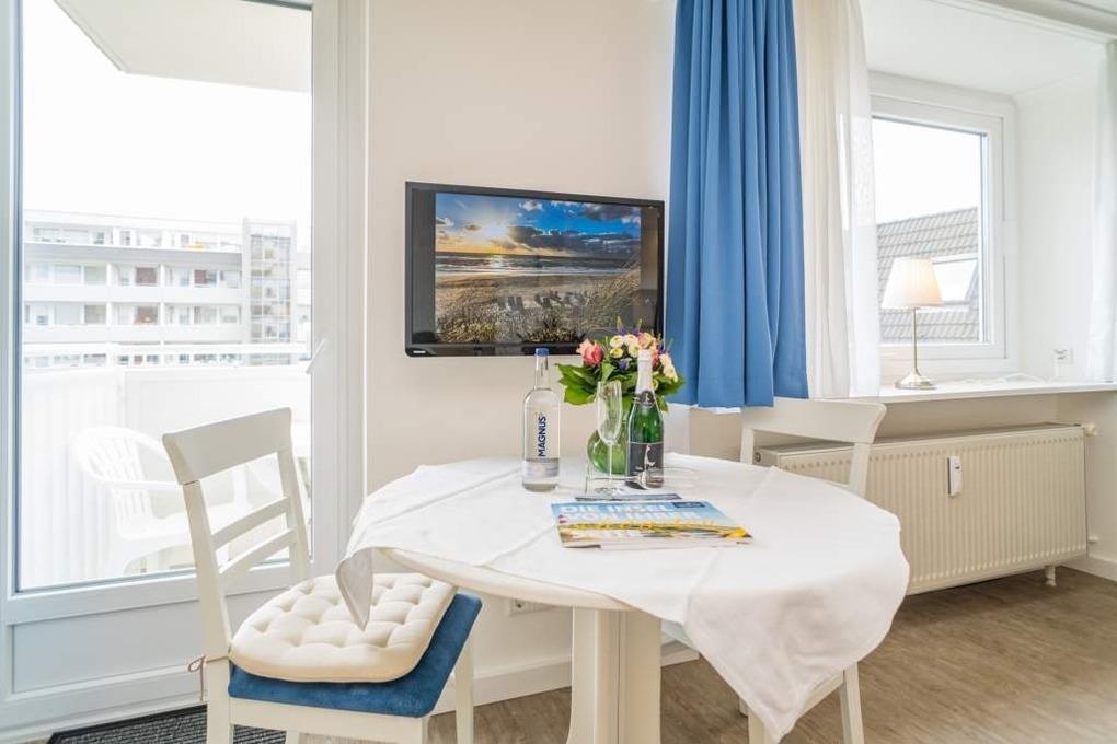 1-Zimmer-Nichtraucher-Ferienwohnung (ca. 32 qm) zur Westseite in der 3. Etage mit kleinem Meerblick und Westbalkon.