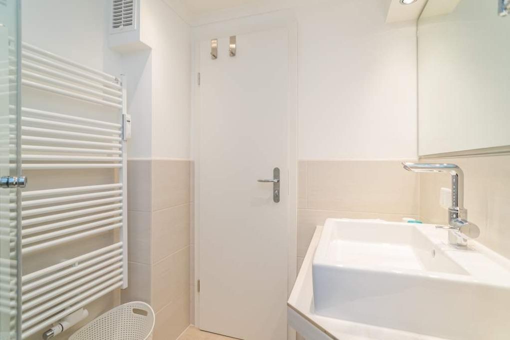 Die Wohnung hat ein neues Duschbad/WC mit Waschtisch, Waschmaschine und Fön.