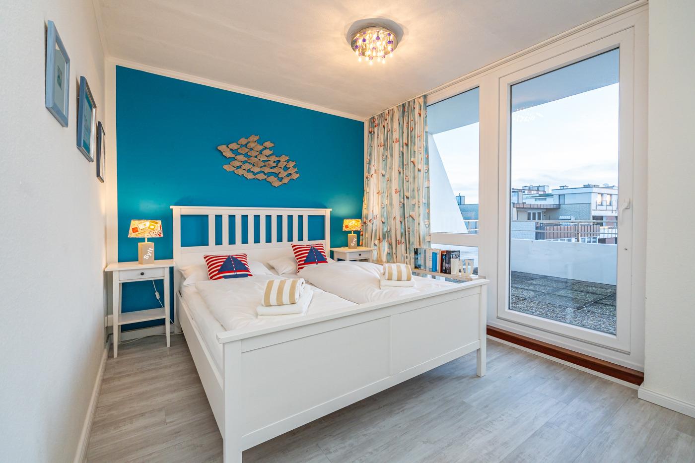Es besteht aus 3 Zimmern für max. 3-4 Personen und hat eine Wohnfläche von ca. 75 m² im Staffelgeschoss des Hauses (wie 4. Etage). Die großzügige, umlaufende Dachterrasse mit Strandkorb (für 2 Personen) und Terrassenmöbeln bietet nahezu aus jeder Perspektive einen herrlichen Blick auf die Nordsee und die Dünen.