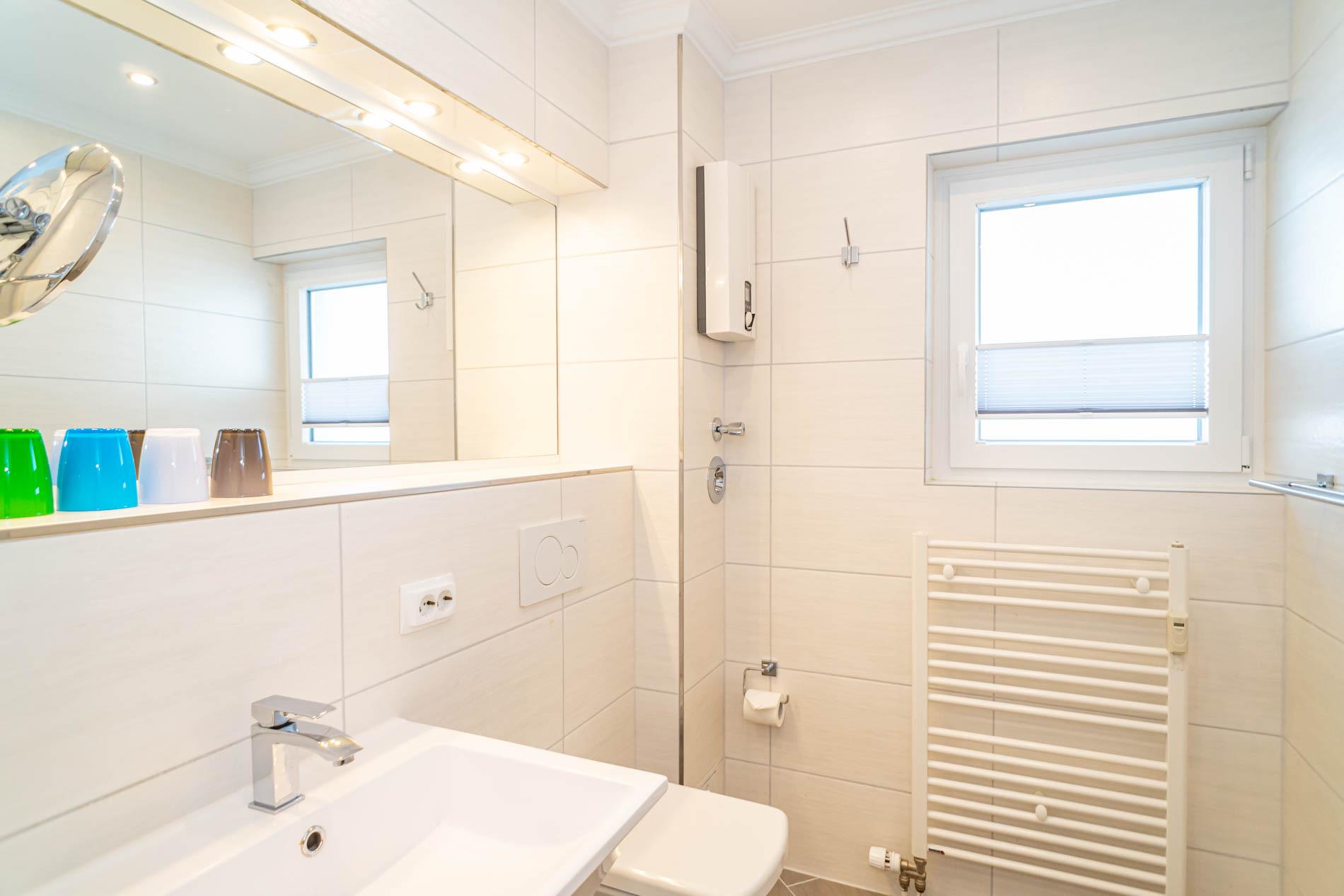 Im modernen Badezimmer mit Fenster[nbsp] befinden sich eine Dusche mit extraflachem Einstieg, Waschtisch, Handtuchtrockner, Fön und WC.