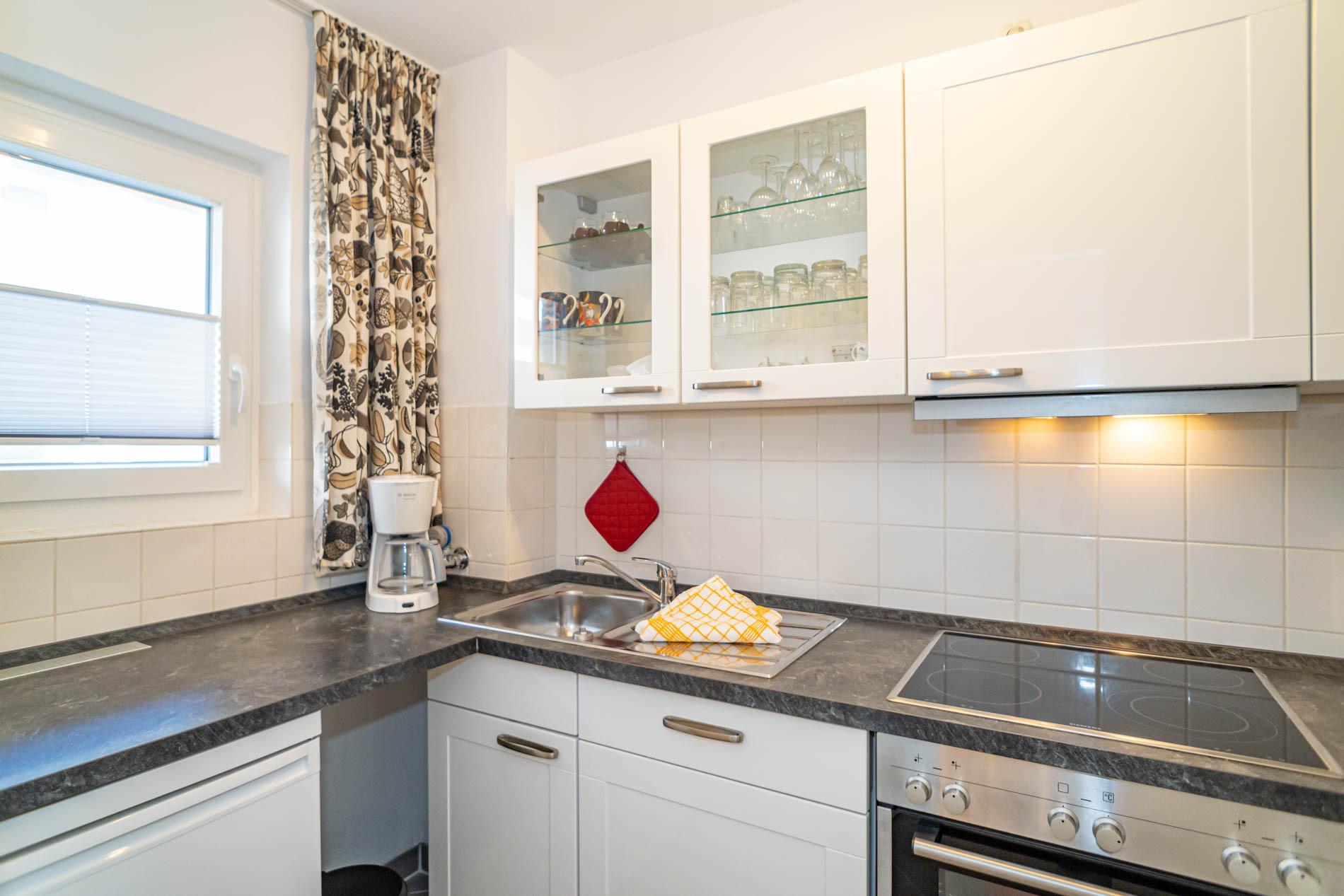 Moderne Einbauküche mit Geschirrspüler, Backofen, Ceranfeld und Kühlschrank mit 3-Sterne-Gefrierfach.