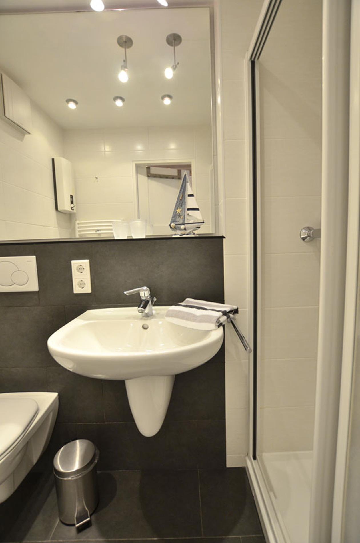 Im neuen, hochwertigen Bad befindet sich eine superflache Duschanlage, ein WC, ein Waschtisch, ein Handtuchtrockner und ein Fön.